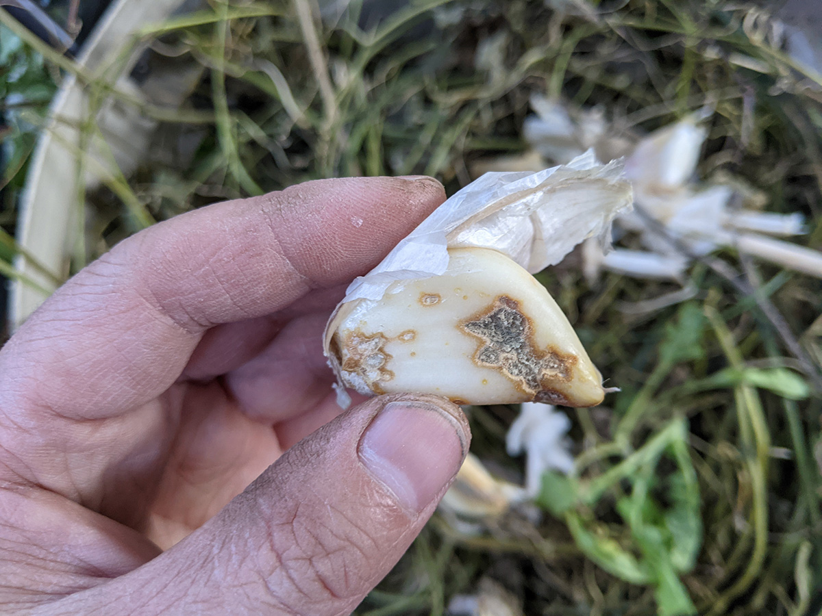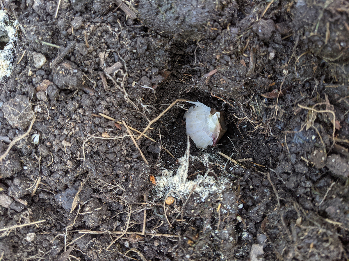 my mother got my 2nd aunt to buy some hardneck garlics from her organic grocery shop, to replace the largest red korean garlics my mother ended up eating after not realizing i was saving them for planting. these store-bought ones look to be elephant garlics judging how big they were. originally there was just 2, but my father ate one, so my mother asked my 2nd aunt to buy some more, so now i had 3. the cloves were really big, so each head only had a few. one of the garlics had turned moldy, so in the end i just had 9 cloves to plant. i planted them in the RB0 garlic bed.