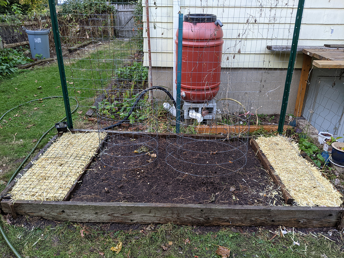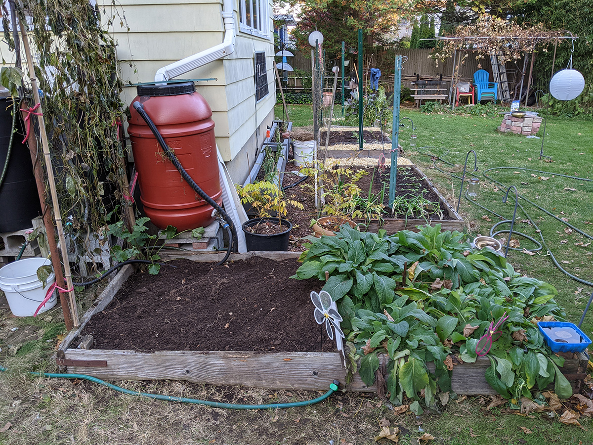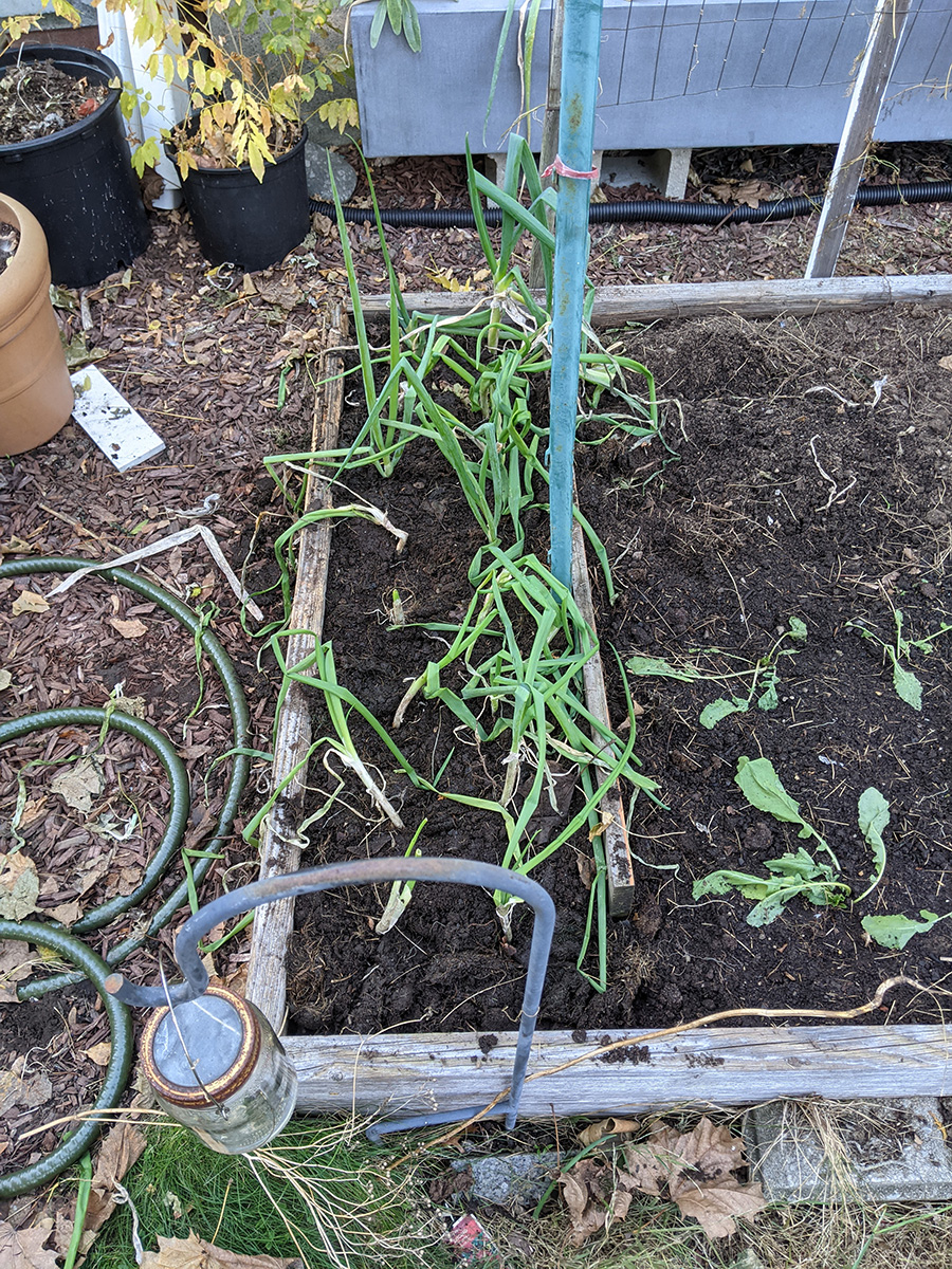so the big push today was to get the raised beds ready for garlic planting. in seasons past i'd plant my garlics in mid-october, once we get a touch of frost and the weather starts feeling cold. but because we've had a warm october, i didn't plant until now, which is sort of late in the season. the garlics need at least 4 weeks of non-freezing soil weather to establish. the advantage of starting a bit later is so the garlics don't sprout, which happened in years past because i planted too early. there's kind of a guessing game to figure out the optimal garlic planting time.