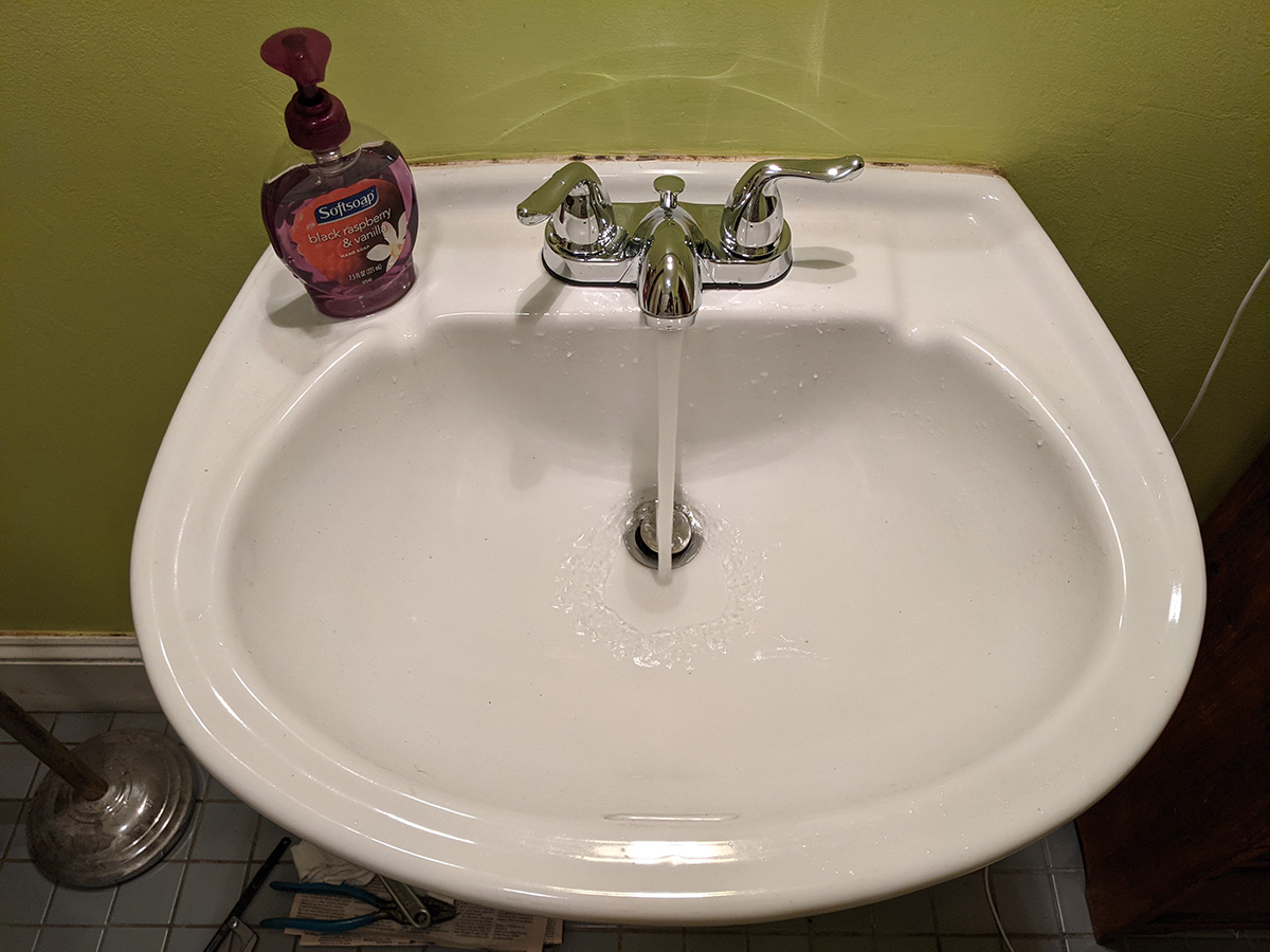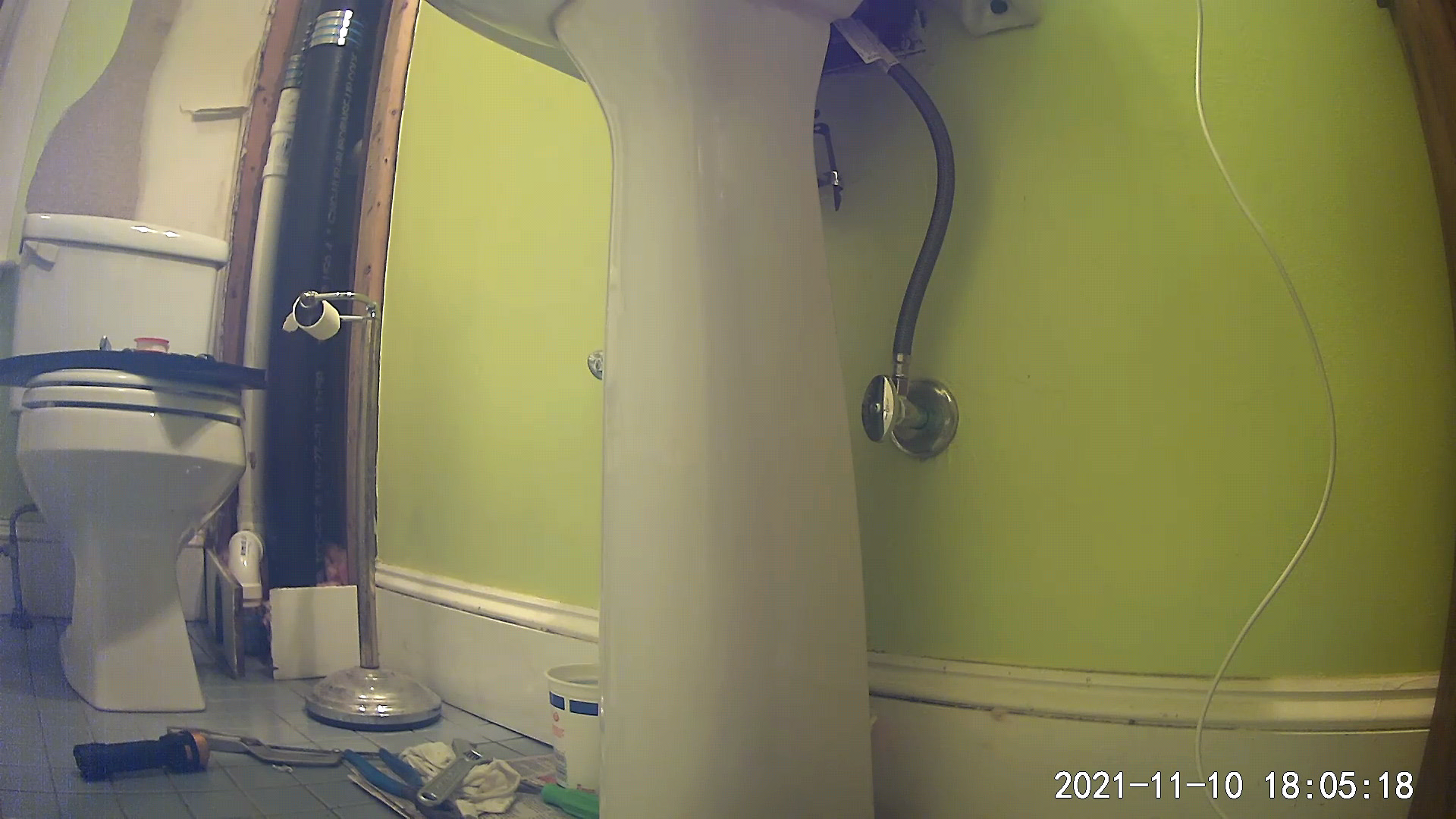 it was finally the moment of truth. i set up my webcam so i could watch the bathroom sink as i turned on the water from the basement. first the hot water. from the webcam i didn't see any leaking, but i could hear water running through the drainage pipe, so i ran upstairs to see what was going on.