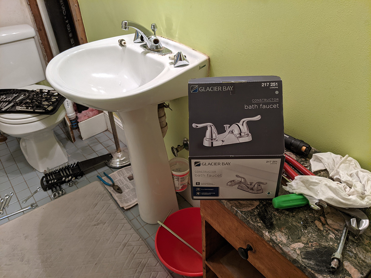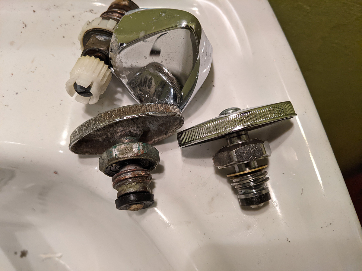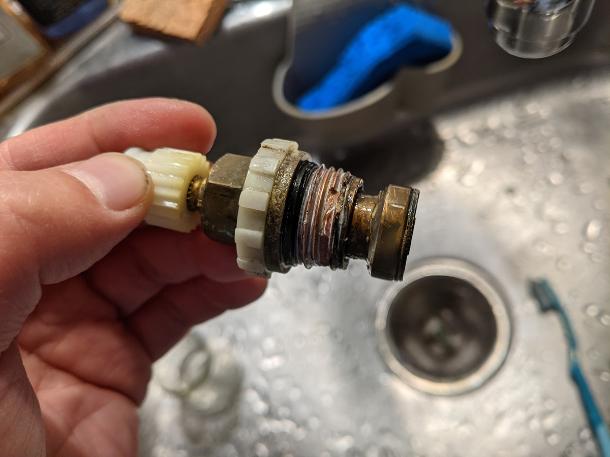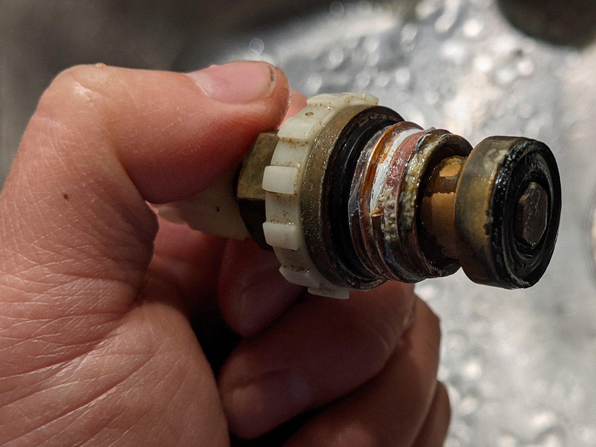 the problem was the threads on the cold water cartridge had completely pulverized. i didn't even know brass metal could do that. without the threads, i couldn't put the cartridge back into the faucet, which meant i couldn't turn on my water. i figured one day i'd have to replace the sink faucet entirely, i just didn't realize that day was today. it was an emergency, because unless i'm able to install a working faucet, i couldn't turn my water back on.