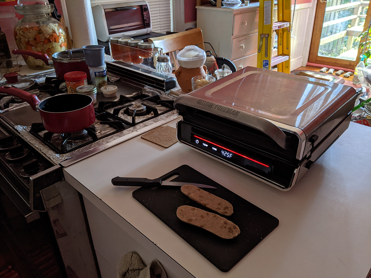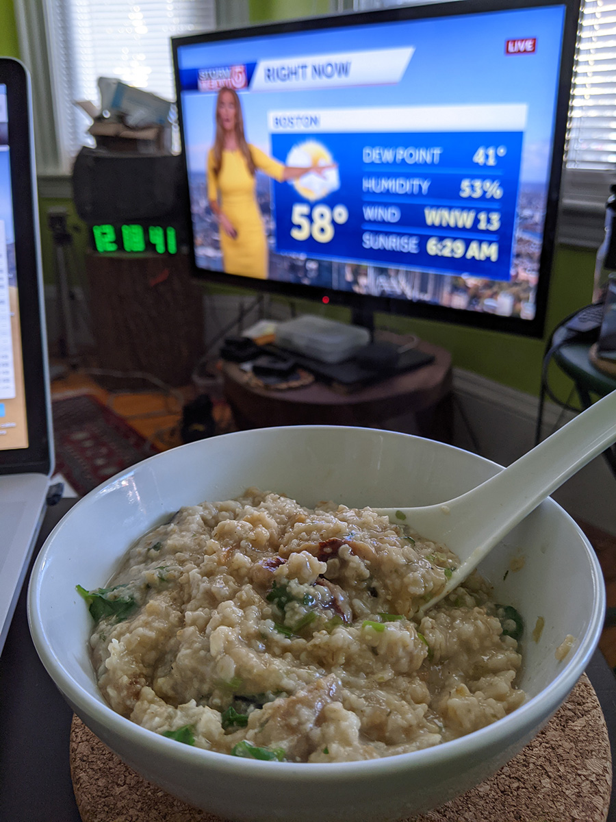 the day didn't start out so dramatically. i had savory oatmeal for lunch, grilled some chicken sausages on the smokeless foreman. my water portion wasn't correct and my oatmeal turned out very pasty instead of soupy, which is what i like.