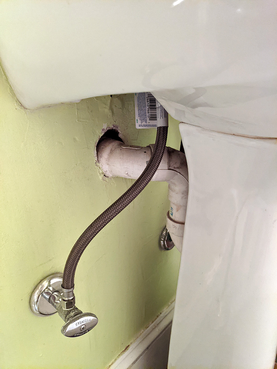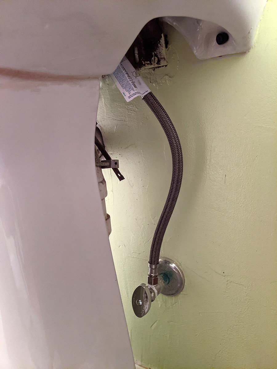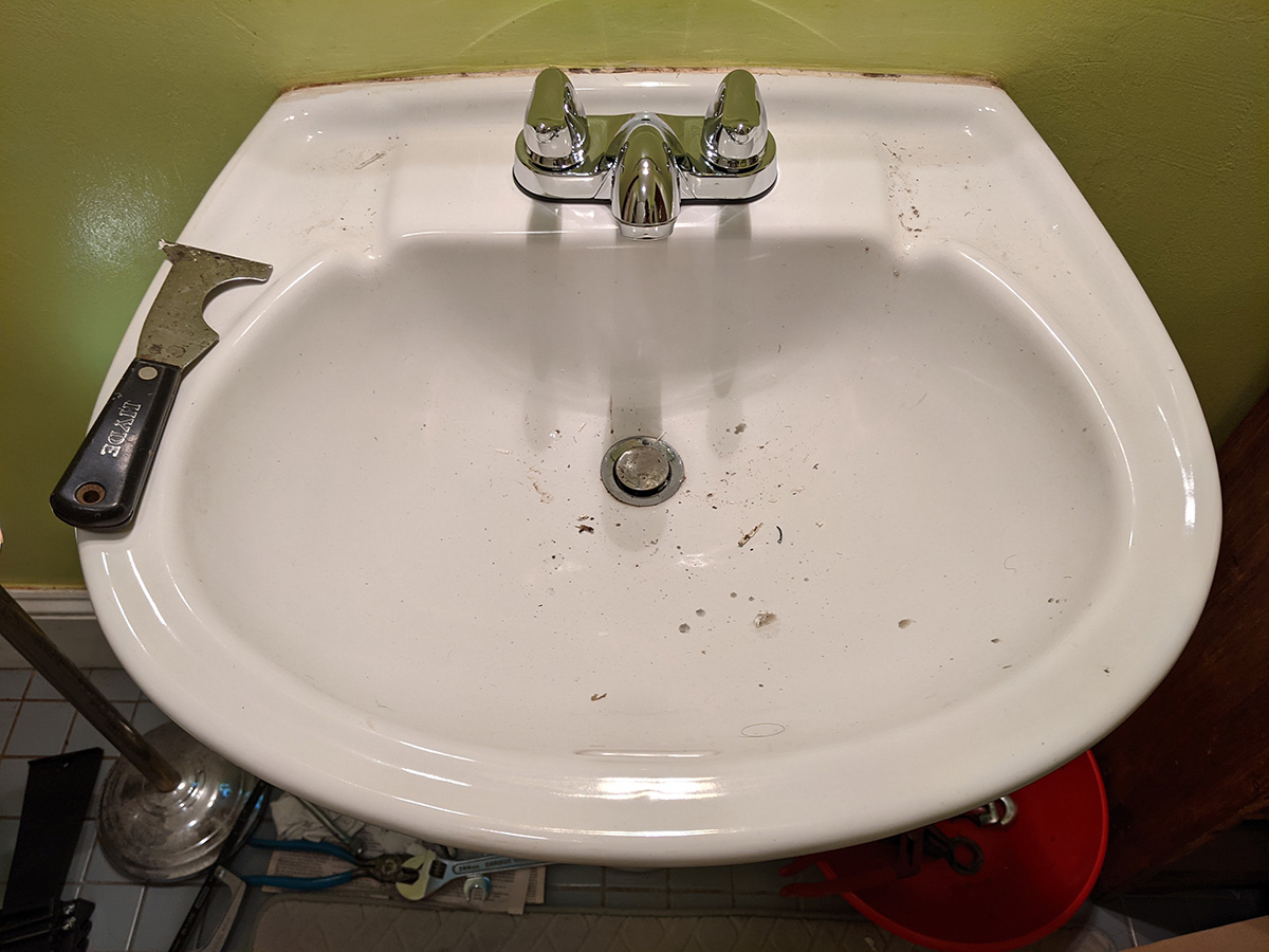 first i made sure i could remove the old faucet. i managed to disconnect it from the water supply lines (running downstairs and turning off my cold and hot water). i thought i'd have a hard time disengaging the lockring securing the faucet to the porcelain sink, and was trying to work my basin wrench to loosen it, until i discovered the lockring was already loose, and i could remove it by hand (i must've loosened it already back when i first got the basin wrench in june 2015). that was enough to loosen the faucet assembly; i didn't remove it just yet, figured i'd do that when i got back.