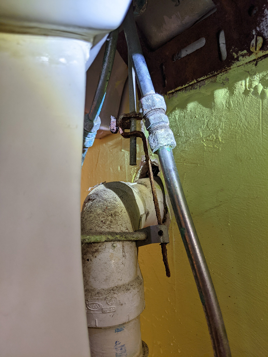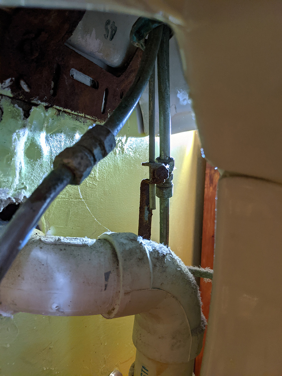 next up was removing the old faucet assembly. this was an old style assembly, so it used solid pipes. i removed short segments of pipe connecting the faucet to the supply lines, but there was still a lot of pipes snaking out from the assembly. the problem was unless i can reduce these pipes to something smaller, i couldn't remove the lockring, and therefore couldn't remove the faucet from the sink. i kept trying to unscrew the pipe segments but they just wouldn't budge. plus i was working at an awkward angle, underneath the sink with very little clearance. i discovered the pipes weren't entirely solid, and that i could bent them somewhat. so i ended up bending a segment of pipe until it broke, which finally gave me enough clearance to remove the old faucet assembly.
