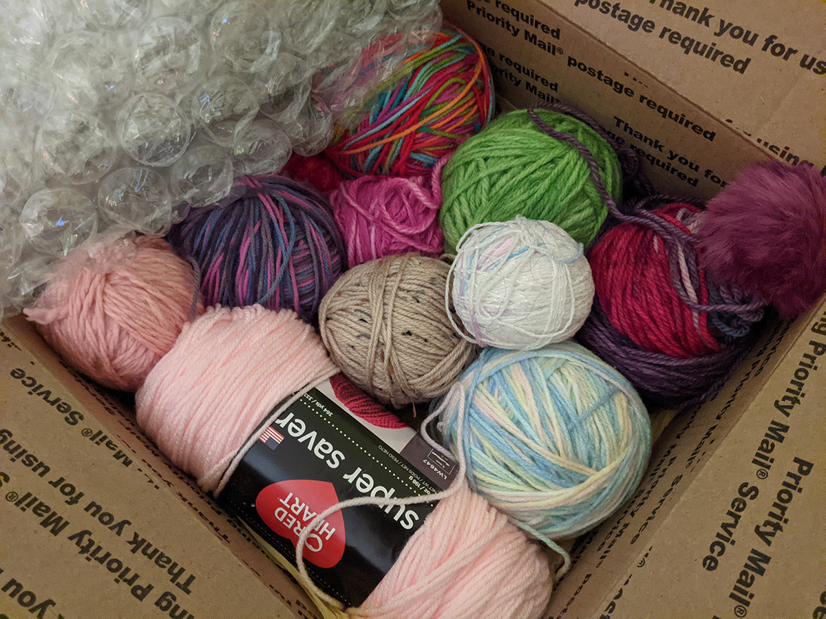 when i got back home from home depot, a large box was waiting on my doorstep, a present from maureen. seems like she was cleaning her house and sent me a bunch of surplus yarn, along with some pakistani chili milli hot tamarind gummy candy. plus, a bonus bottle of ube flavoring.