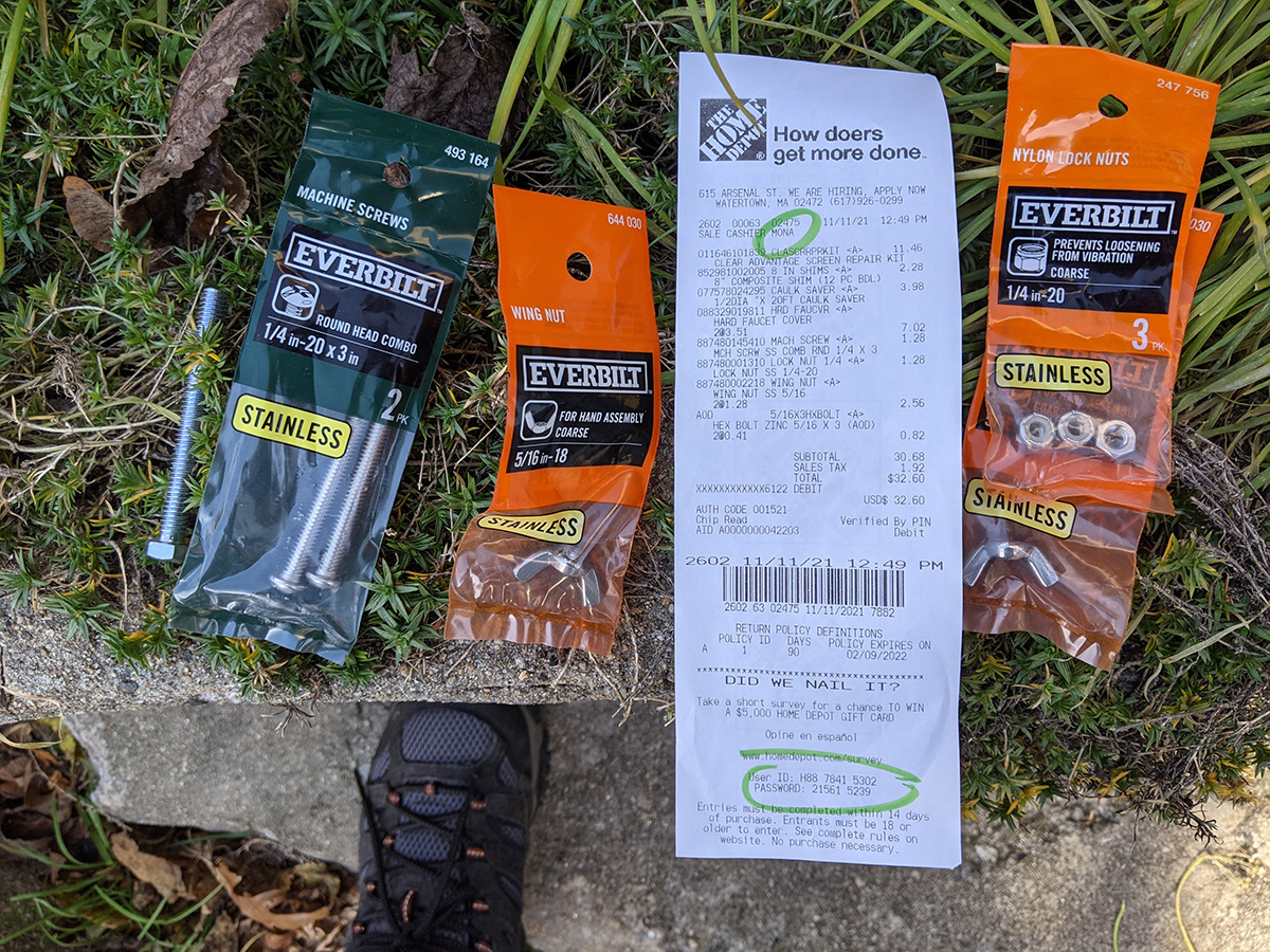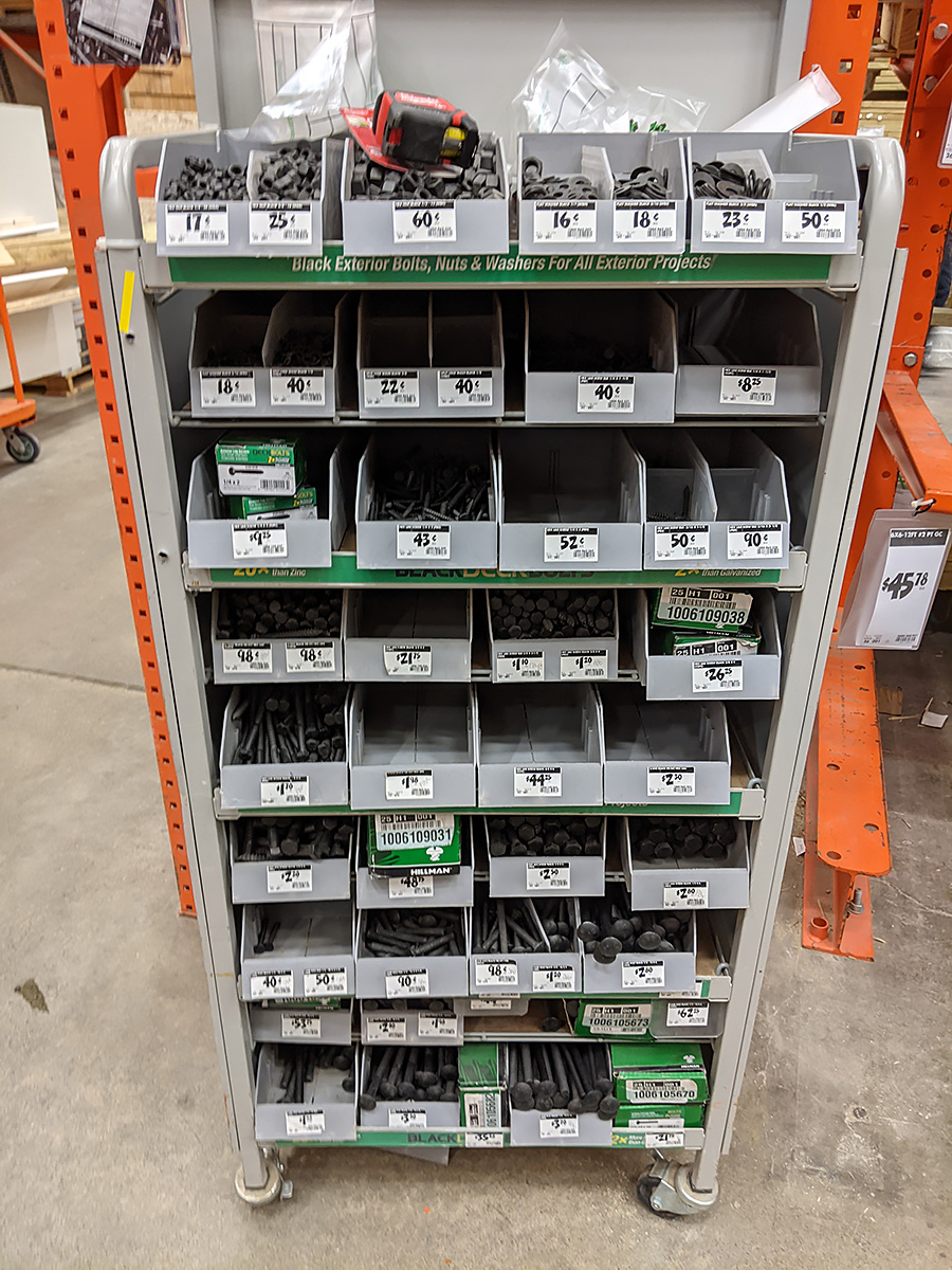 by the time i got back to the cafe it was already 1pm. i helped my father mount the parking sign before finally returning home. i didn't know which kind of screws to get so i got two kinds: 1/4in-20 x 3in stainless steel machine screws ($1.28/pair) with stainless steel nylon lock nuts ($1.28 for 3), and 5/16in-18 x 3in zinc hex bolt (41¢ each) paired with 5/16in-18 stainless steel wing nuts ($1.28 each). my father ended up using the zinc bolts with the wing nuts since they were easier to put on. if the zinc bolts go bad, we can replace them with the same (they're cheap) or black ceramic-coated bolts especially designed for outdoor use (i discovered them too late while roaming through the store, didn't buy but did take a photo).