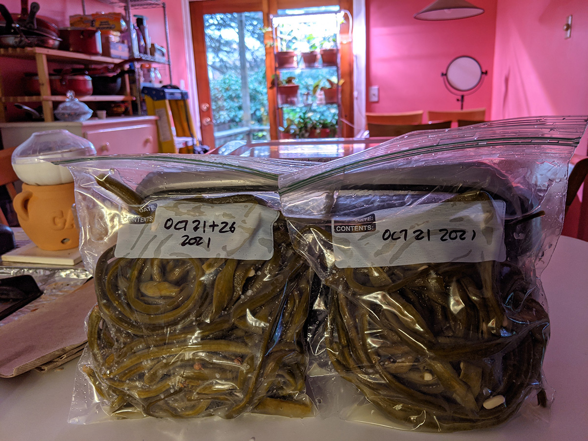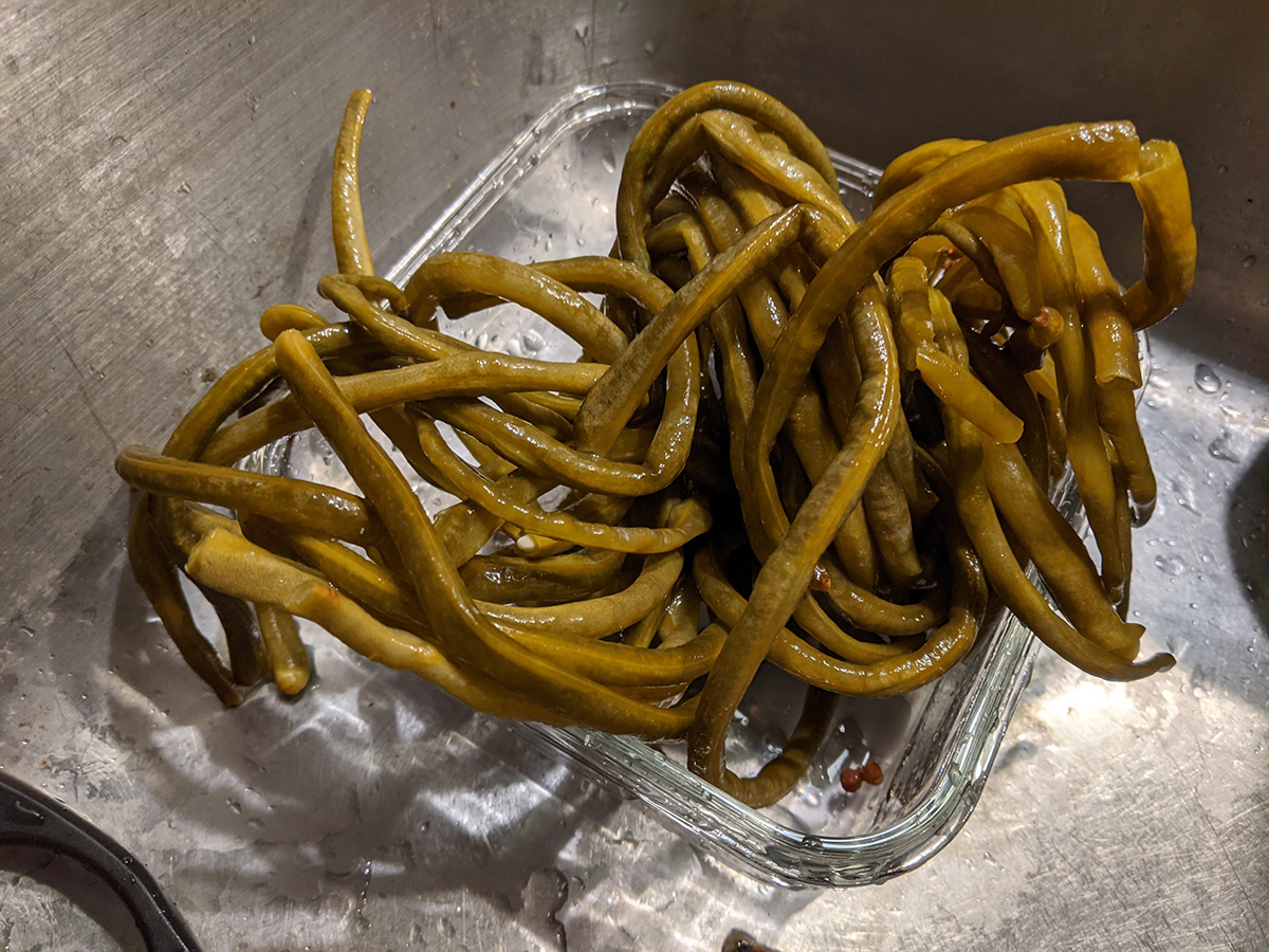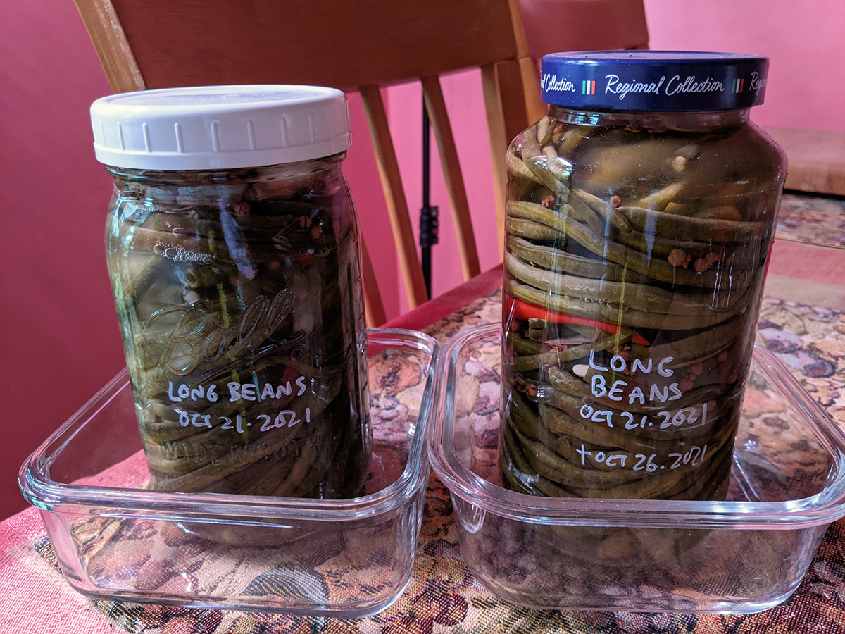 i removed my fermenting long beans from their jars after noticing molds on the surface. not harmless white yeast molds, but more serious fuzzy black molds. the reason was i used lids that weren't air-tight. in fact, when i opened one of the lids, a fruit fly came flying out. i removed the long beans, cutting off any parts on the surface that had rotted and turned soft. i then transferred them into 1-quart ziploc storage bags, squeezing out as much air as possible, before putting them into my fridge.