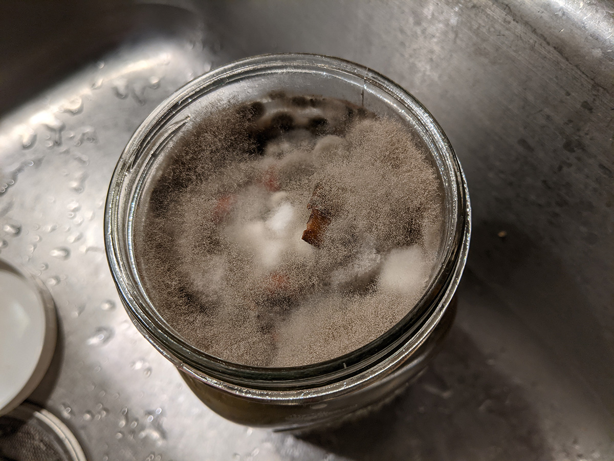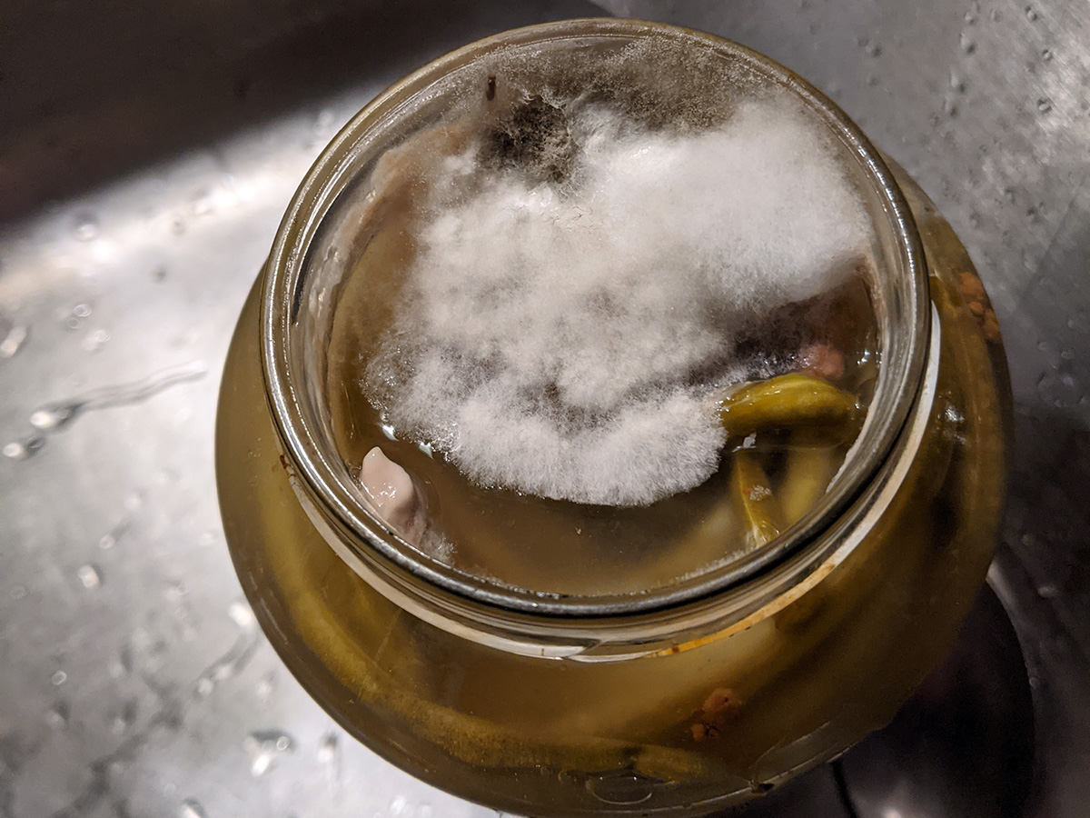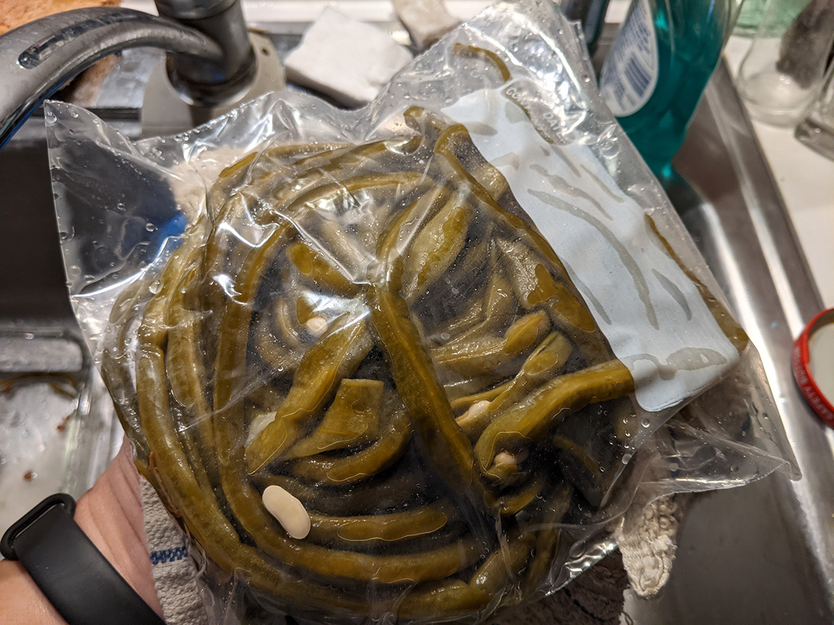 i removed my fermenting long beans from their jars after noticing molds on the surface. not harmless white yeast molds, but more serious fuzzy black molds. the reason was i used lids that weren't air-tight. in fact, when i opened one of the lids, a fruit fly came flying out. i removed the long beans, cutting off any parts on the surface that had rotted and turned soft. i then transferred them into 1-quart ziploc storage bags, squeezing out as much air as possible, before putting them into my fridge.