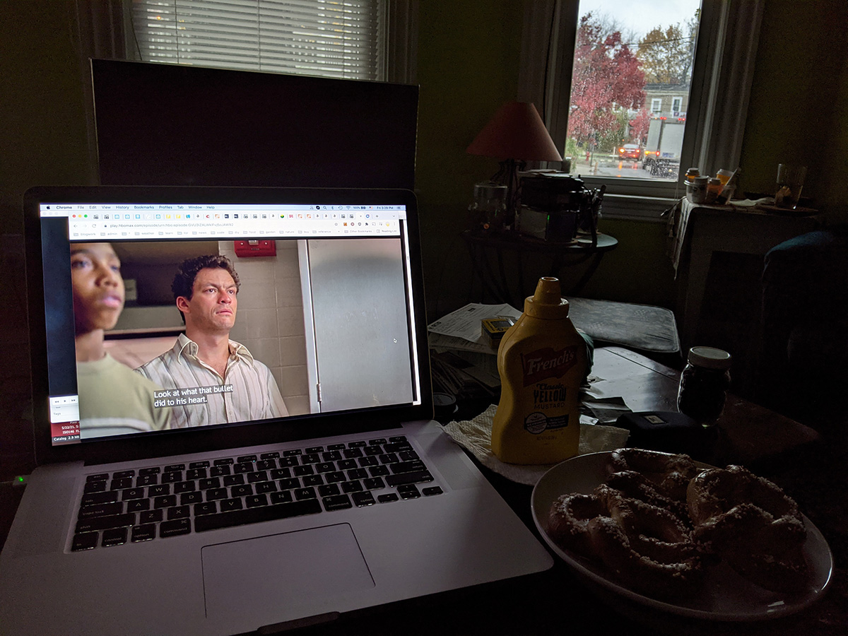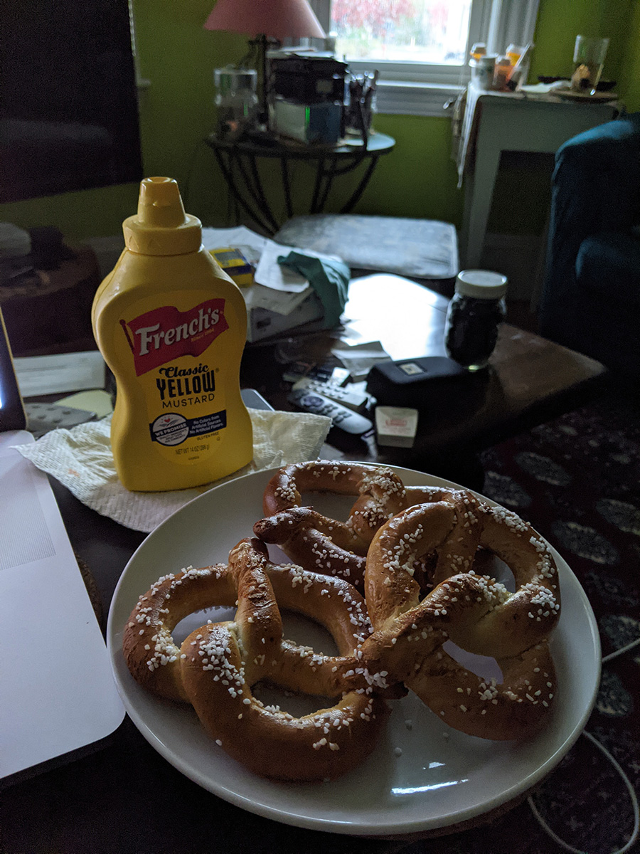 it's terrible: i spent the rest of the day snacking. that's probably why i wasn't very hungry came evening time. everything from doritos, to watermelon seeds, to licorice, to chocolate. it was like a junk food binge. i also toasted a trio of frozen soft pretzels in my toaster oven, ate with french's mustard while watching season 3 of the wire, littlefinger becomes mayor.