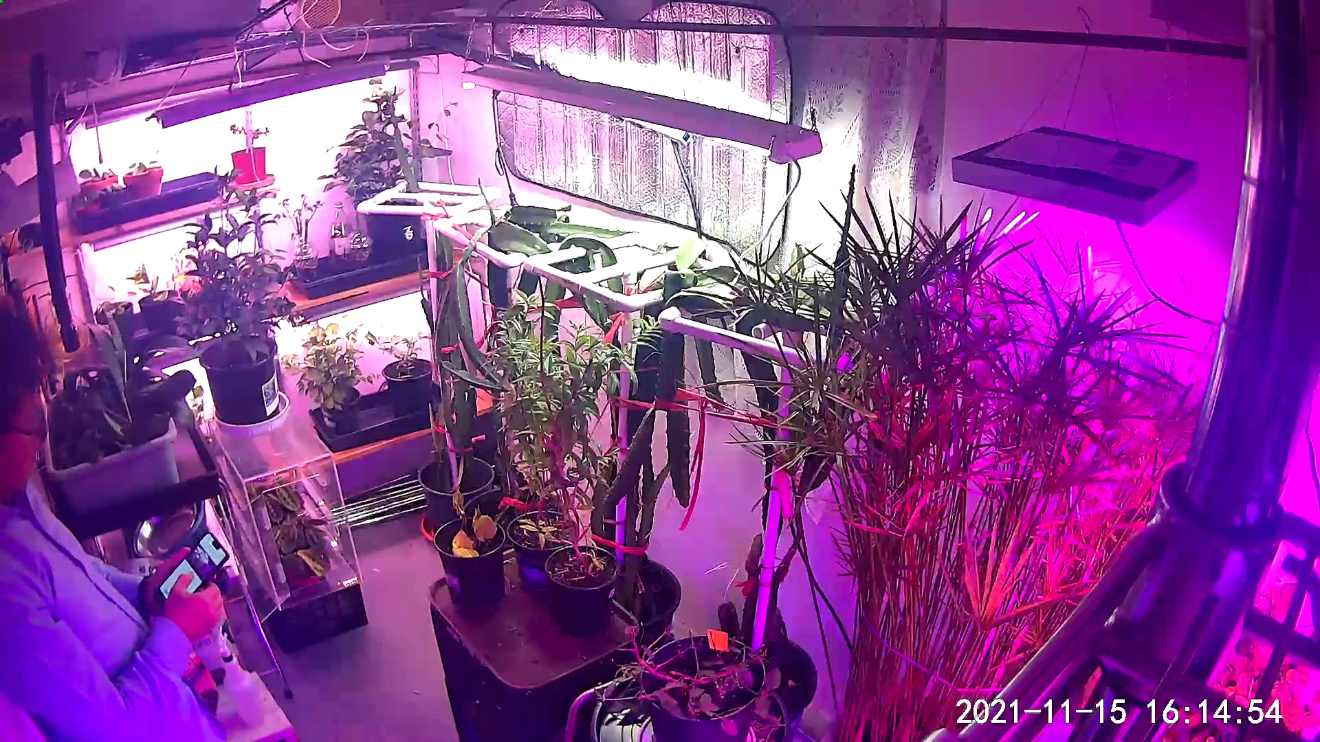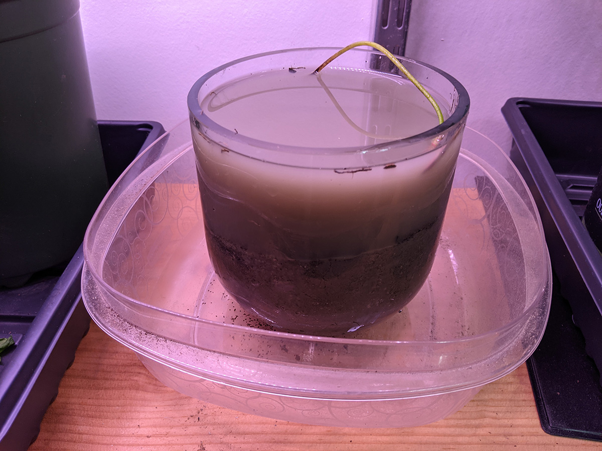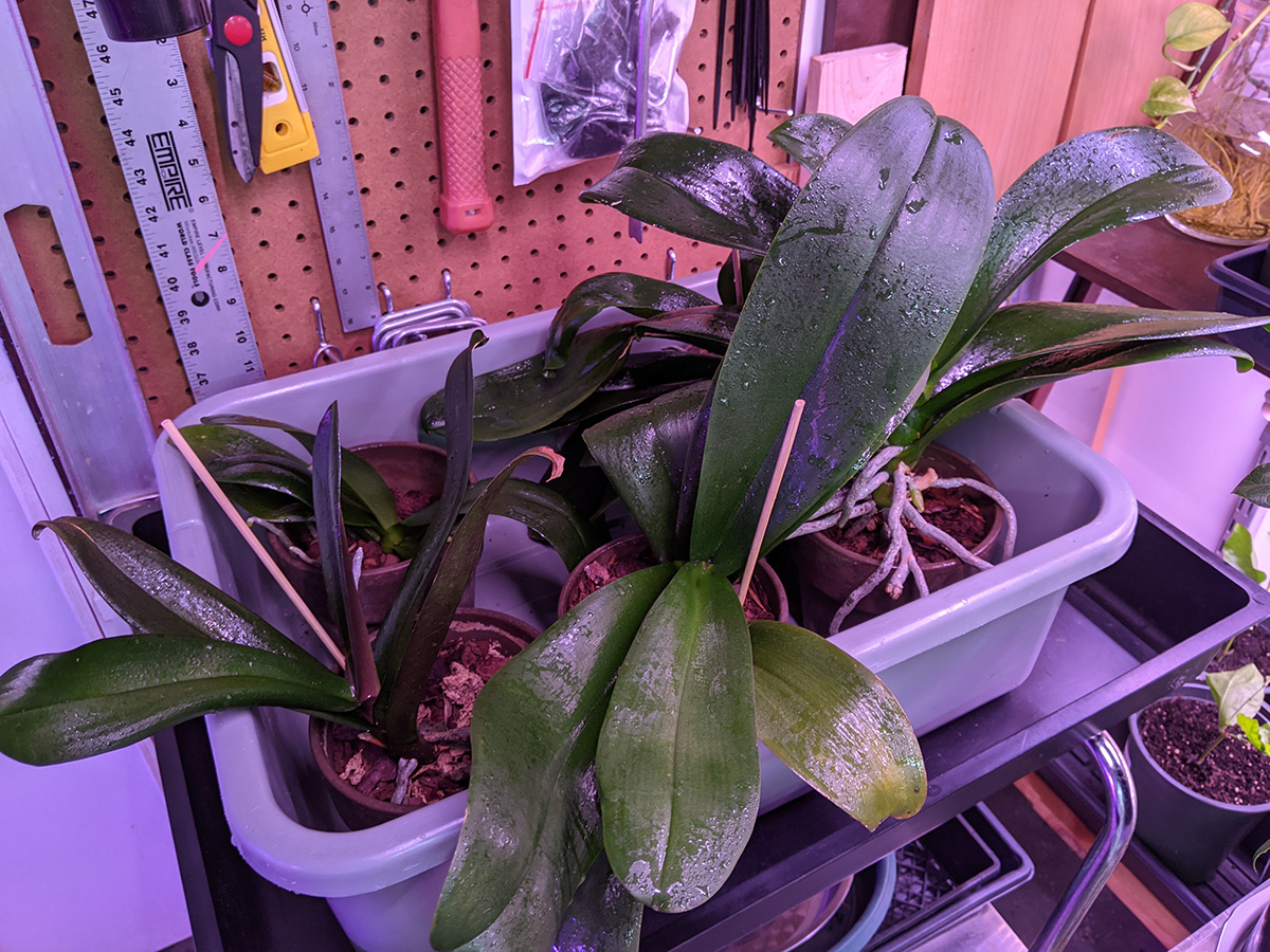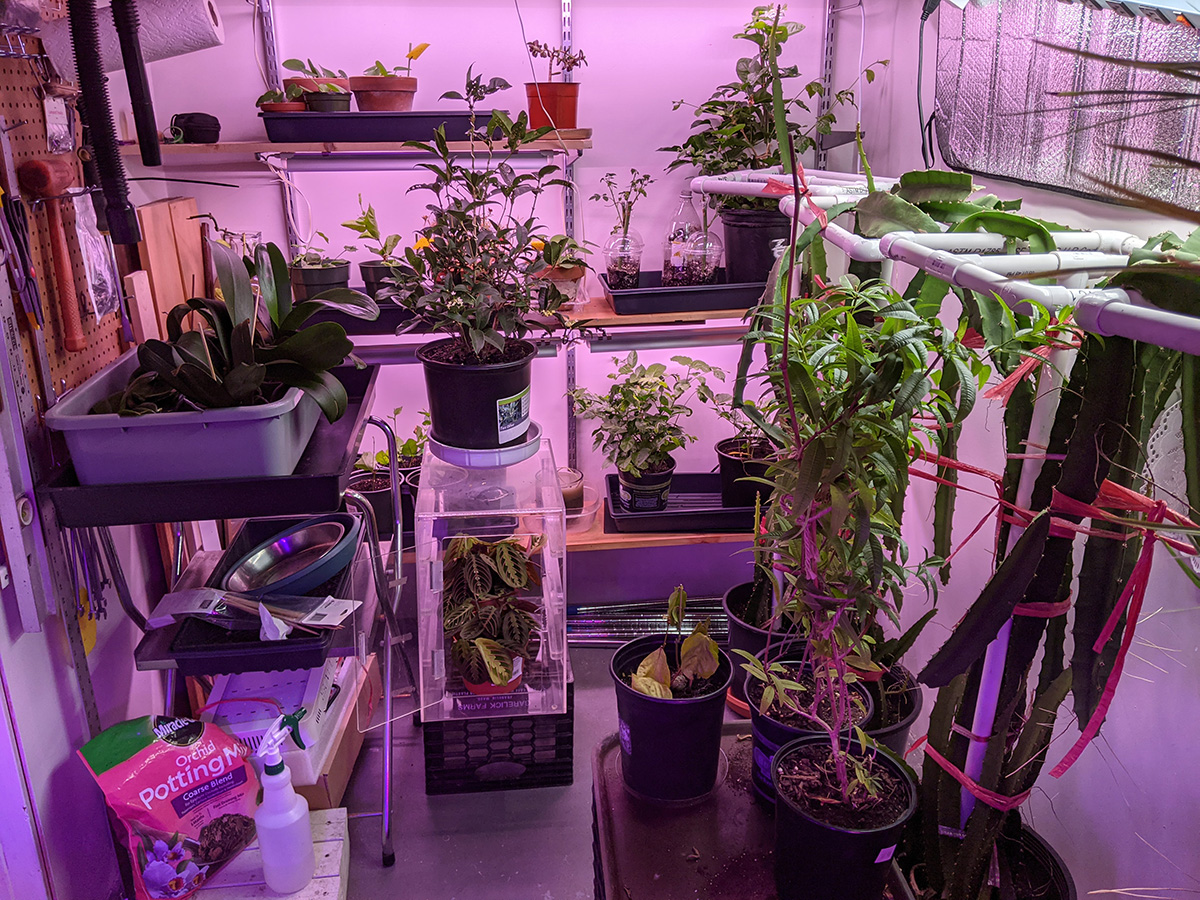i spent the rest of the day working in the grow room. i planted my one surviving lotus in glass container half filled with mud, and half filled with water. i relocated the webcam so it was above the metal shelving unit. i sprayed the orchids with neem oil. my father moved the fudingzhu osmanthus into the basement because it was too dry upstairs and the plant looked dry. we watered the gardenia with mosquito-bit infused rain water, followed by a soil drench with diluted acid-loving miracle-gro fertilizer.