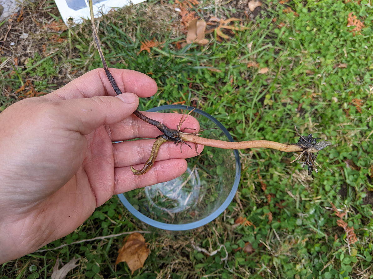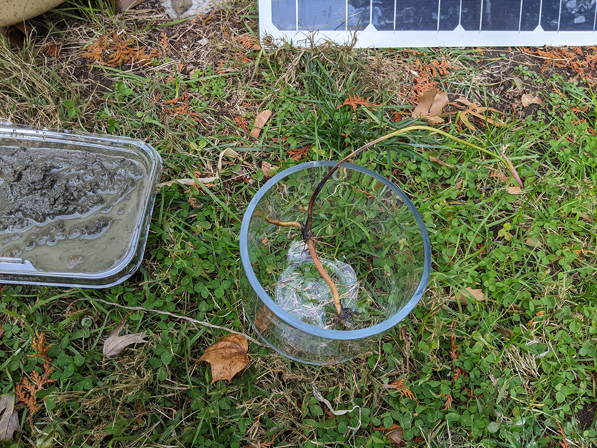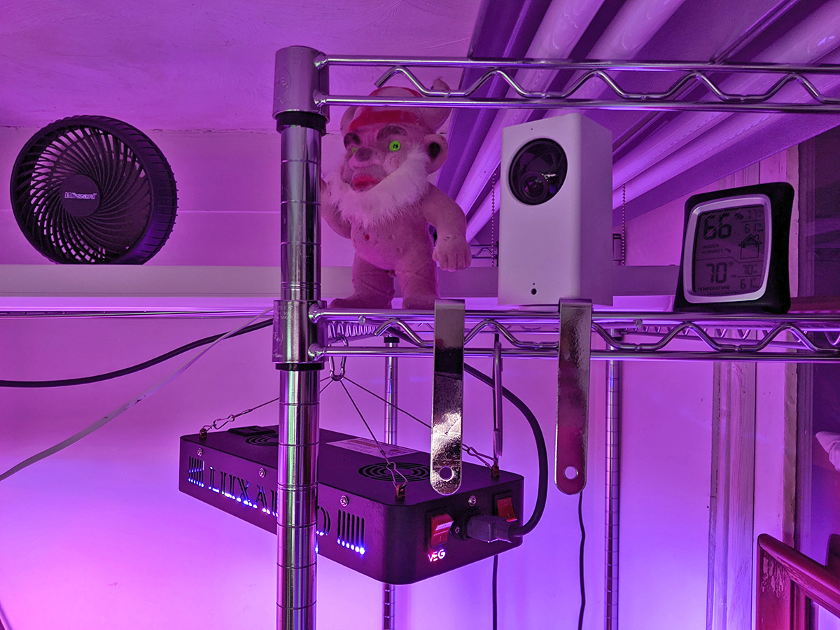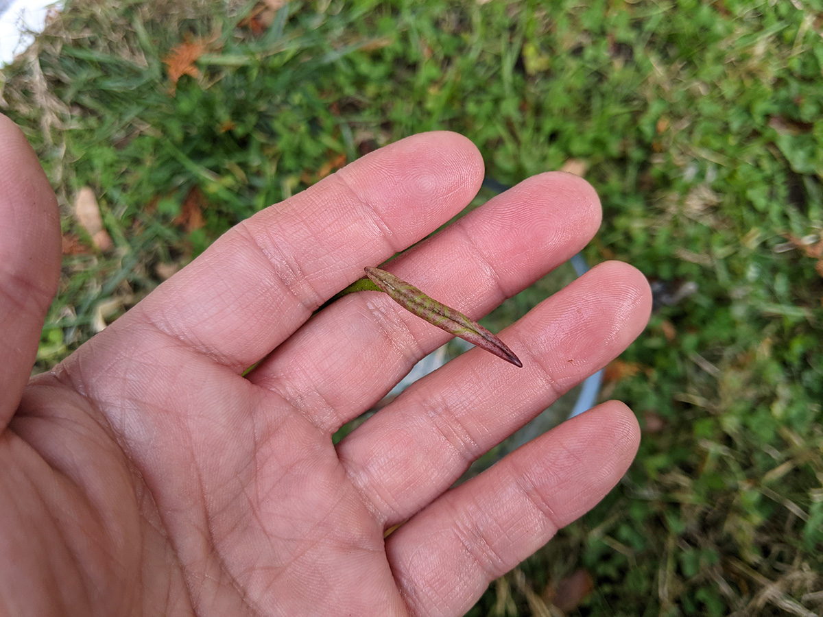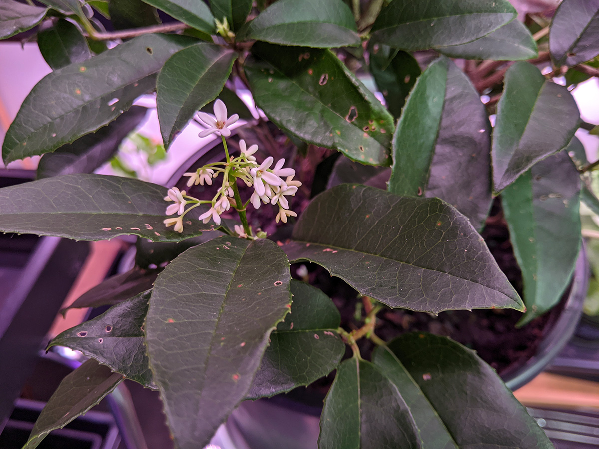 i spent the rest of the day working in the grow room. i planted my one surviving lotus in glass container half filled with mud, and half filled with water. i relocated the webcam so it was above the metal shelving unit. i sprayed the orchids with neem oil. my father moved the fudingzhu osmanthus into the basement because it was too dry upstairs and the plant looked dry. we watered the gardenia with mosquito-bit infused rain water, followed by a soil drench with diluted acid-loving miracle-gro fertilizer.