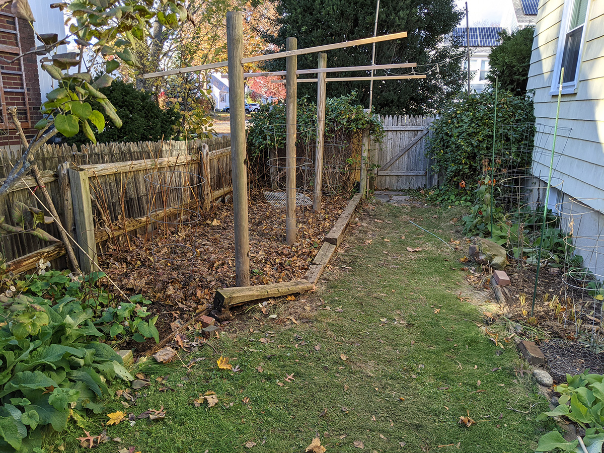 next my father and i went outside to dig up the western bed and add an entire bag of chicken manure. i measured the area, the newly expanded western bed (not including the raspberry patch) is approximately 50 sq.ft. or the size of two of our raised beds. since we used half a bag of chicken manure of each of our raised beds, it stands to reason we'd use an entire bag here. besides, we still had 5 more bags. my father's strategy was to dig two rows of trenches and bury the chicken manure, after which we'd cover the whole bed in shredded leaves that i made using the lawnmower. that helped to cover up any manure smell.