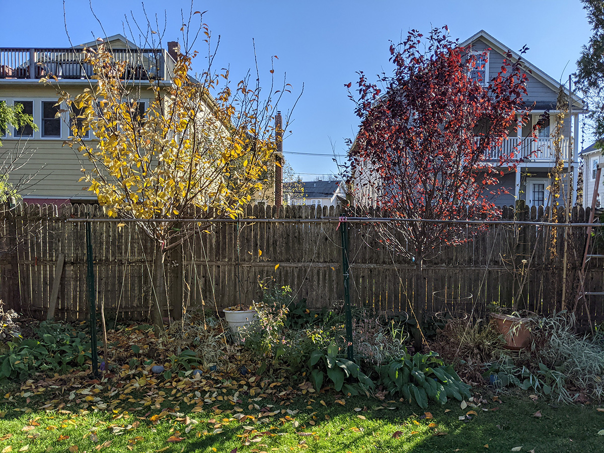 i also cleaned the red catch barrel by the dining room window, as well as one of the black storage barrels. the storage barrels i couldn't really clean inside, all i could do was empty the tank completely. i moved the three barrels to the southeastern corner of the yard, where they'll be stacked on their sides during the winter.