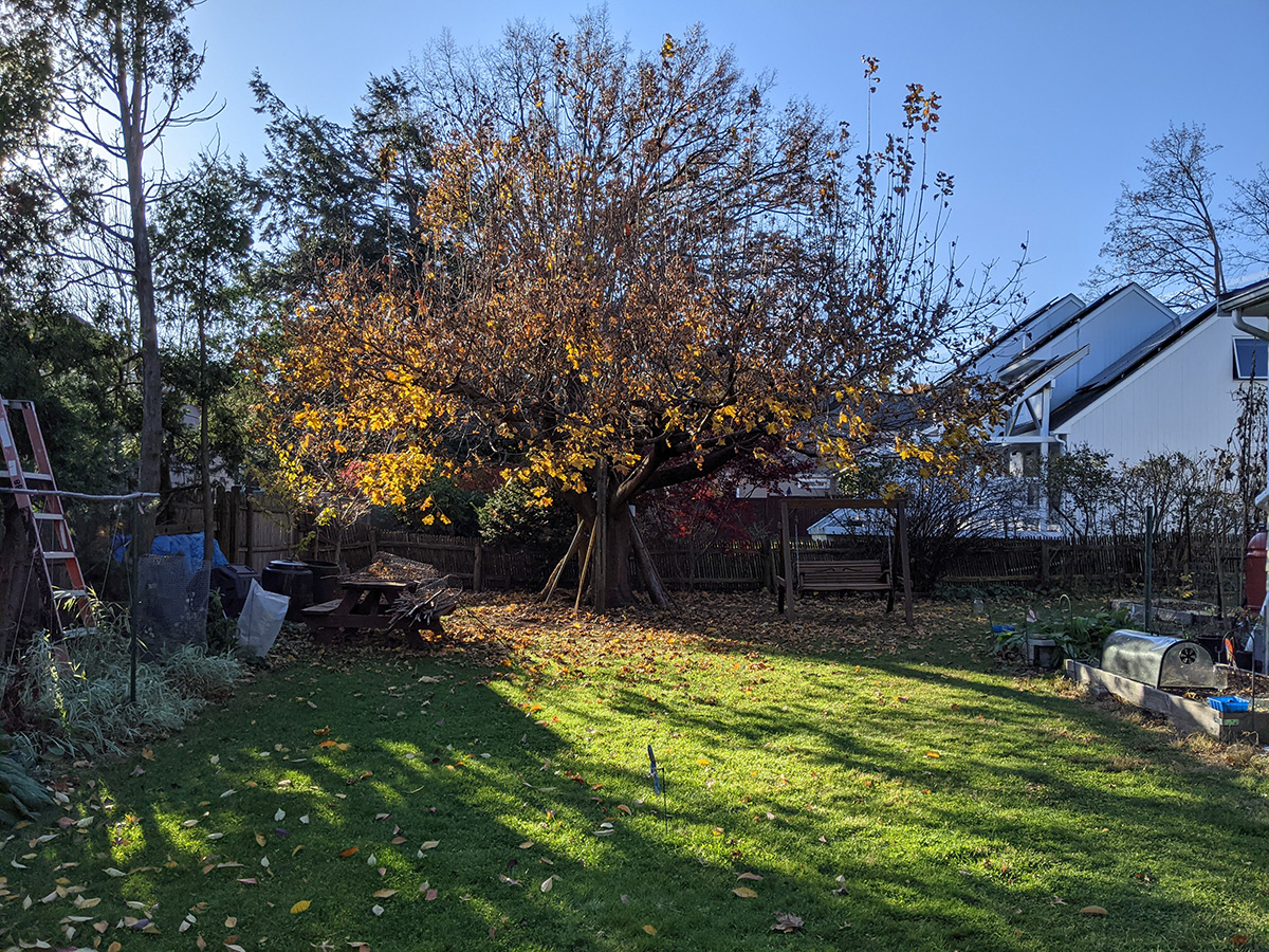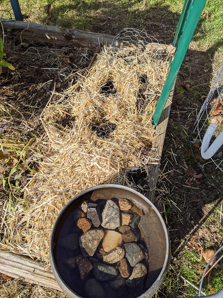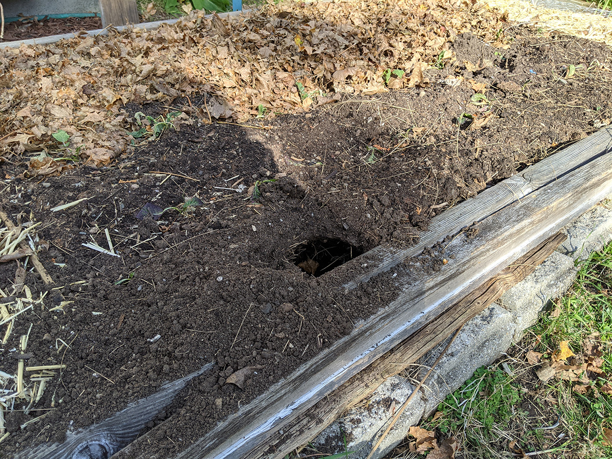 something animal (squirrel?) had dug into the raised beds. in RB1 there was a very deep hole, and at first i thought i was a burrow, so i checked to make sure there wasn't anything living inside. it's so big i wonder if a rabbit dug the hole, but i haven't seen rabbits in the backyard in months (i do however see them in the front yard). i patched up the hole. some critter (mostly likely a squirrel this time) had dug in the RB0 garlic bed. i don't think it was trying to eat any of the garlics, more like finding places to hide food for the winter, but it was mess, despite the metal mesh. i patched those holes as well.