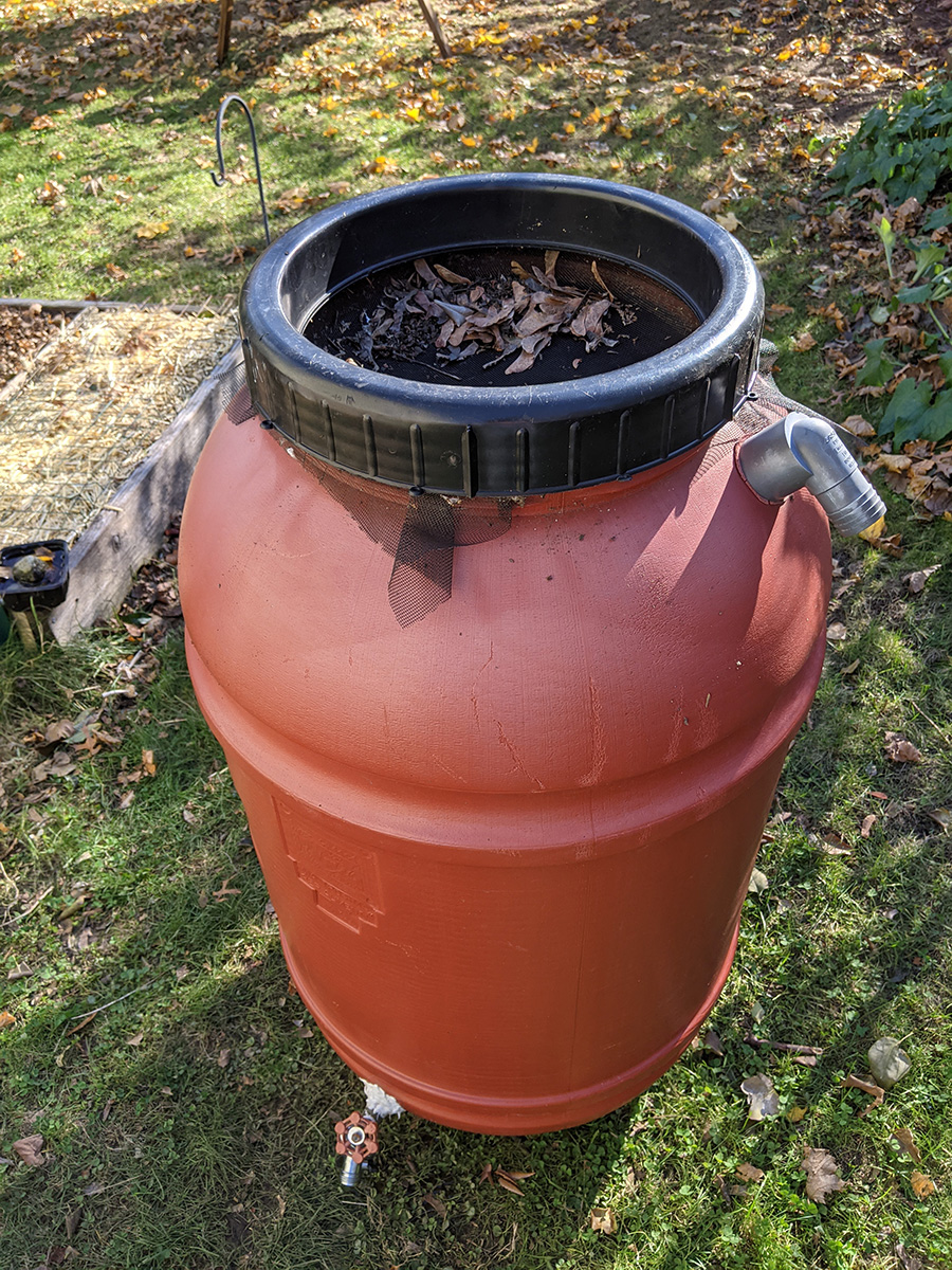 next i cleaned out the 3 catch barrels at the northwestern corner of the house. these were small enough that i could crawl inside and give them a thorough cleaning with some water and a brush. afterwards i tipped them upside down and put them back in their original locations. now that they're empty, they're much easier to steal. these are newer converted rain barrels that use brass bulk fittings so they never leak.