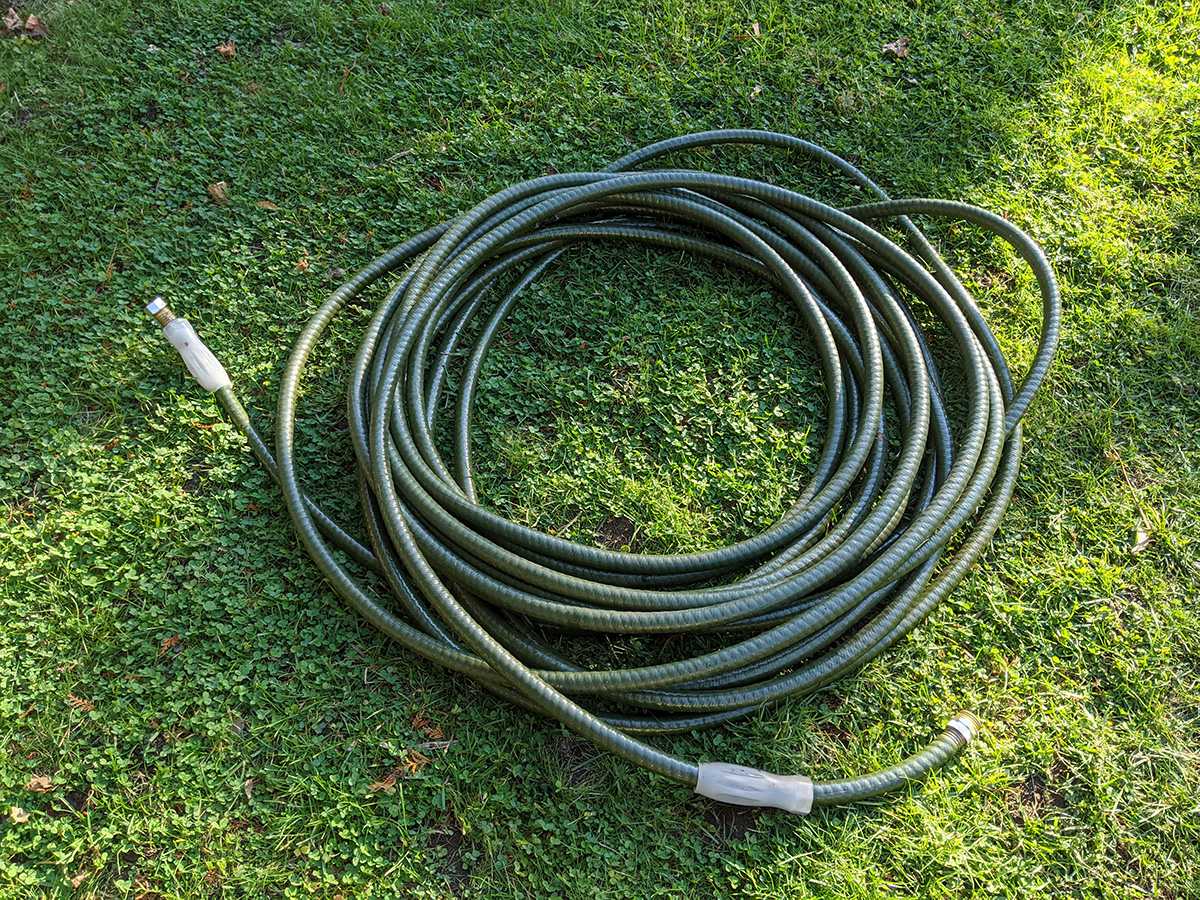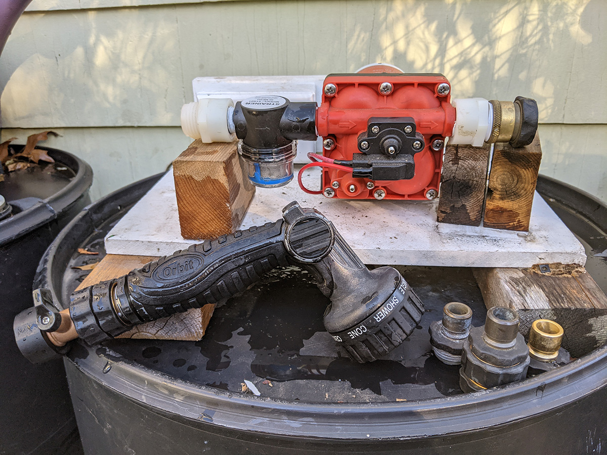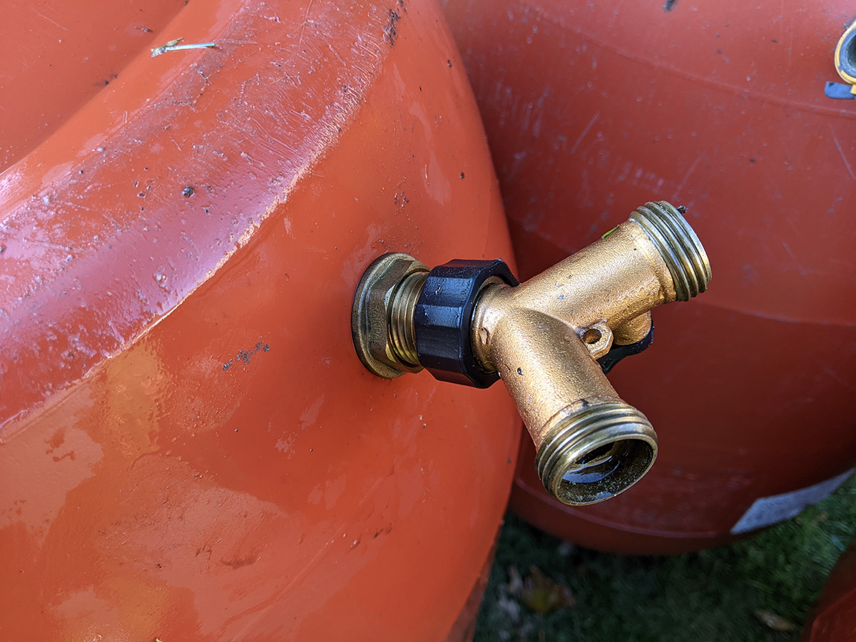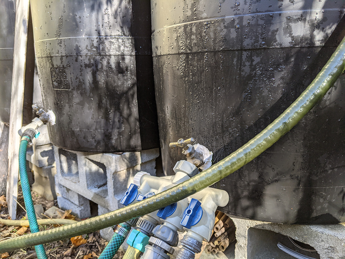 as for the remaining barrels, the 3 black and 1 red barrel by the sunroom are still collecting rain water. those we will disconnect before the daytime temperature dips below freezing. currently i still use harvested rain to water the plants in our grow room. i did put alway the long (50ft) garden hose, taking advantage of the warm weather. when it gets cold, the hose get rigid and become hard to coil up. that meant i disconnected the on-demand pump, though it's still usable if we connect a shorter hose to the pump.
