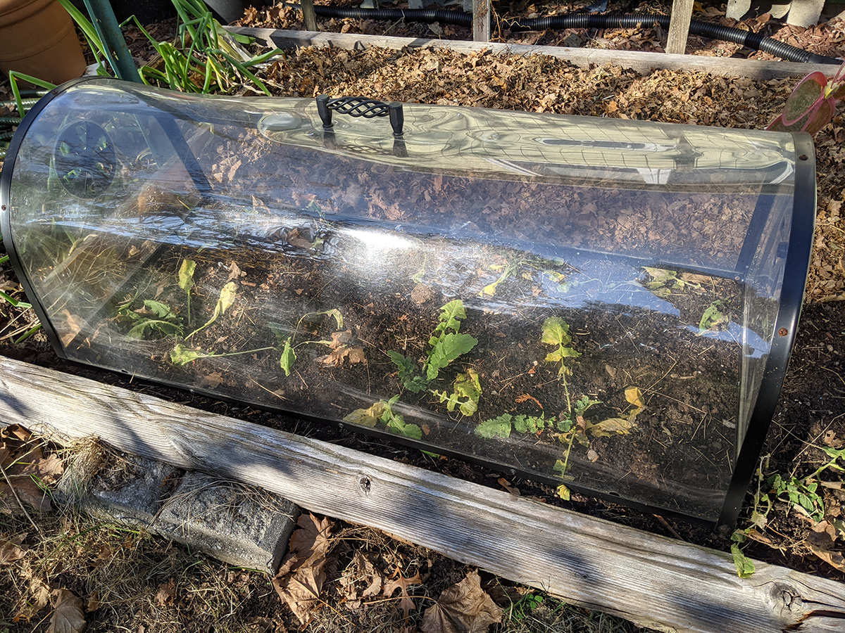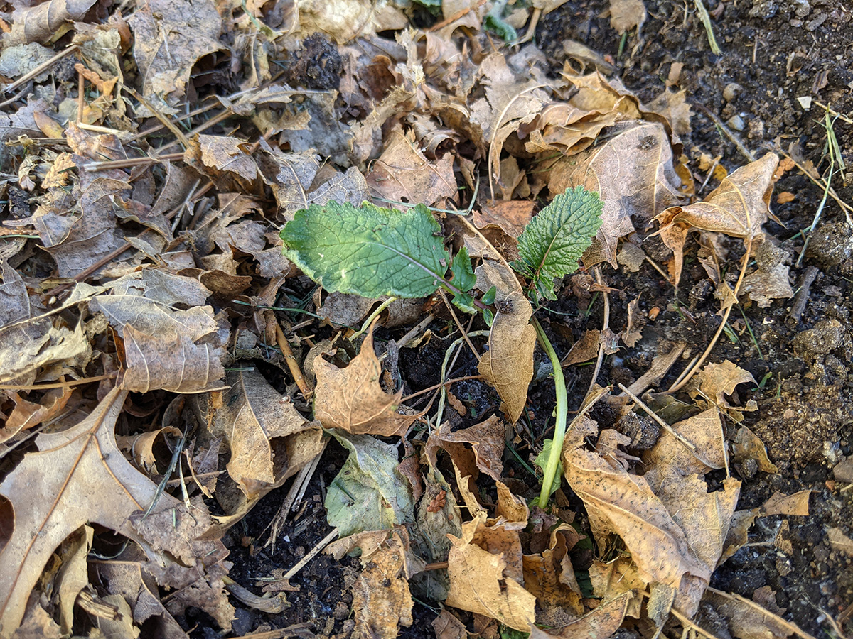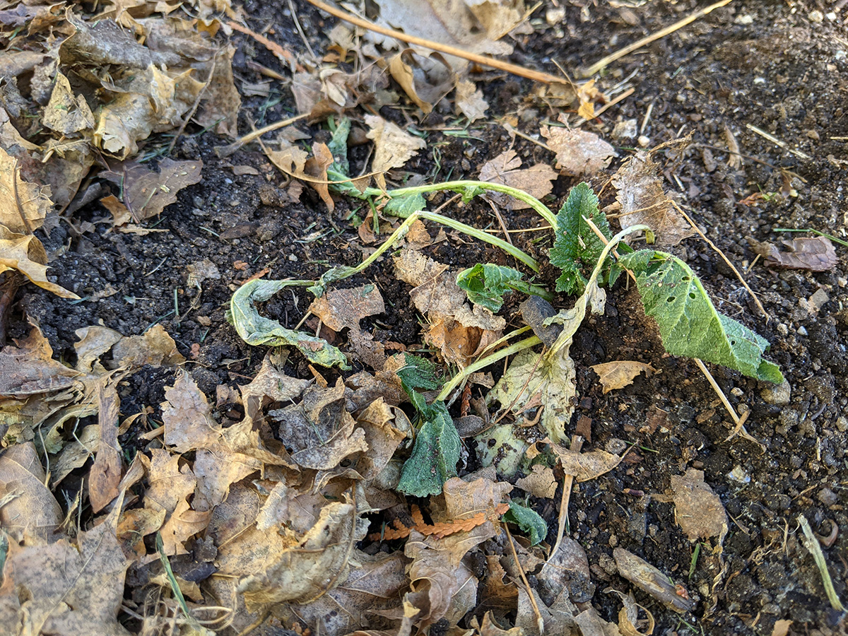the mustard and daikon seedlings that looked like they were doing so well last weekend now all looked wilted. was it the cold temperature? or too much nitrogen-rich chicken manure? the few lucky daikon plants underneath tha tented row cover seem to be doing better, so it makes me think the wilt is temperature related.