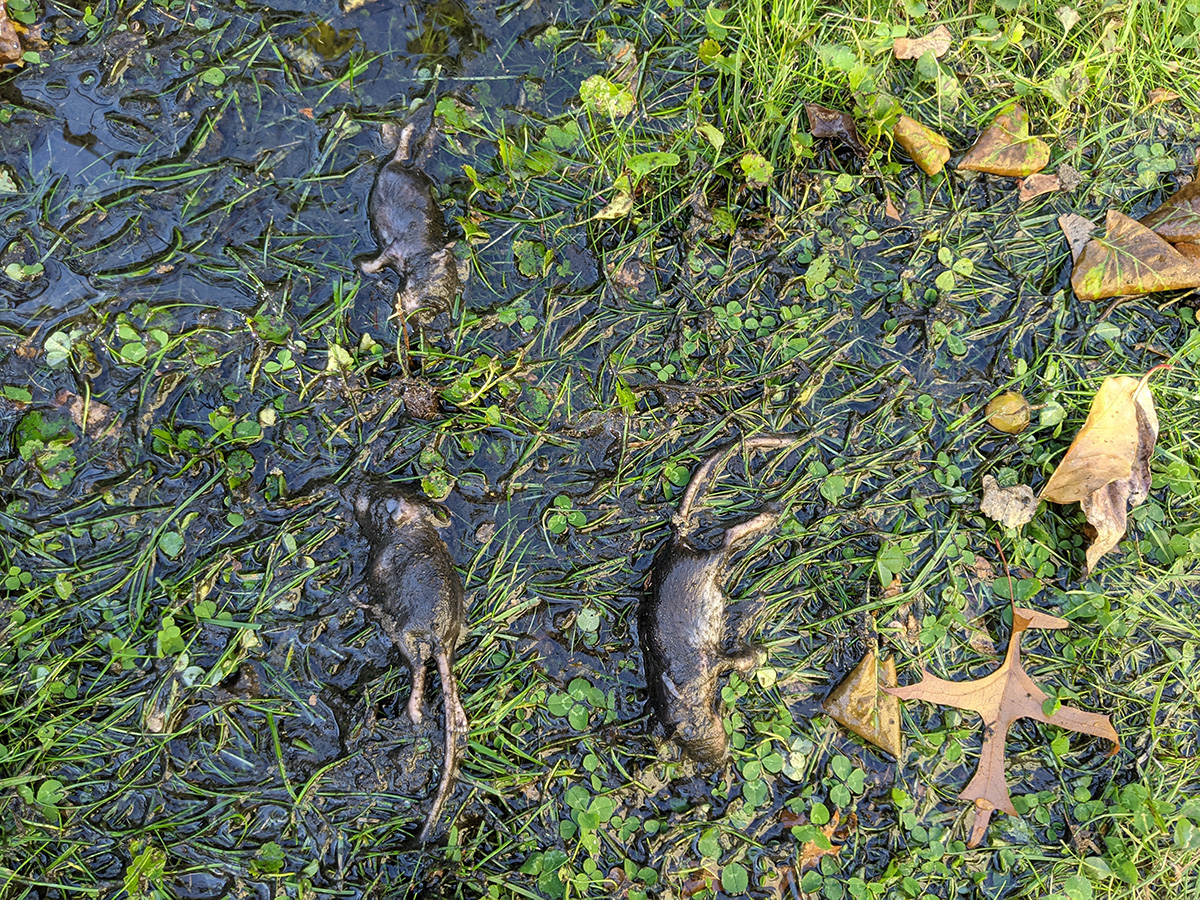 here in belmont i was doing some yard maintenance. empty and clean some rain barrels and store them for the winter. i started with the red catch barrel at the corner of my parents' bedroom. there was still a bit of water inside, so i removed it from the cinder block and tipped it upside down to dump out the water. i noticed there was a foul smell, and when the water poured out, there were 3 dead mice inside. they must've crawled up the overflow pipe once the barrel was mostly drained, and then fell to the bottom where they couldn't escape and finally drowned. i cleaned the inside of the barrel the best i could, i didn't want to crawl in to give it a thorough scrubbing as it still smelled of decomposition.