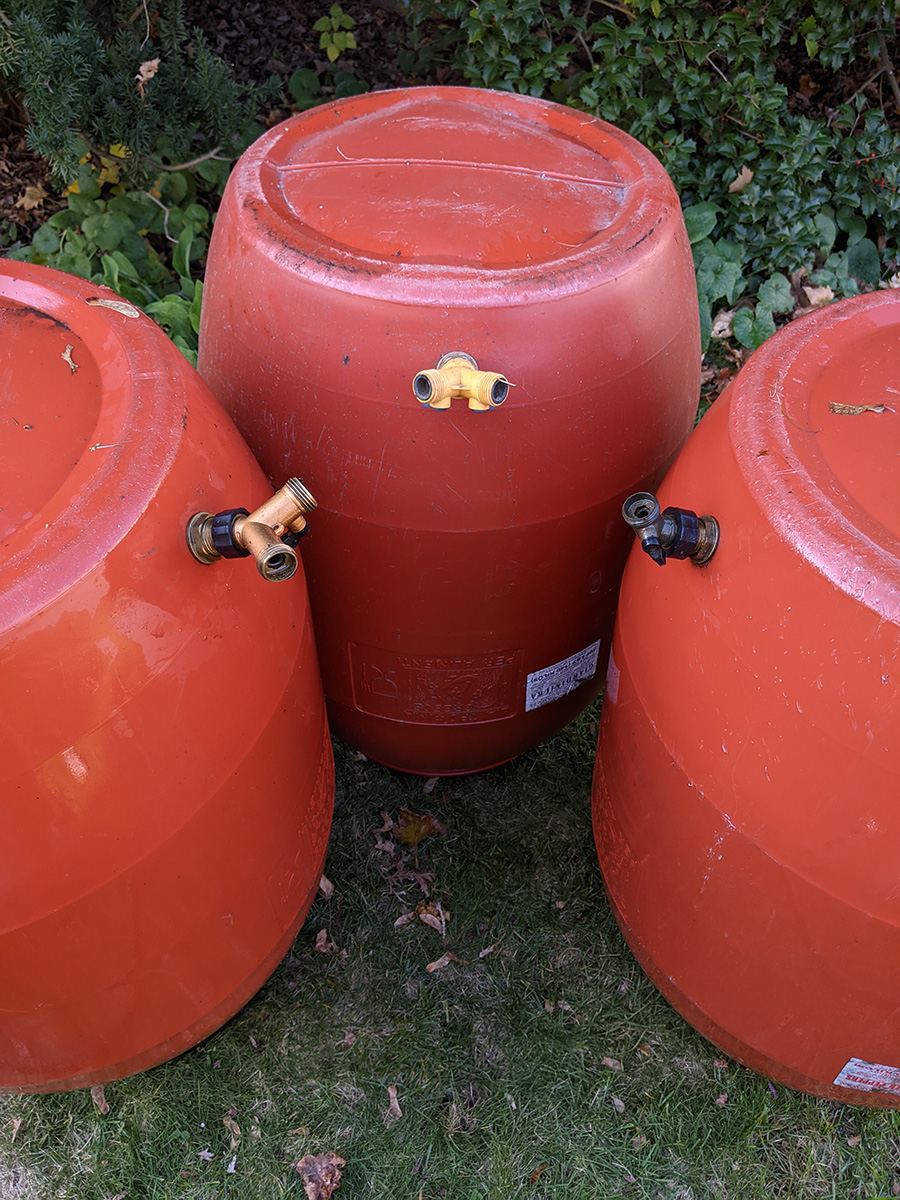 the two barrels in front of the living room window i didn't have time to clean. all i did was to put away the watering hose and disconnect the old 12v pump, putting them in the garage. we'll clean them this weekend, and put away some more hoses, as the temperature will still be relatively warm, in the 50's.