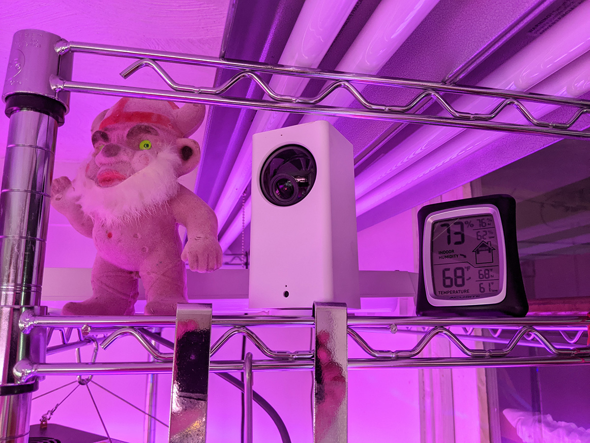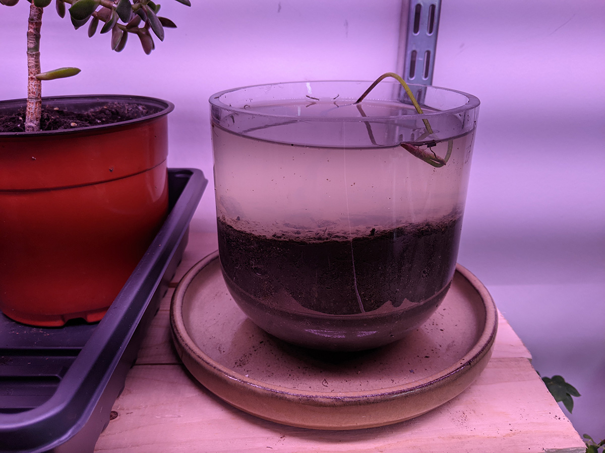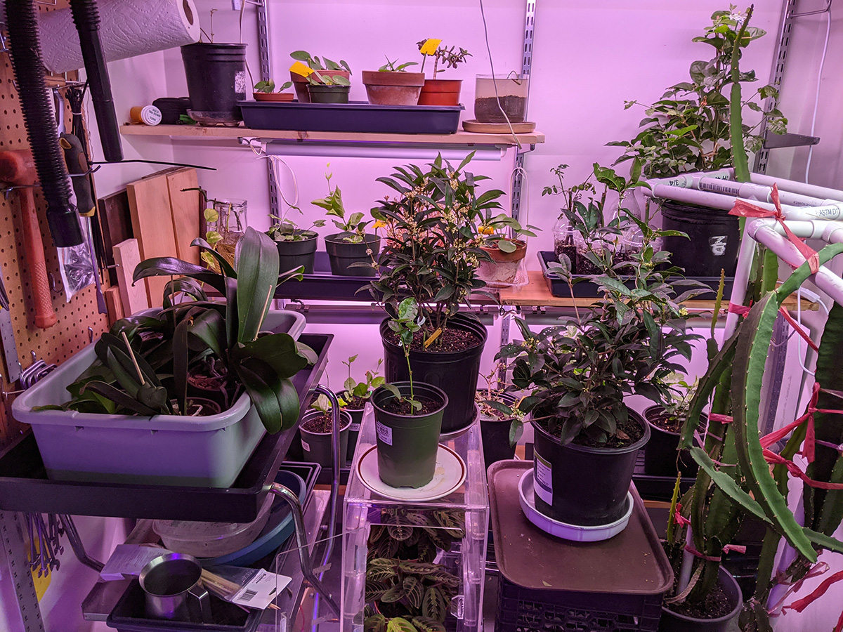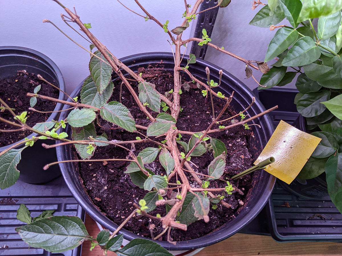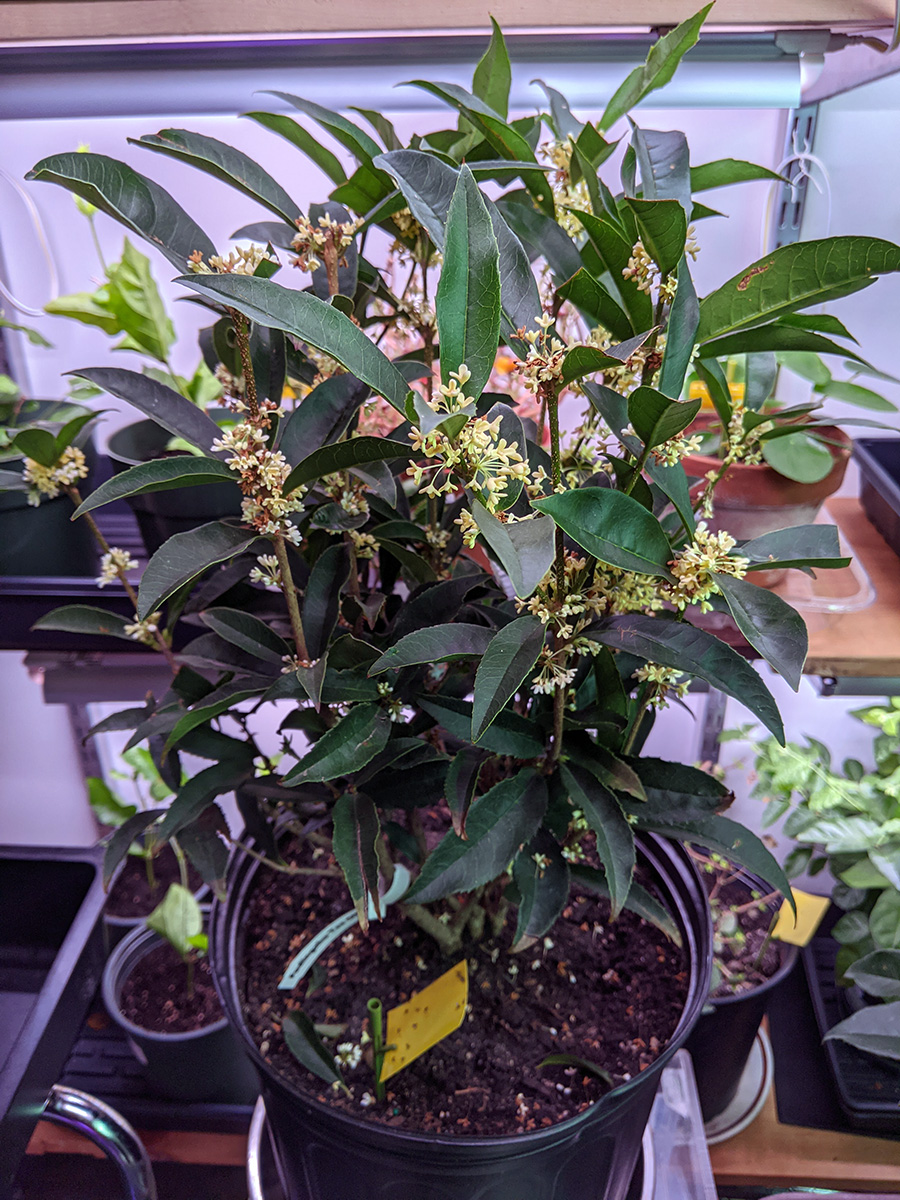i went to the basement to check on the grow room. before i even got there, i could smell the osmanthus. the higher humidity really brings out the fragrance. i noticed the water in my lotus container has turned clear. the potted lantana had lost a lot of its original leaves, but now was starting to make new ones, tiny green buds emerging all over its branches.