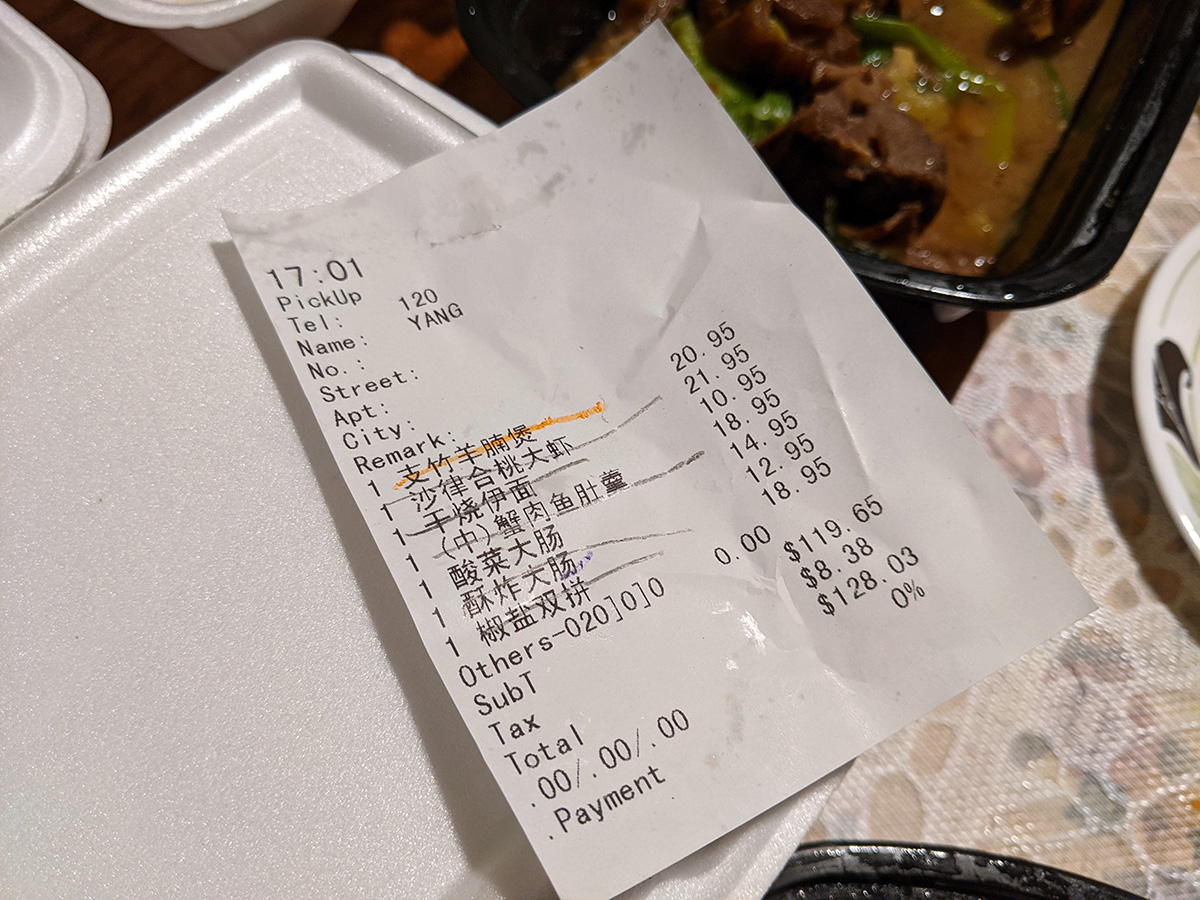 because we were paying cash, my mother was able to speak to the owner and get a discount on the order ($120). the order wasn't ready yet so i wait about 10 minutes before a large bag came out of the kitchen. they also seemed to be doing pretty good dining service, about a dozen tables.
