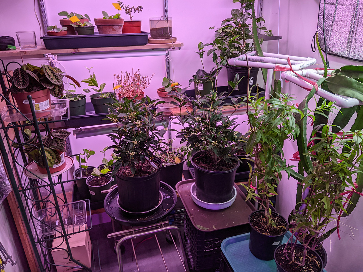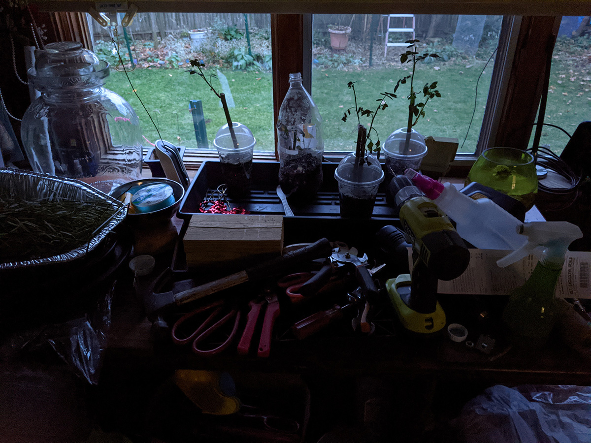 later my father and i set up the folding plant stand in the basement grow room. a bunch of our rose cuttings have rotted; you know they've gone bad when the stem turns black. we moved all of them into the sunroom, so they can winterize in the cold temperature. hopefully this will also kill the mold that's been growing in the damp soil.