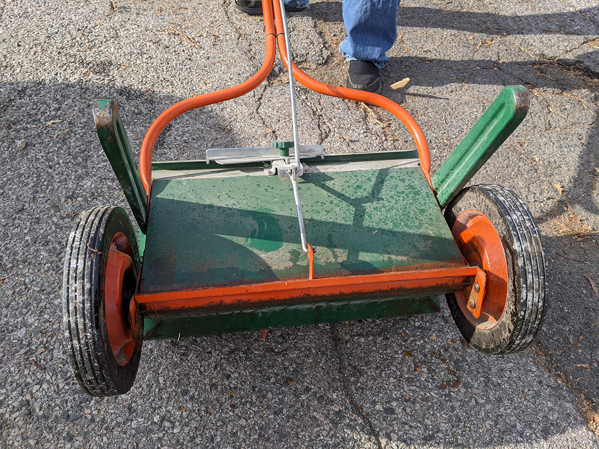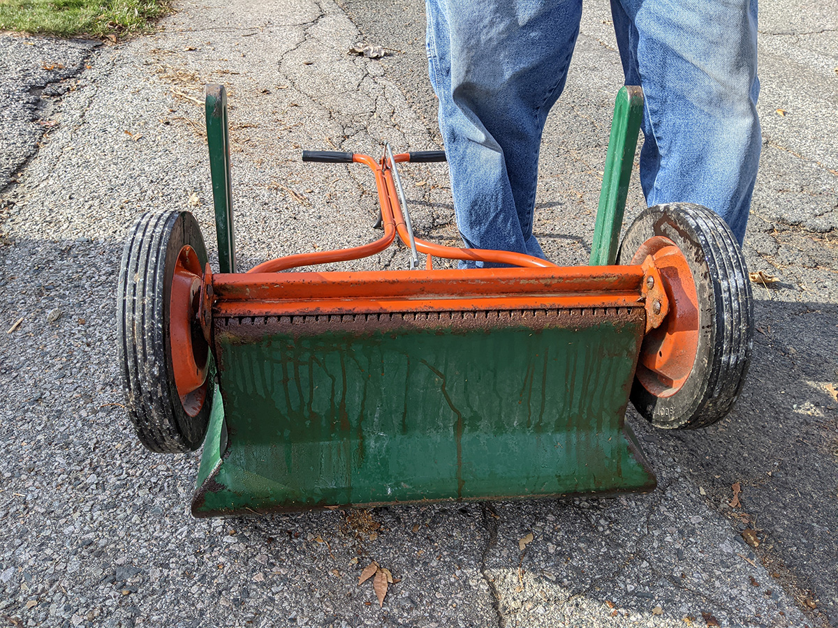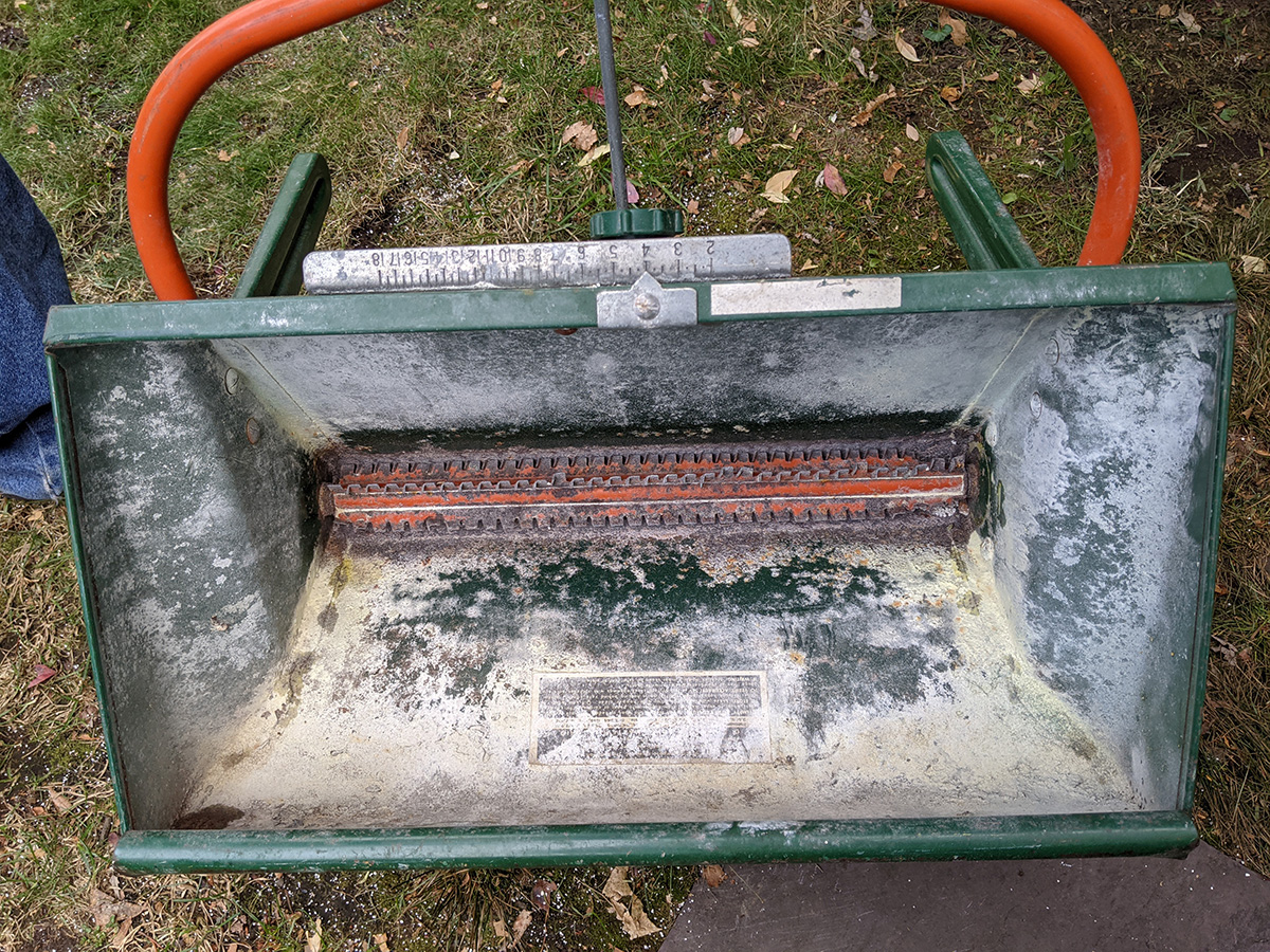 when i arrived at my parents' place, i saw that my father had already mowed the lawn. this was our last mow of the year, since we were prepared to add the final fall lawn food. our drop broadcaster was rusted shut, my father sprayed it with a generous amount of WD-40 to get it working again. the instructions for the scotts winterguard turf builder said to set the spreader at 6-1/4 size, which i thought was too much. those fertilizer instructions are always trying to get you to use more, then you'll have to buy more fertilizer. unfortunately i didn't have a record of what we set the spreader at last autumn, so we opted for size 4.