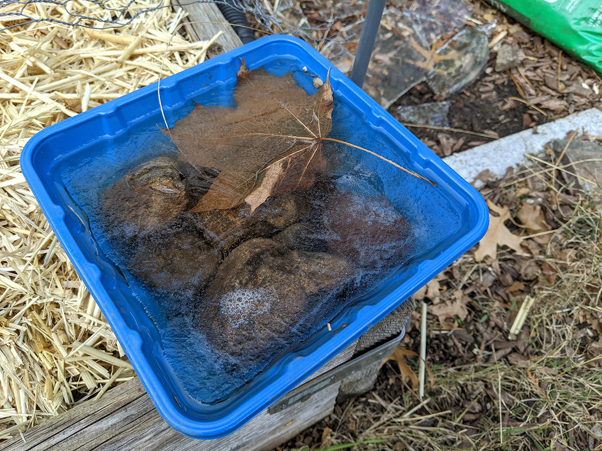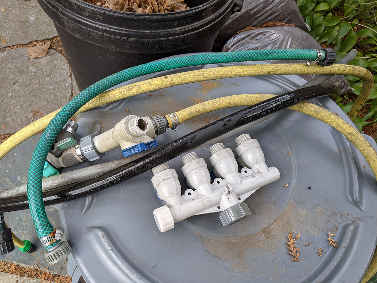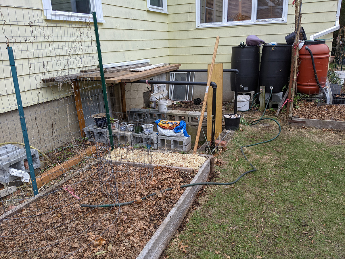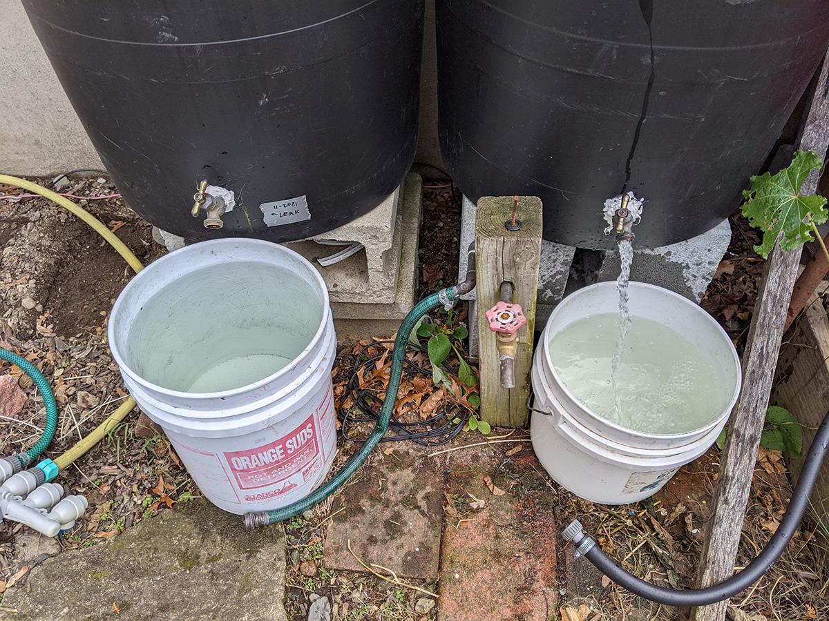 my father had the honor of pushing the fertilizer spreader. i kept asking him not to backtrack since i was afraid we'd run out of fertilizer, but he was confident we'd have enough. turns out he was right, we still had 1/5 bag left over when he was done fertilizing. he said we could probably go up to size 4-1/2 in the future. while he was doing that, i was clearing the backyard of obstructions. i also filled up 2 more buckets with rain water (for plant watering usage) before draining 2 of the remaining 3 filled rain barrels.