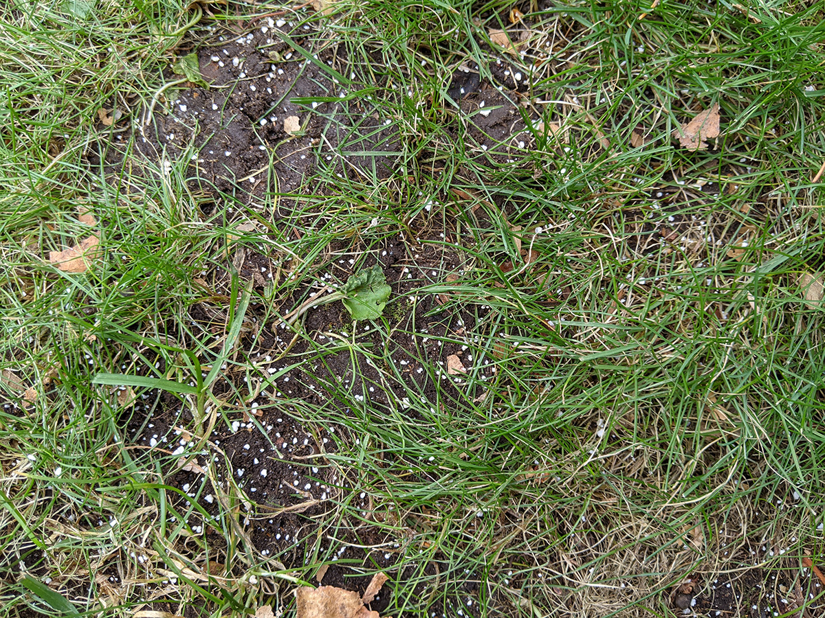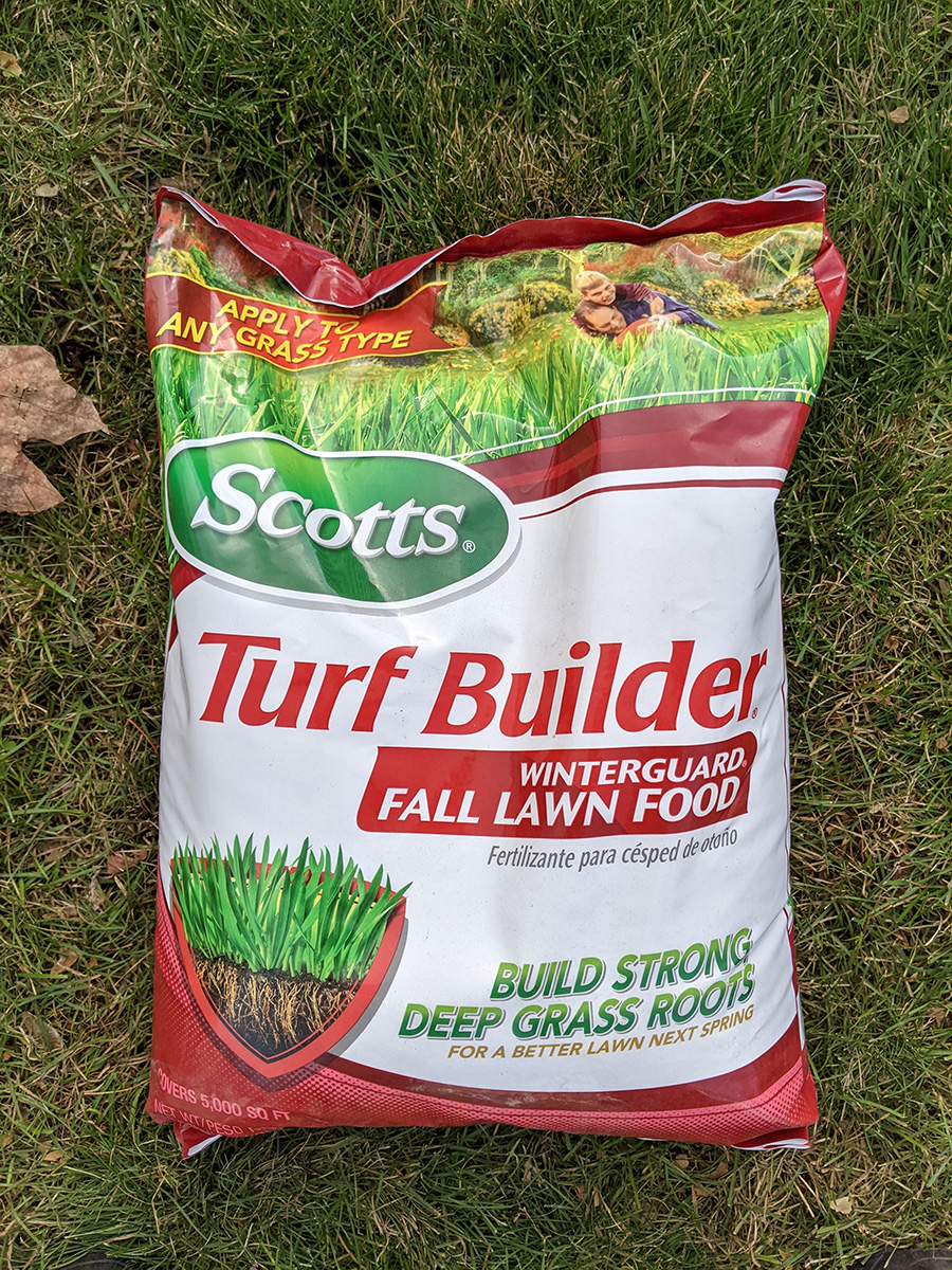 this was actually our second lawn feeding for autumn. the first was back in mid-september, when we overseeded the lawn then fertilized with a general purpose lawn fertilizer to give the seeds a little kick once they germinate. come spring we'll fertilize again, even though it's completely unnecessary. springtime is when we apply the crabgrass preventer, but for some reason it comes premixed with fertilizer as well.