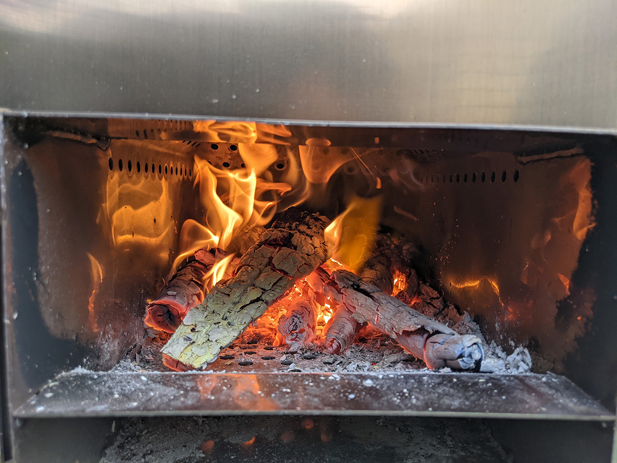 new wood burns initially with black smoke that doesn't seem to want to rise up in the air, but after the flames pick up a bit (which creates an updraft), the smoke disappears and all that's left is warm air escaping from the smokestack.