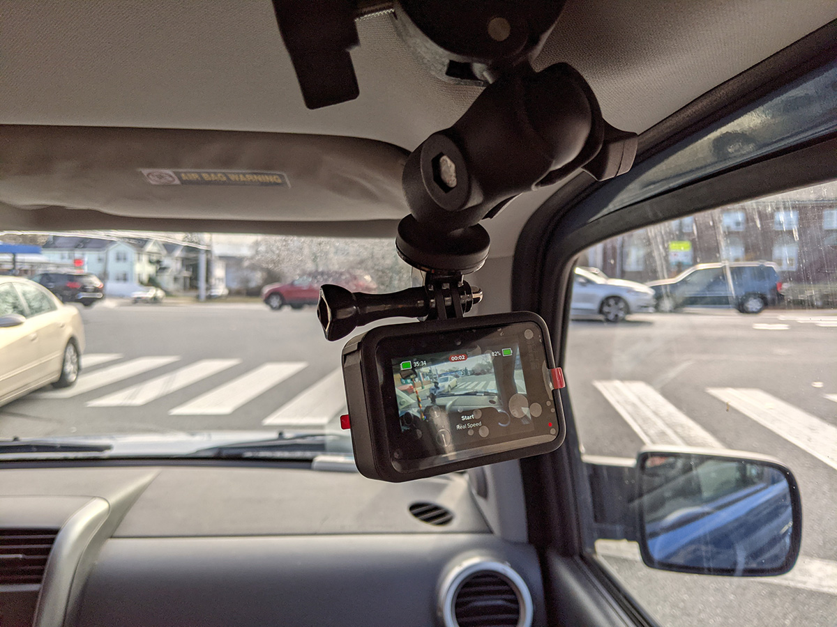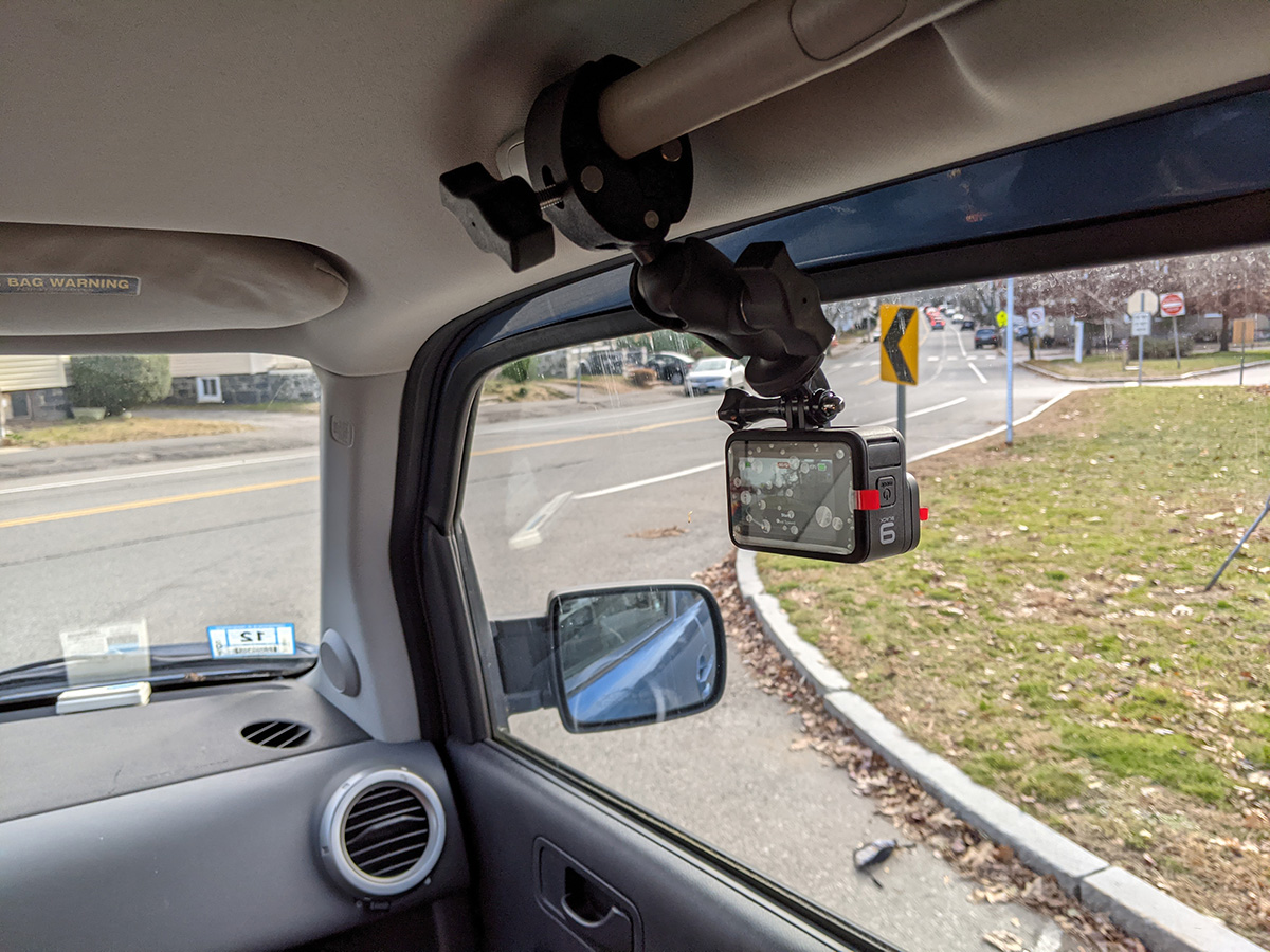 we took the element, which doesn't have good side window views, and the only clear window was just the front. i clamped the gopro to the grab handle by the door above my mother's head, pointing outwards. then i realized i could reconfigure the clamp mount so the gopro could point to the windshield from the side. the camera was smart enough to orient itself 180° when it detected it was hanging upside down, i thought that was pretty cool.