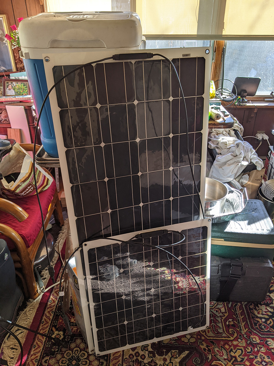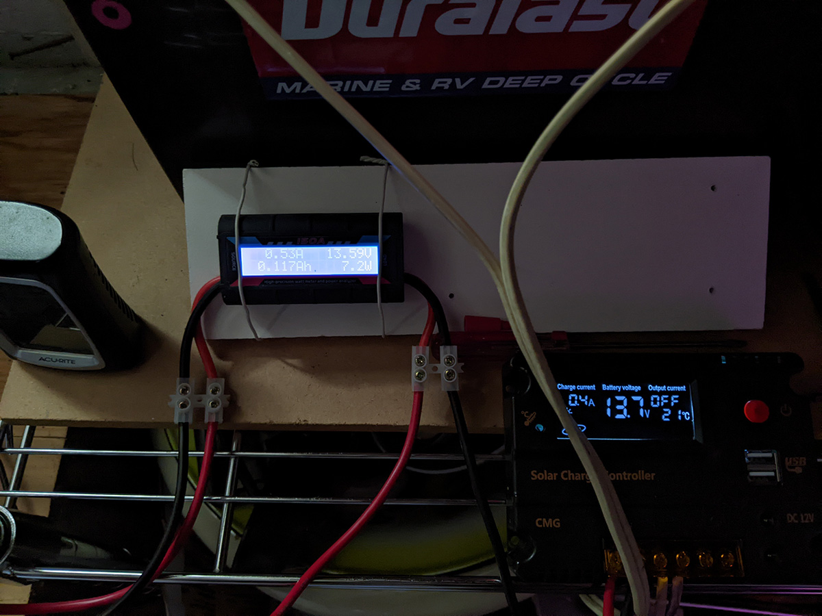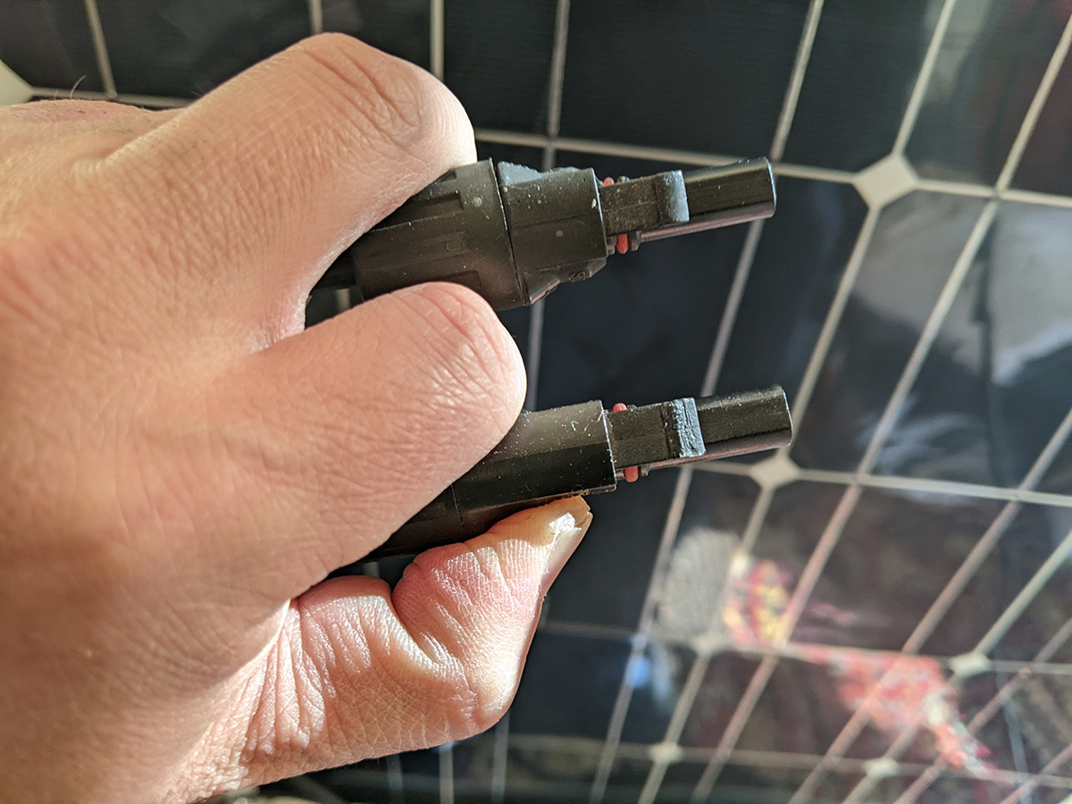 i reconnected the 100W flexible solar panel to our basement marine battery. that's when i noticed the power analyzer dongle wasn't lit. this only happens if the solar panel wasn't producing any electricity, which wouldn't be the case since it was out in the bright sunlight. so i told my father and we ended up replacing the 100W panel with the spare 50W panel. that worked but later when my father retested the 100W panel, it started working again. i also sanded down the prongs of a very tight MC4 solar cable connector.