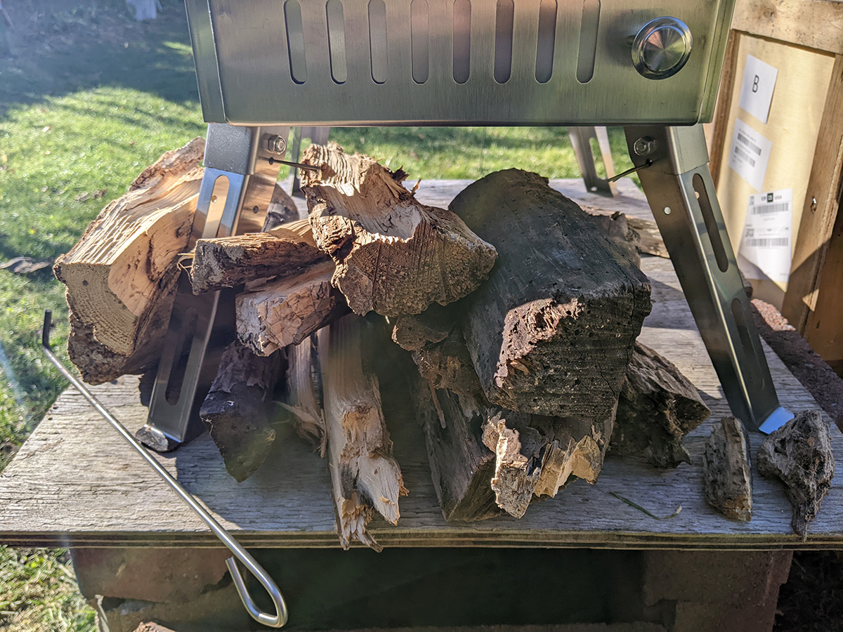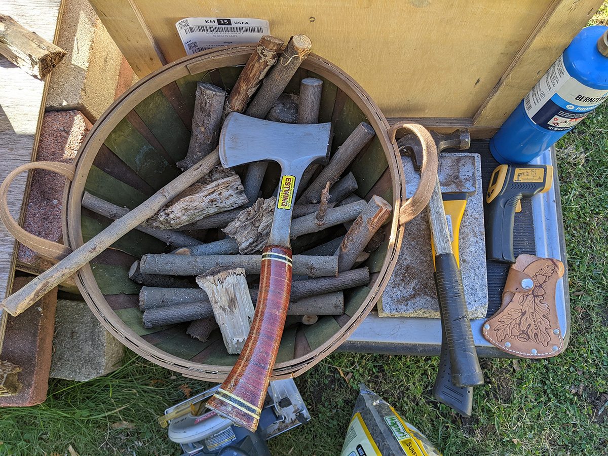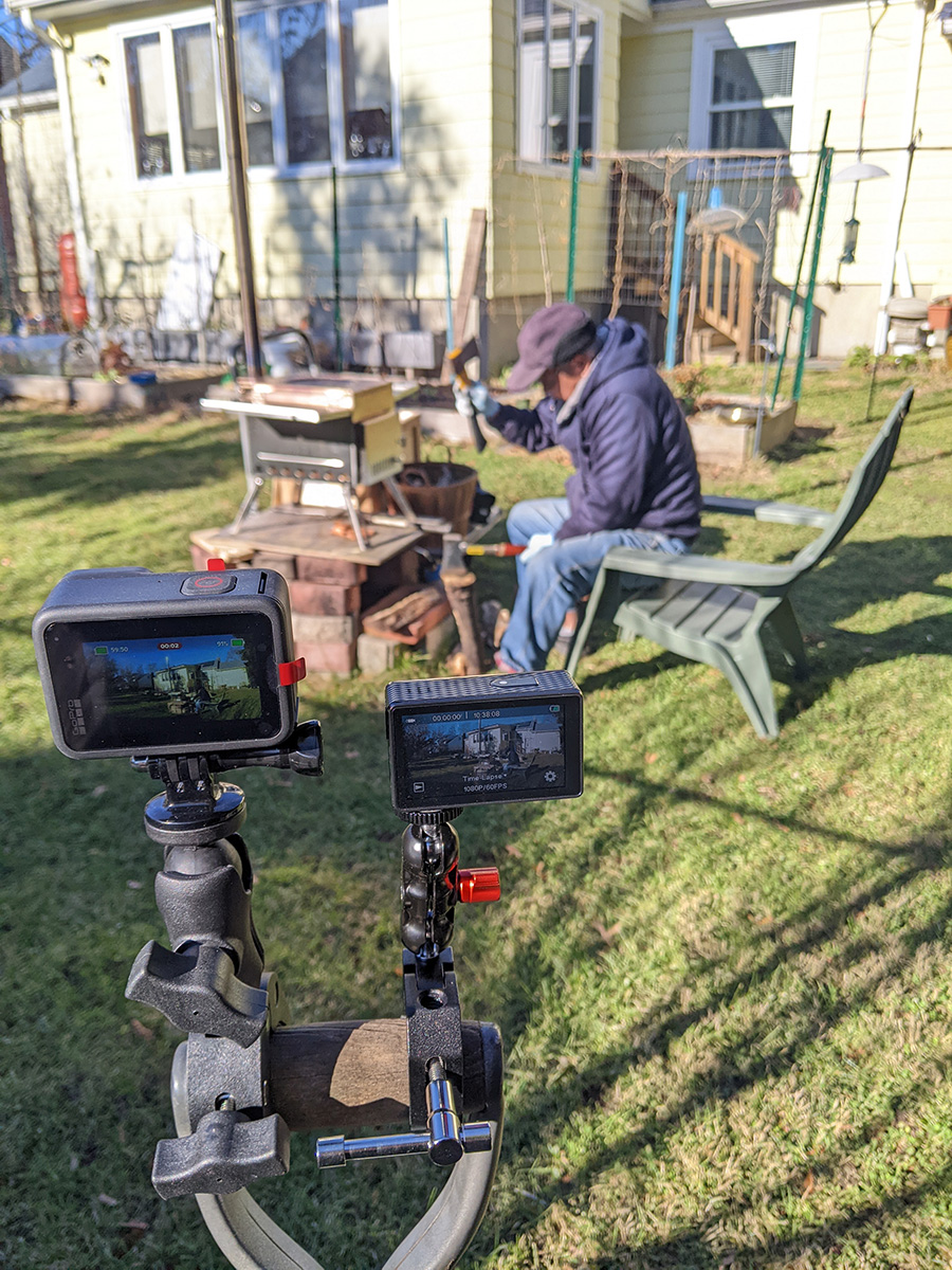 i found my father in the backyard with his tent stove setup, burning some backyard firewood, a combination of pine and cherry, had a fragrant sweet smell to it. it got really smokey at one point, the smoke falling instead of rising, until my father closed the damper, at which point the smoke subsided. i tried practicing my woodchopping skills using the estwing axe, but i only managed to split a few pieces of wood. once more i tried to get a side-by-side comparison video between the gopro and dbpower, and even though vibration wasn't an issue this time,