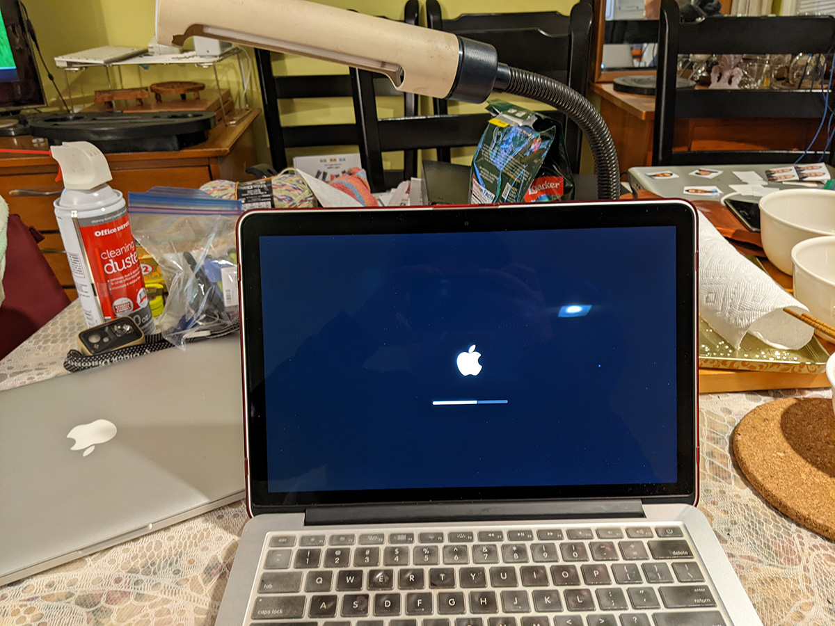 anyway, once the old drive was backed up, it was time to swap out the SSD. i didn't think i could do it because my tools were back at home, until i remembered i brought them here that time i swapped out the memory on that old malfunctioning macbook pro. with a pentalobe screwdriver, i removed the back of the macbook pro. inside was filled with dust and dog hair. i spent some time outside on the back stairs with a bottle of compressed air, blowing clean the inside of the laptop.
