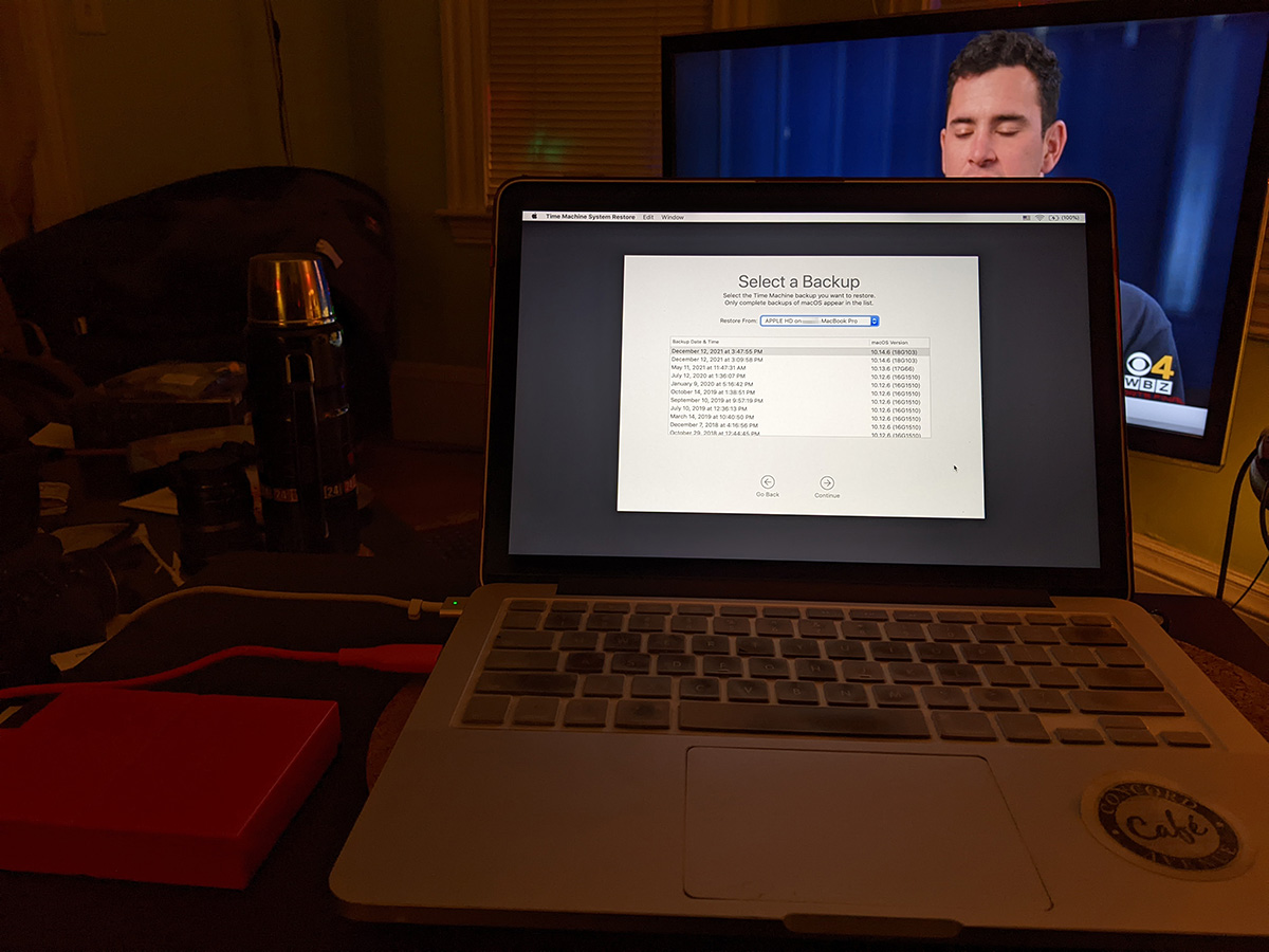 this bootable USB drive worked, but that's when i realized when booting from an external source other than the hard drive, i can do a time machine restore where it restores everything including whichever macos was backed up. so it didn't matter that i had high sierra on the 1TB, the restoration would bring back mojave. so i restored from time machine, which seemed to be going well, until i went to reboot from the restored hard drive and it wouldn't boot. it tried to boot, but after a few seconds of the apple screen, it'd go to black and nothing more.
