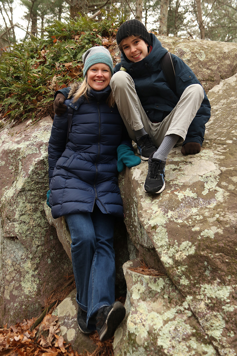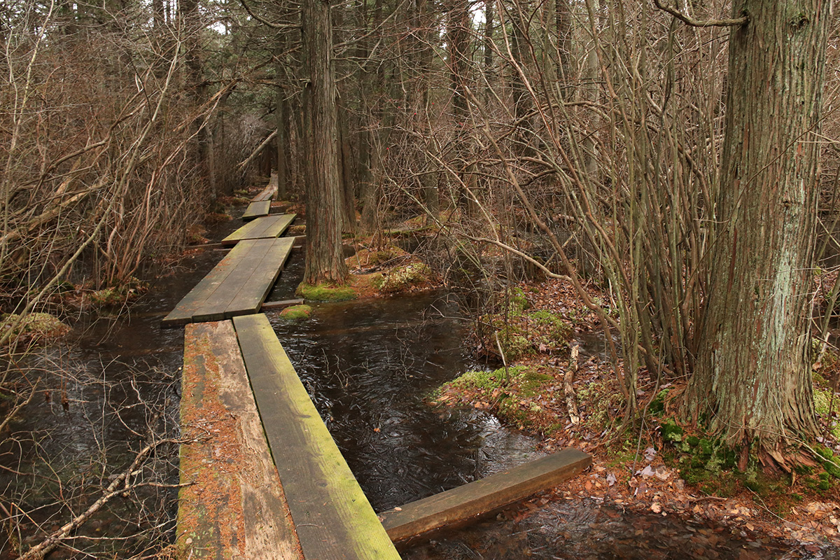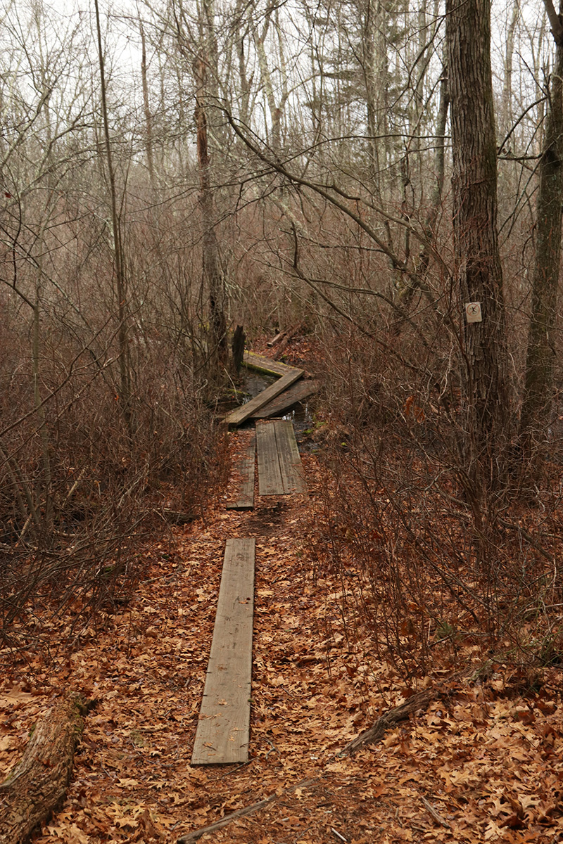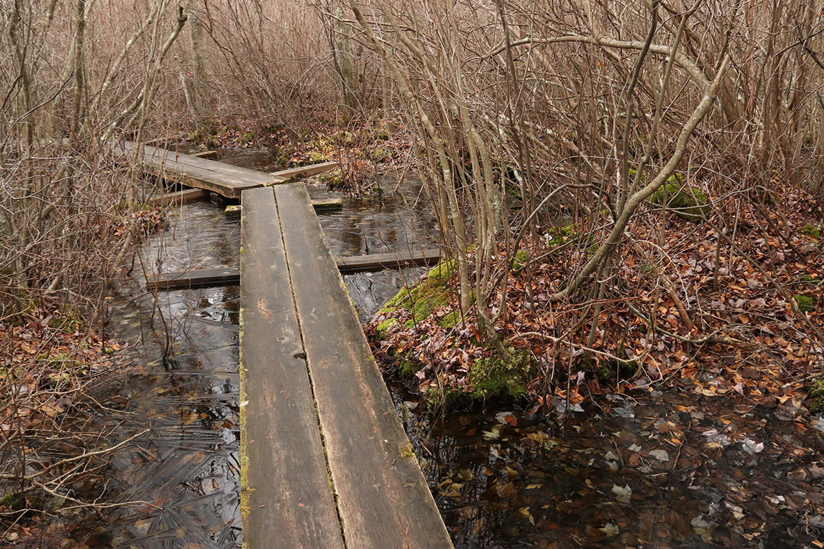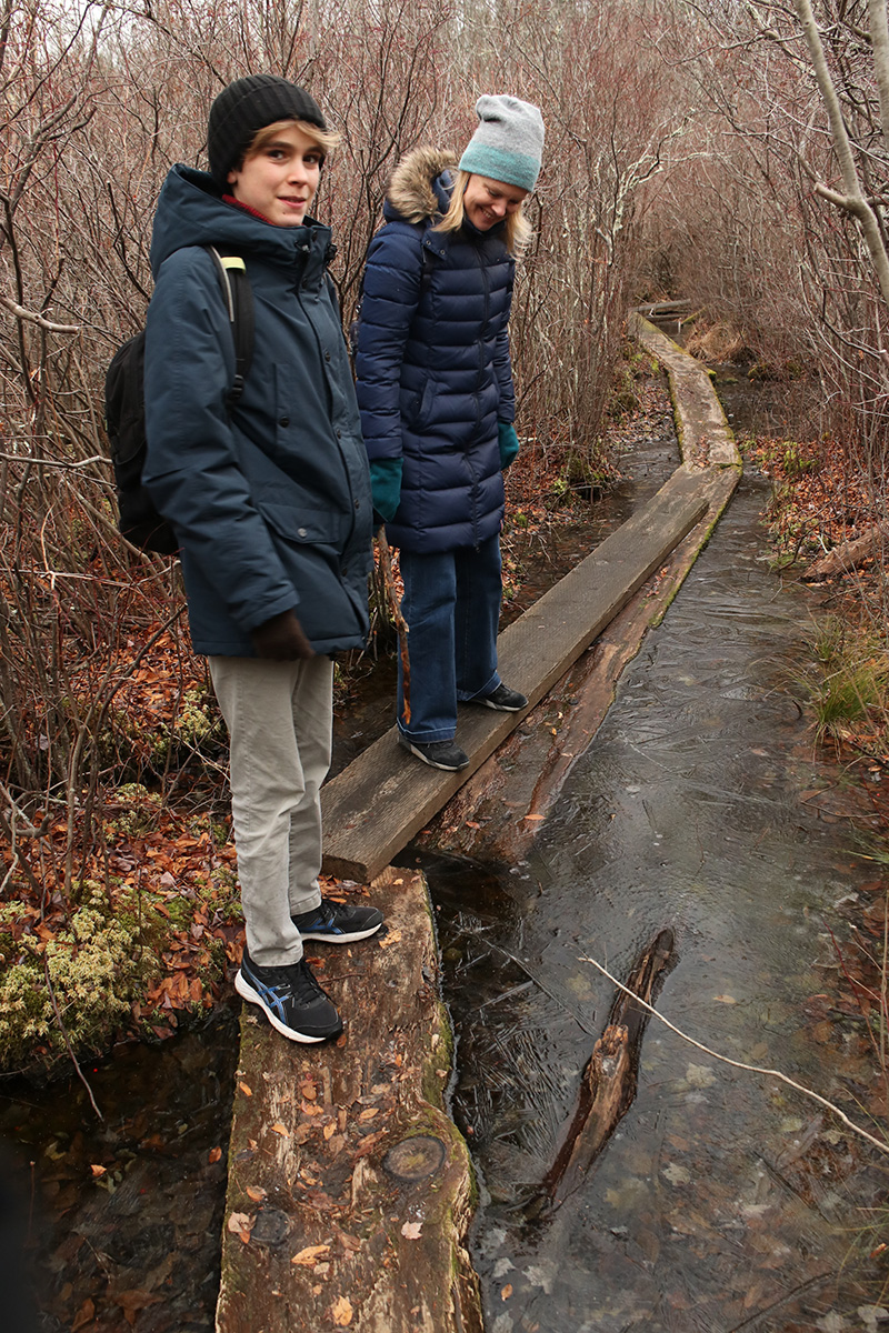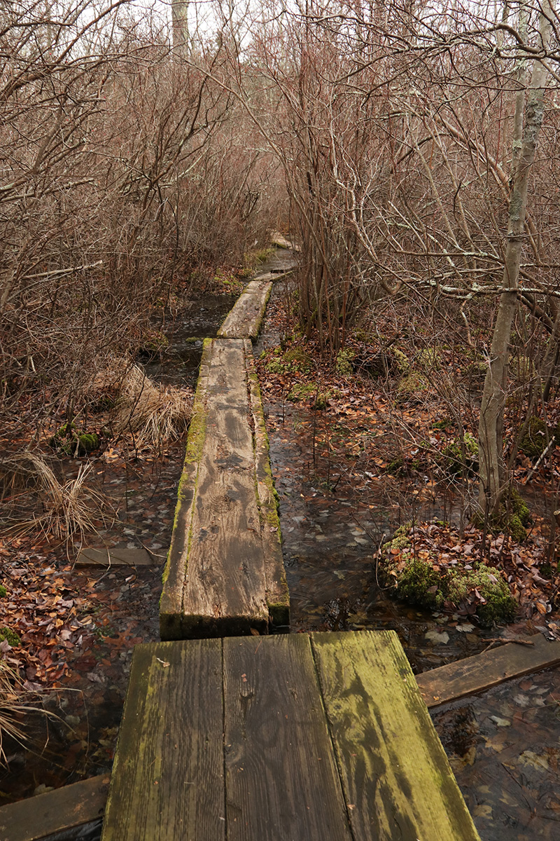 at 11:15am we came upon the trailhead for the bog. i could already see that the wooden planks were exposed and not underwater, unlike back in july. and the good thing about winter hiking is not needing bug repellent. we started walking into the bog.