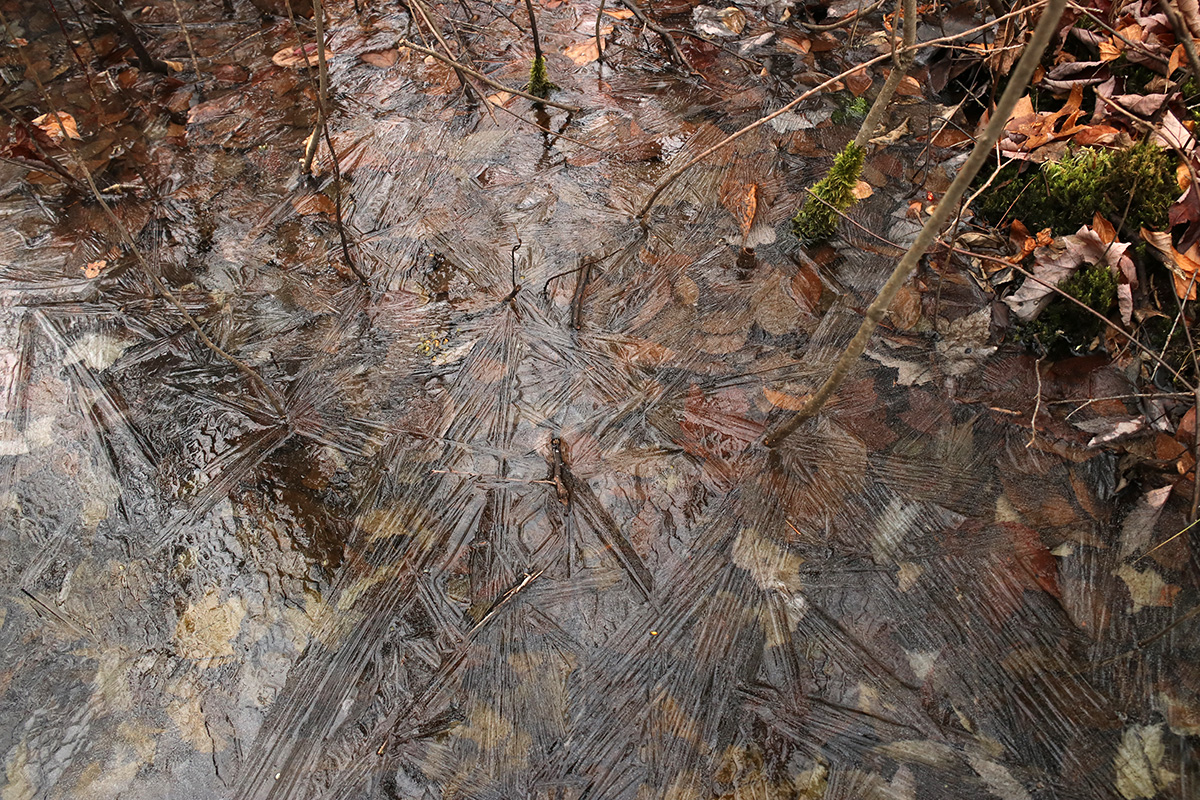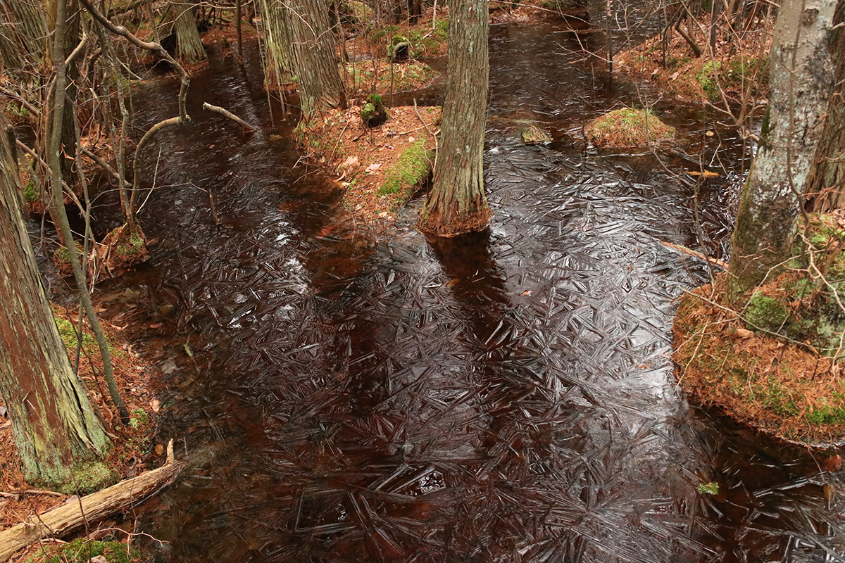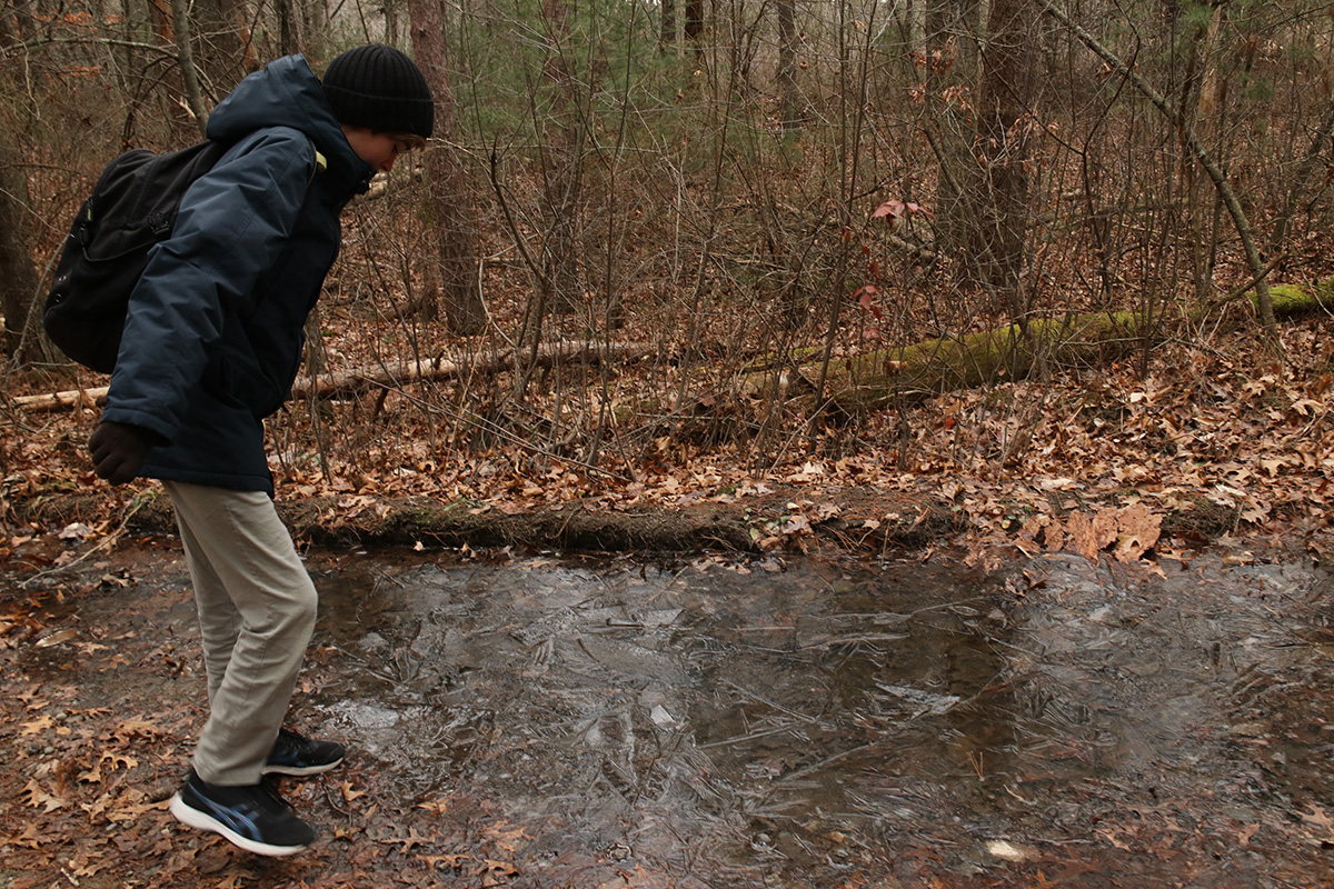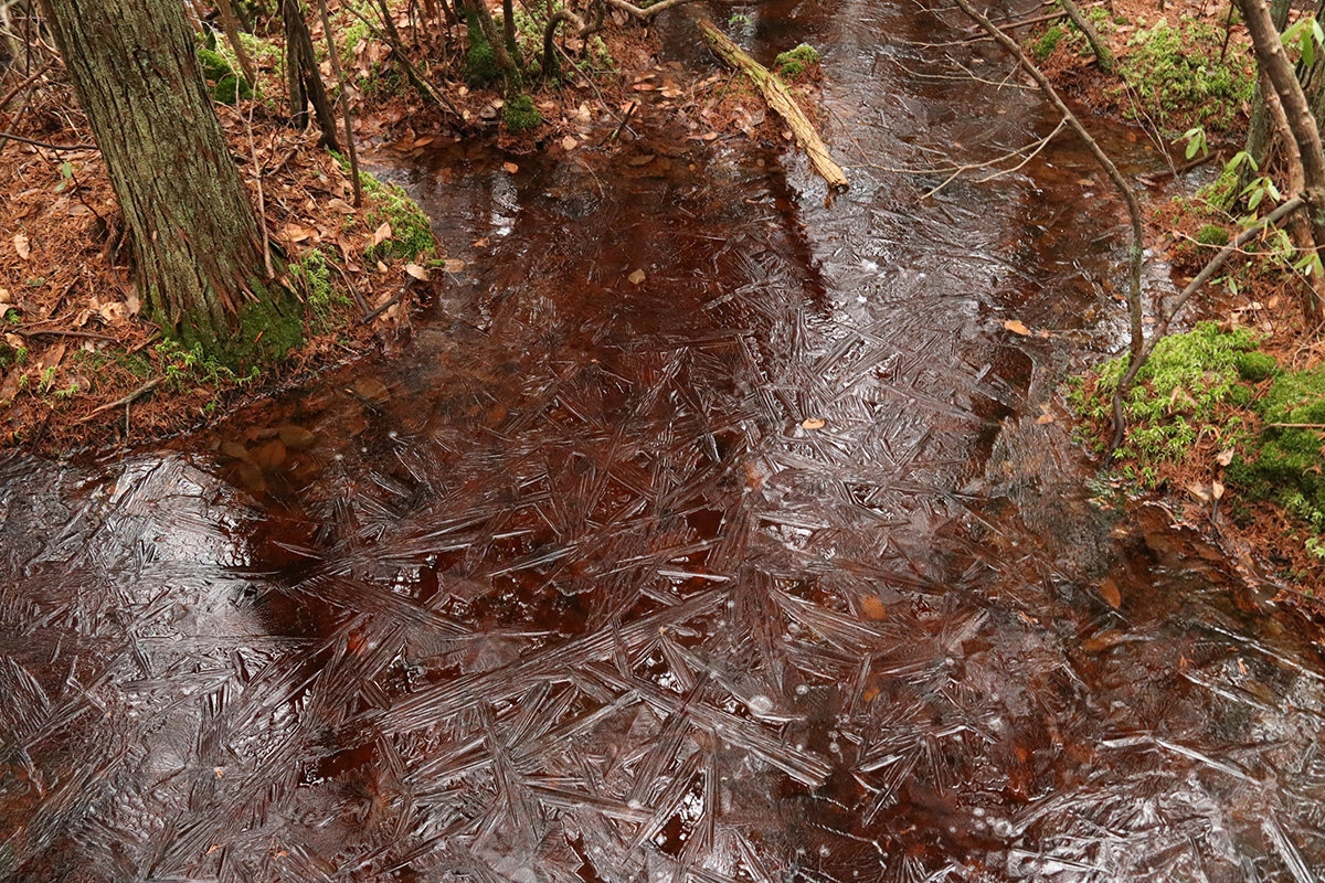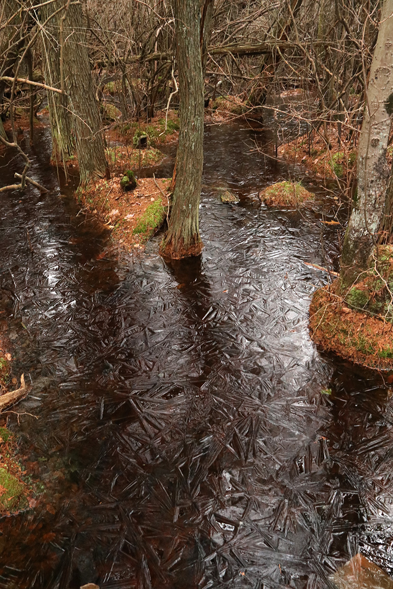 i've been to ponkapoag bog in the winter before, back in december 2004, more than 17 years ago. just like that time, the surface of the bog was covered in a thin layer of ice that looked like tightly stretched syran wrap. theo attempted to did in toe into the ice at several spots: some were easily broken, others harder to break, not even with a stick. the boardwalks were solid for the most part, though the deeper we walked into the bog, the more semi-submerged and covered in ice. we walked carefully so not to slip and fall. there was no danger of drowning, but getting soaked in freezing temperature would be no fun. like back in july, there was no discernible smell inside the bog. it also felt warmer in the bog, the water and the canopy acting like an insulator.