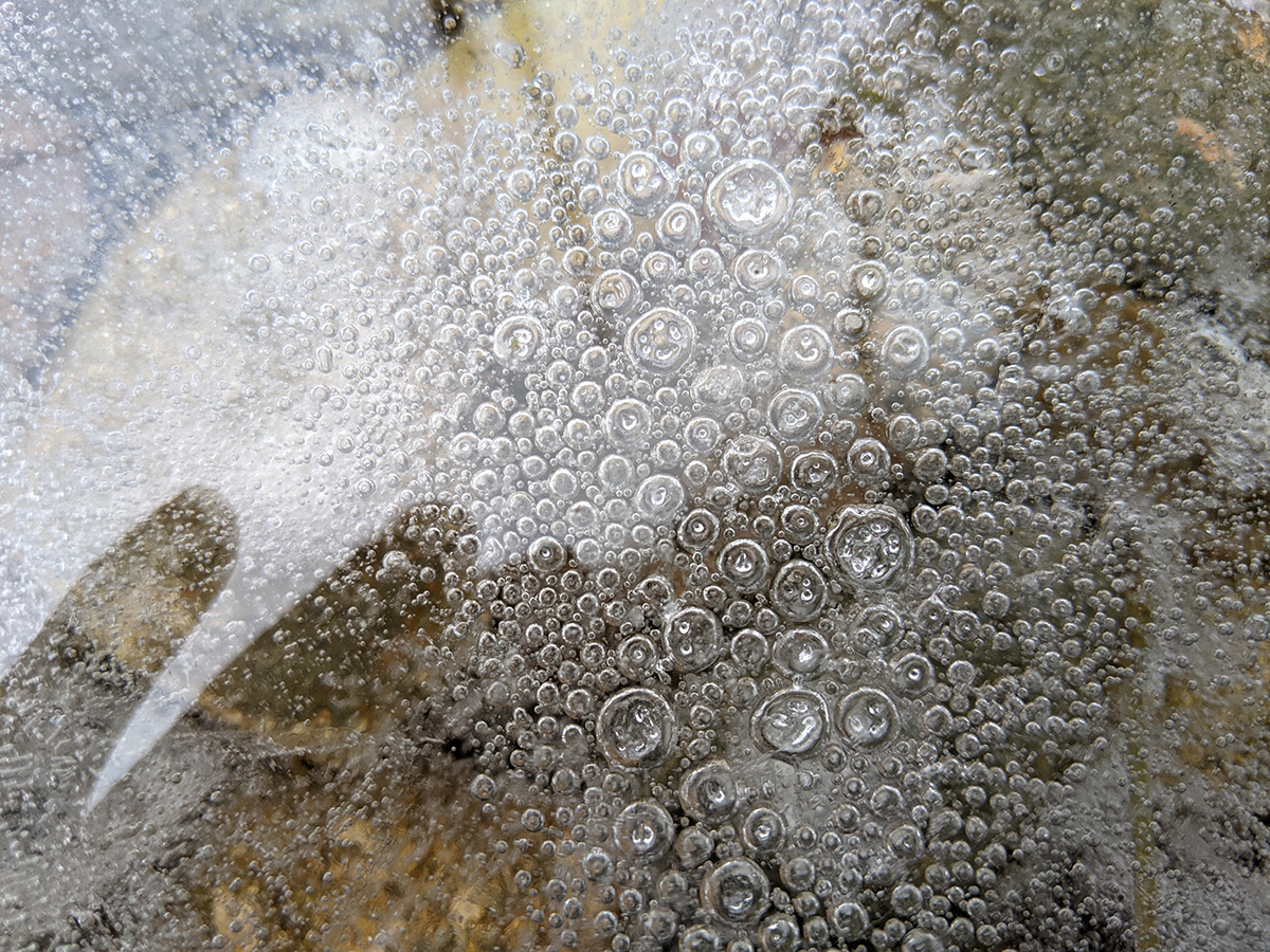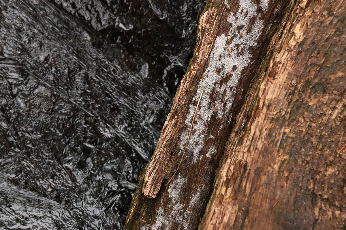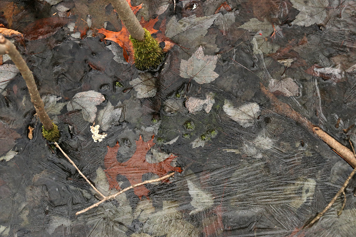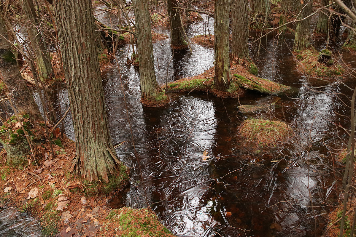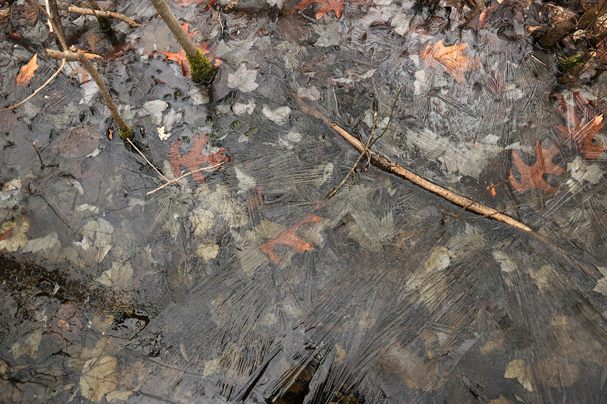 i've been to ponkapoag bog in the winter before, back in december 2004, more than 17 years ago. just like that time, the surface of the bog was covered in a thin layer of ice that looked like tightly stretched syran wrap. theo attempted to did in toe into the ice at several spots: some were easily broken, others harder to break, not even with a stick. the boardwalks were solid for the most part, though the deeper we walked into the bog, the more semi-submerged and covered in ice. we walked carefully so not to slip and fall. there was no danger of drowning, but getting soaked in freezing temperature would be no fun. like back in july, there was no discernible smell inside the bog. it also felt warmer in the bog, the water and the canopy acting like an insulator.
