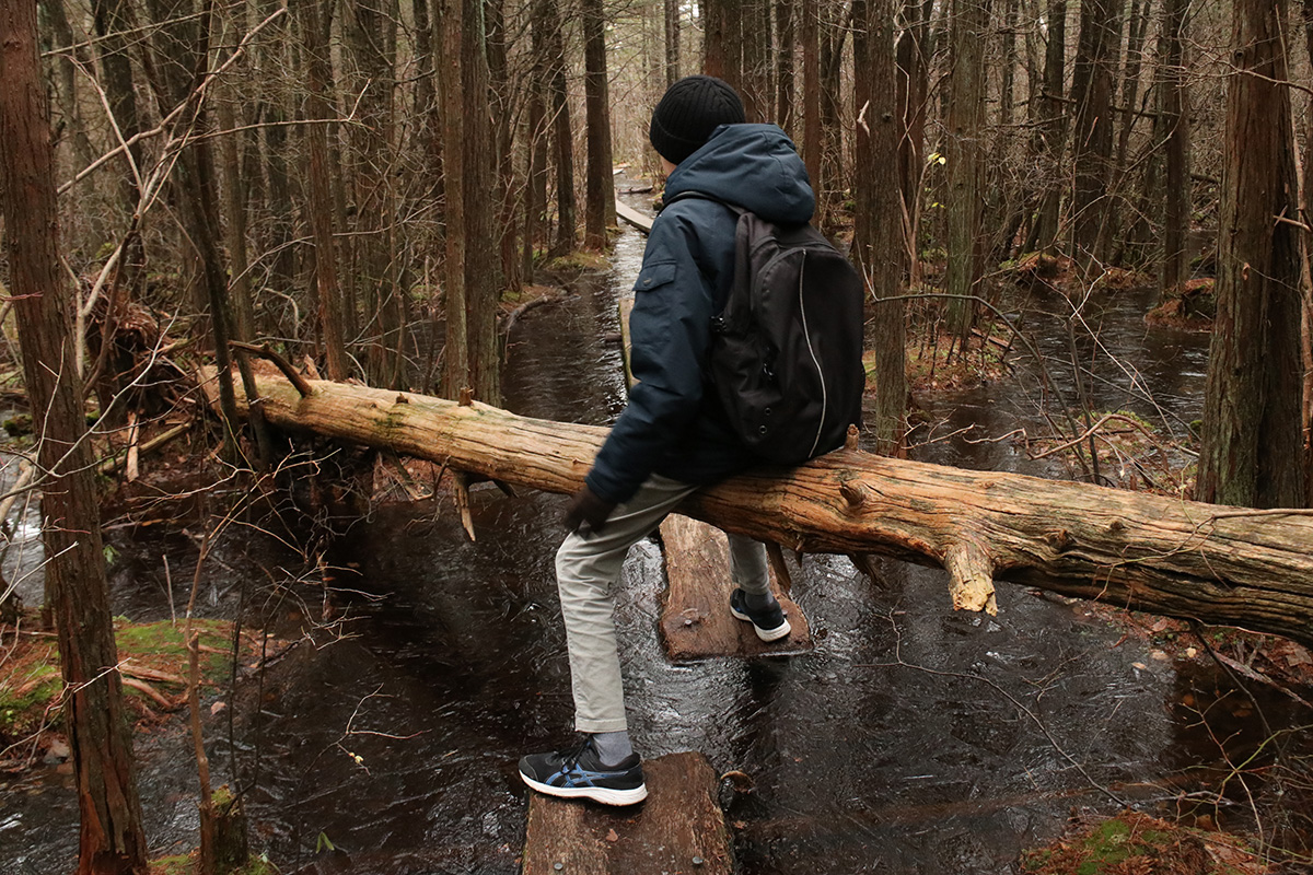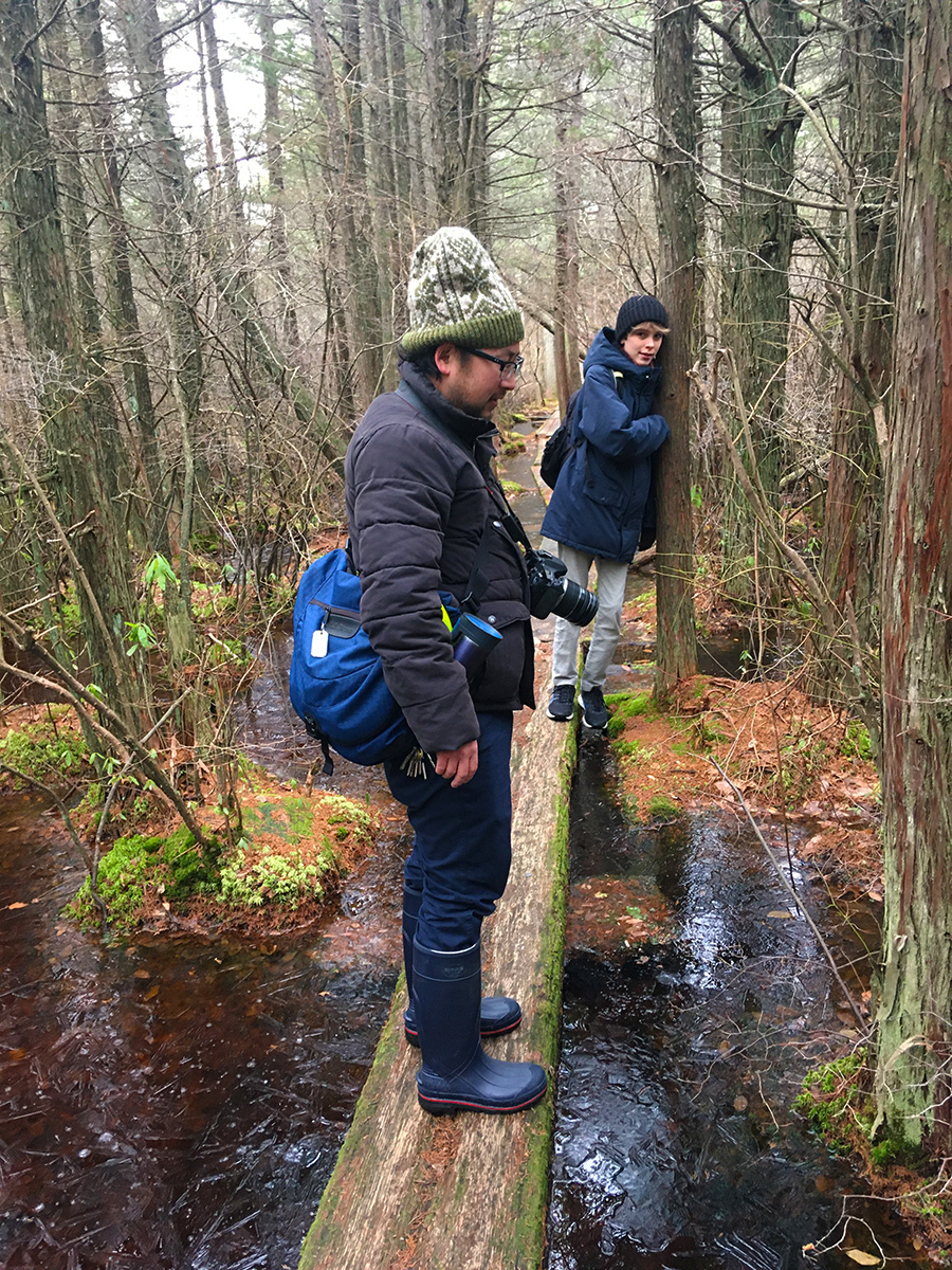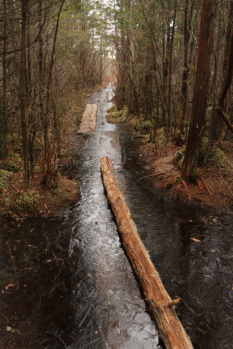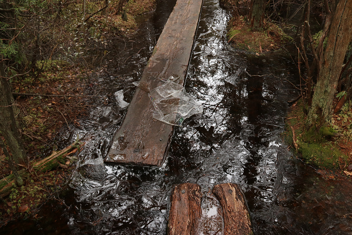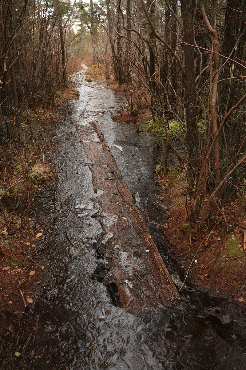 we were about midway into the bog before we saw two girls slowly walking out. i asked if they made it to the end, they said it was too treacherous. i asked if they at least go to the clearing, they told us they didn't even get that far, but could almost see it. so we stepped aside to let them pass. we kept on going, but got to a point the planks started to sink in the water. it wasn't a big deal for me because i had rubber boots, but eliza and theo would get their shoes soaked, so they decided to wait while i continued ahead. i didn't made it very far though. just like what the girls said, i could almost see the clearing, but the planks were under the water, and i had to break through a frozen top layer of ice just to go forward. i decided not to risk it, i'd already seen a few pitcher plants and that was the main reason why i was here, so i was good as far as our expedition went. i turned back and met up with eliza and theo and we slowly headed back out.