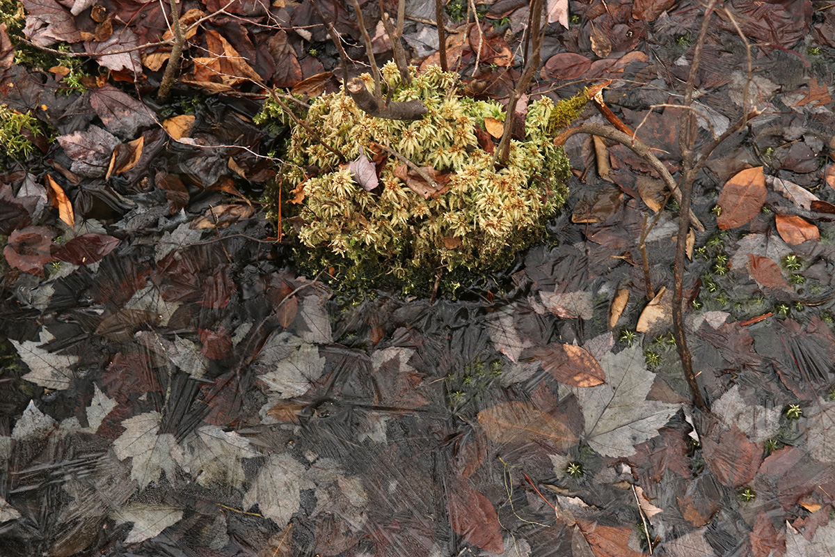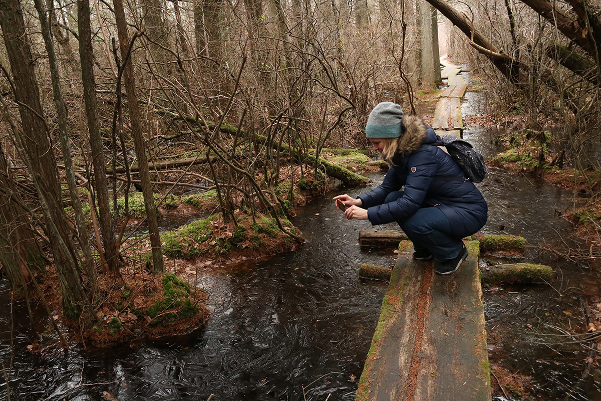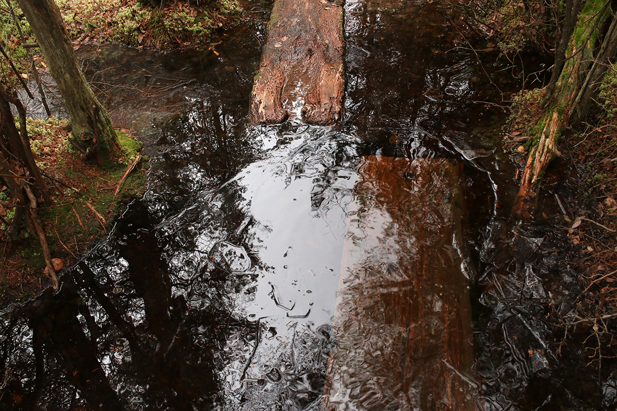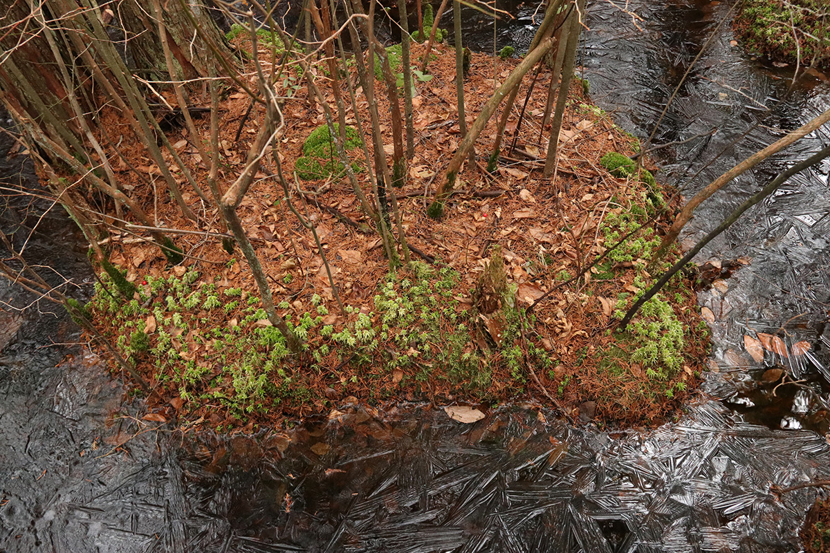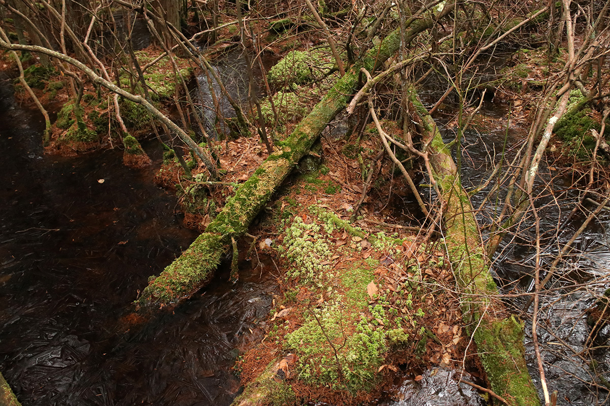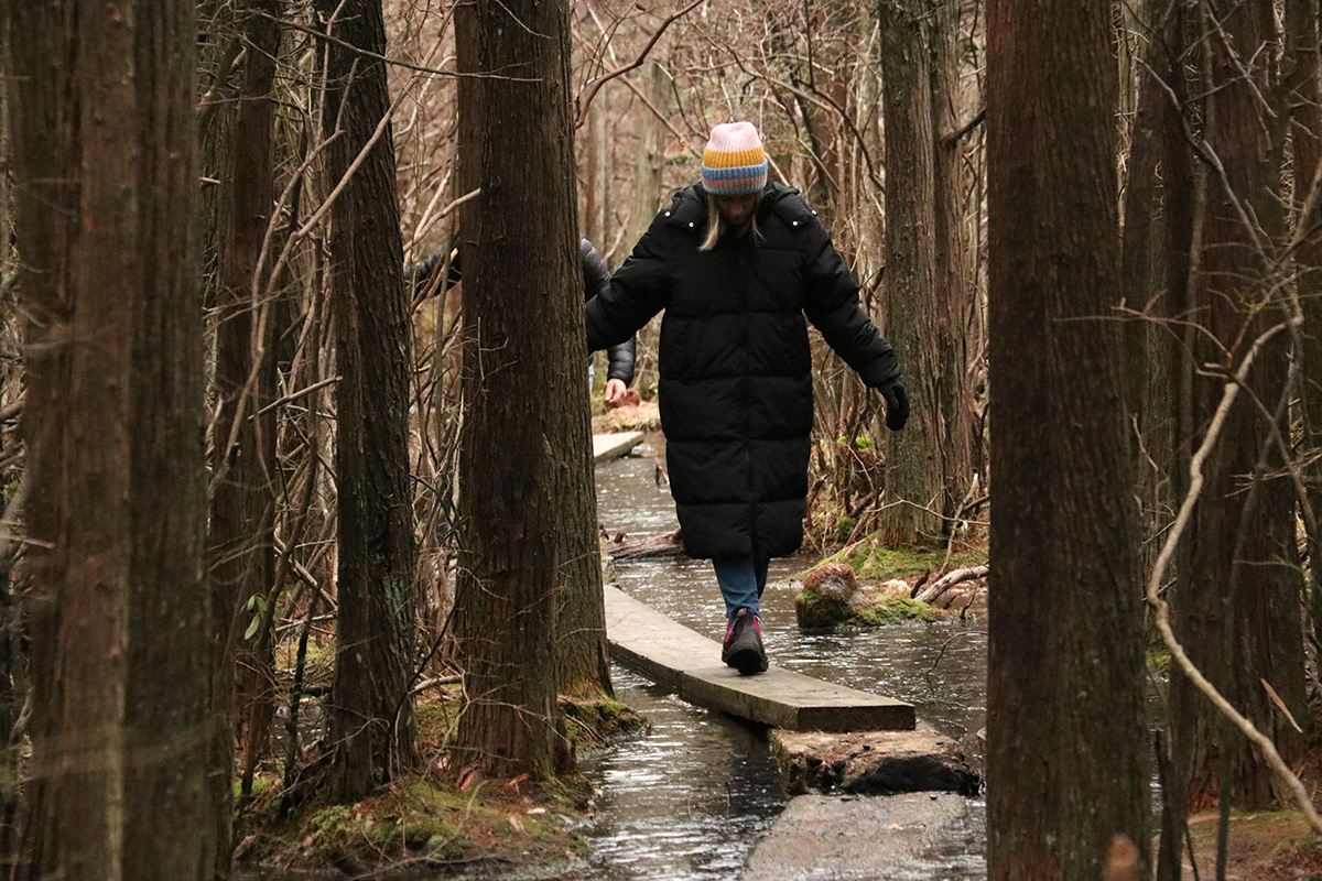 we were about midway into the bog before we saw two girls slowly walking out. i asked if they made it to the end, they said it was too treacherous. i asked if they at least go to the clearing, they told us they didn't even get that far, but could almost see it. so we stepped aside to let them pass. we kept on going, but got to a point the planks started to sink in the water. it wasn't a big deal for me because i had rubber boots, but eliza and theo would get their shoes soaked, so they decided to wait while i continued ahead. i didn't made it very far though. just like what the girls said, i could almost see the clearing, but the planks were under the water, and i had to break through a frozen top layer of ice just to go forward. i decided not to risk it, i'd already seen a few pitcher plants and that was the main reason why i was here, so i was good as far as our expedition went. i turned back and met up with eliza and theo and we slowly headed back out.