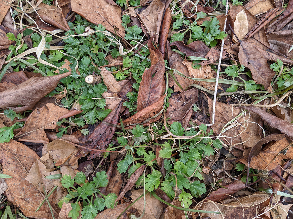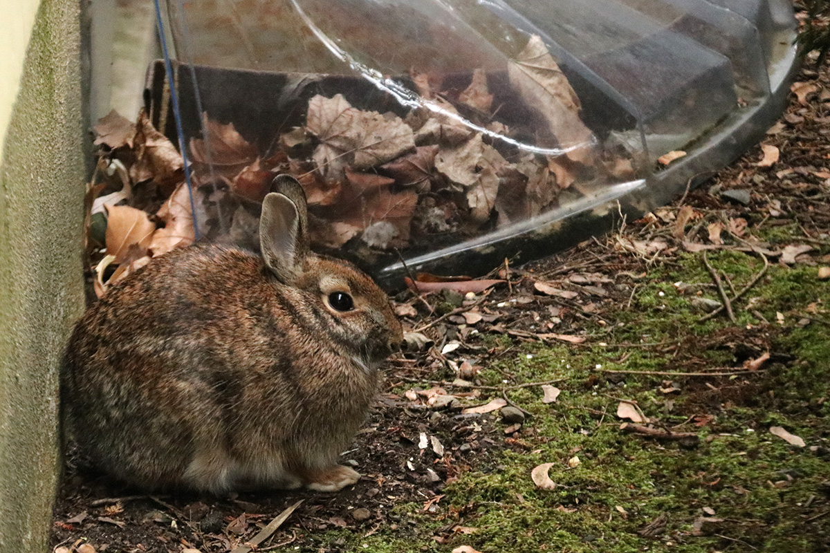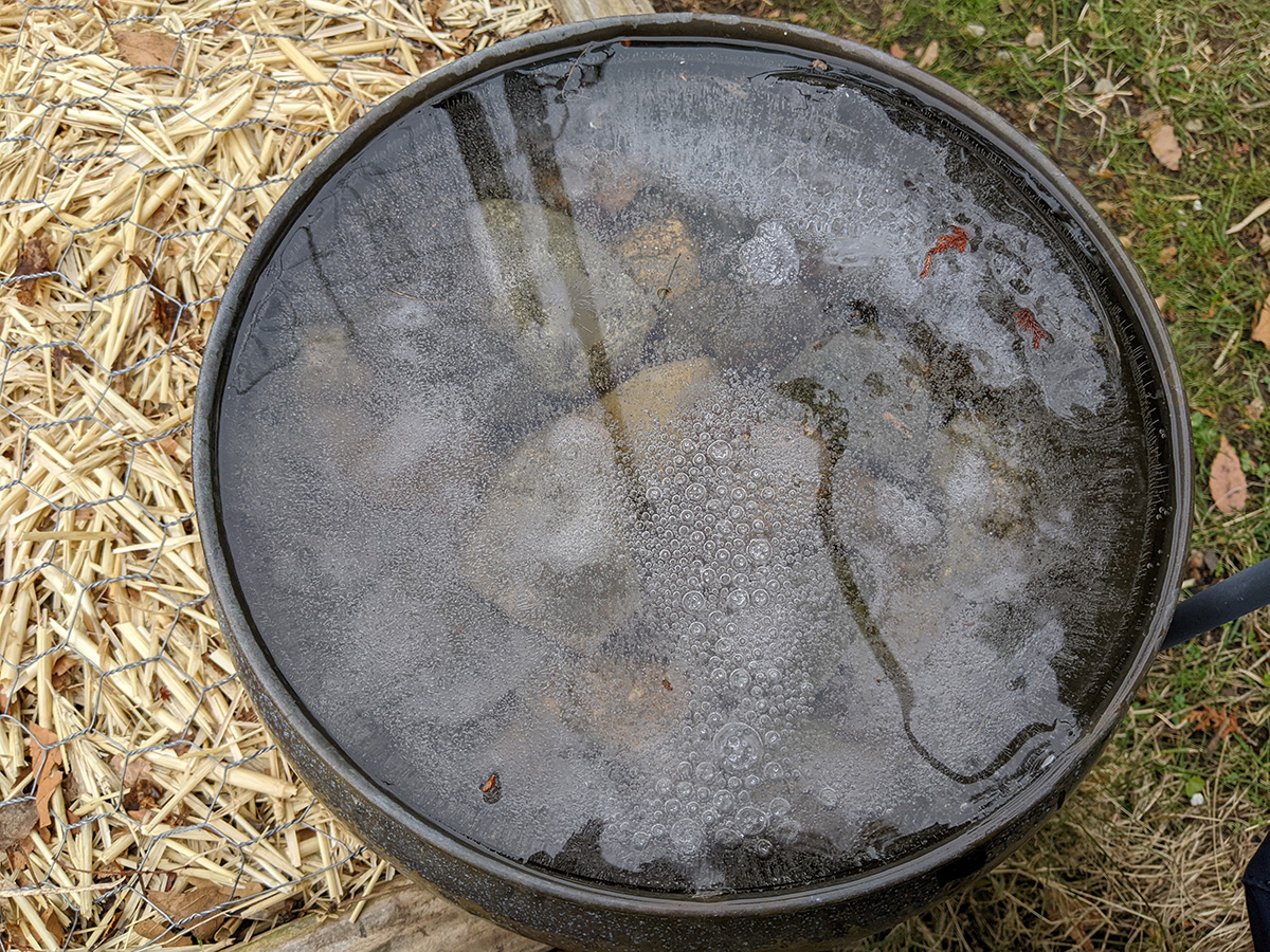 i was out in the backyard doing an inspection. all the bird baths were iced up, i tried to remove the ice layer whenever possible. i inspected the daikon radishes and removed that one green caterpillar i saw in a photo from yesterday. out in the front yard, i saw a fluffed-up rabbit hiding in the bushes behind the house. i made it nervous and saw it hopping away.