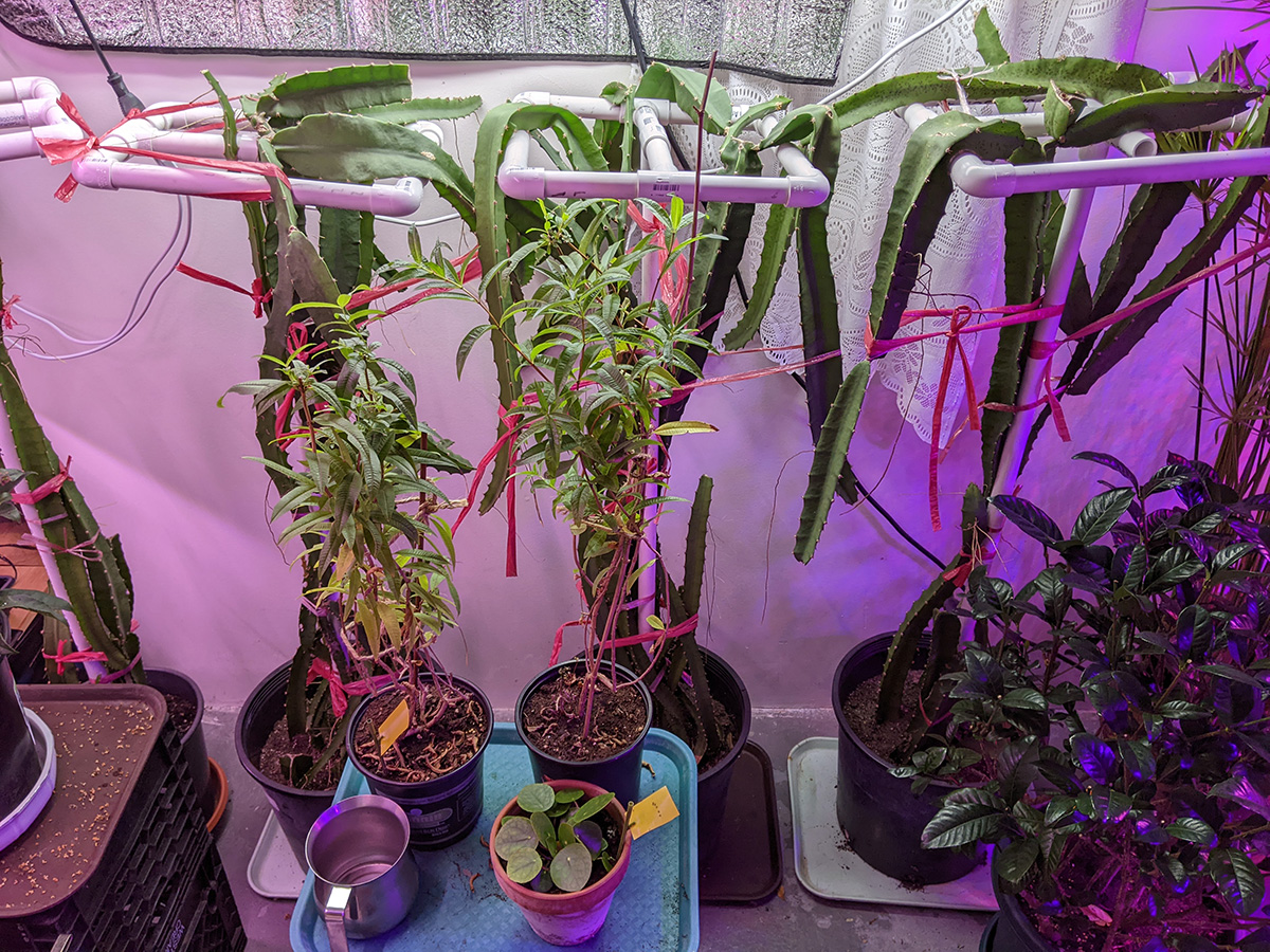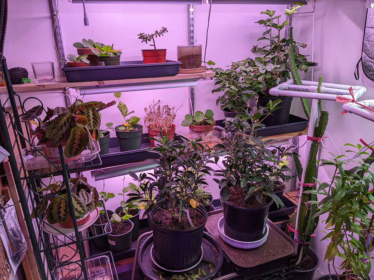 i made a quick check of the basement grow room. my father seemed to be watering the plants. only thing i did was remove the jade plant and spray it with neem oil. i also topped off the water of the reed plants. the fudingzhu osmanthus continue to lose its leaves. at this point we think maybe because we gave it too much fertilizer. but good news it seems to be making new leaf buds. the other home depot osmanthus - the one who didn't repot - that one seems to be doing well.