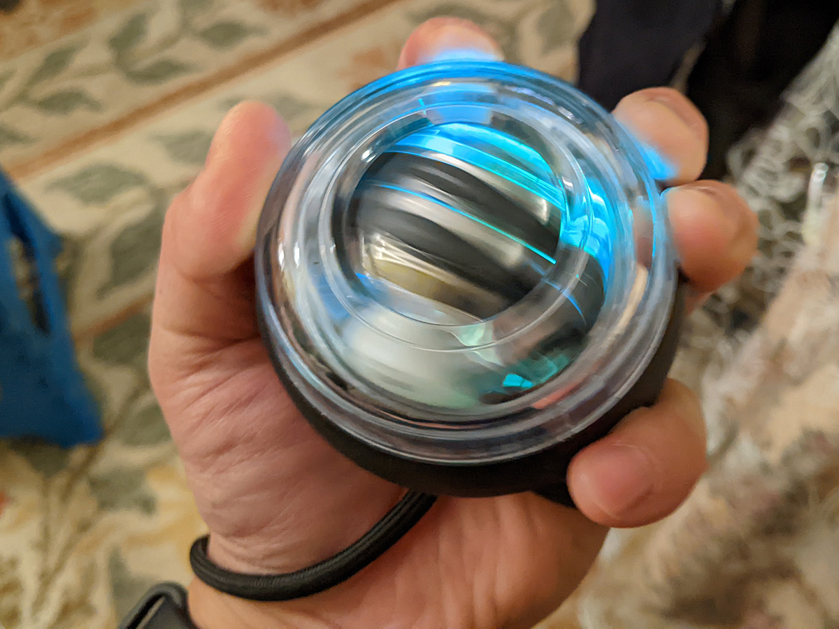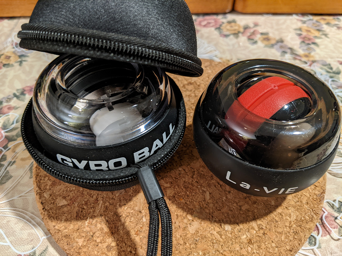 my father's gyro ball arrived early. the brand is JIN BD, some chinese brand. the one that we got has rainbow lights, not just red like the one alex got me from japan. the shell is completely translucent, so it's easier to see the mechanisms inside, like the electromagnet components. it came with a safety strap and a zippered pouch - neither of which was included with my gyro ball. it also has prettier lights, flashing in a myriad of colors while spinning. my father even tried it using two hands with my gyro ball.