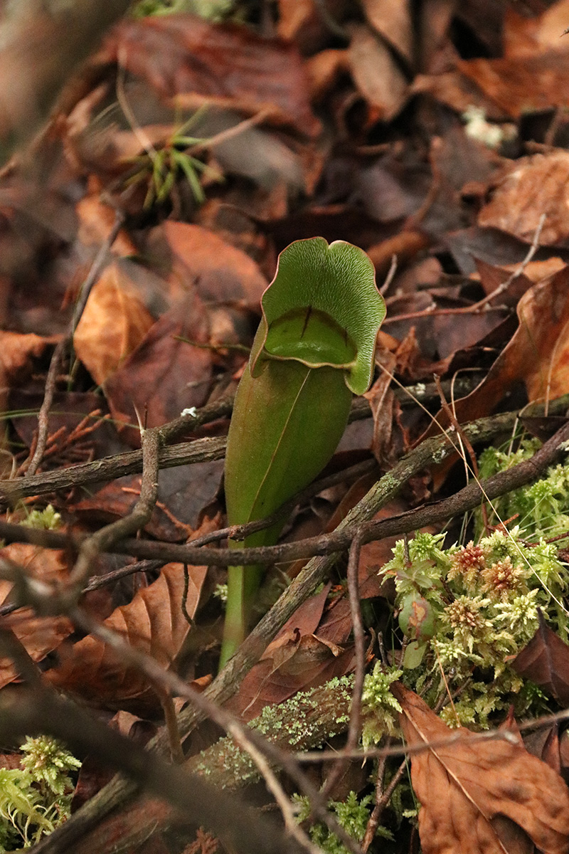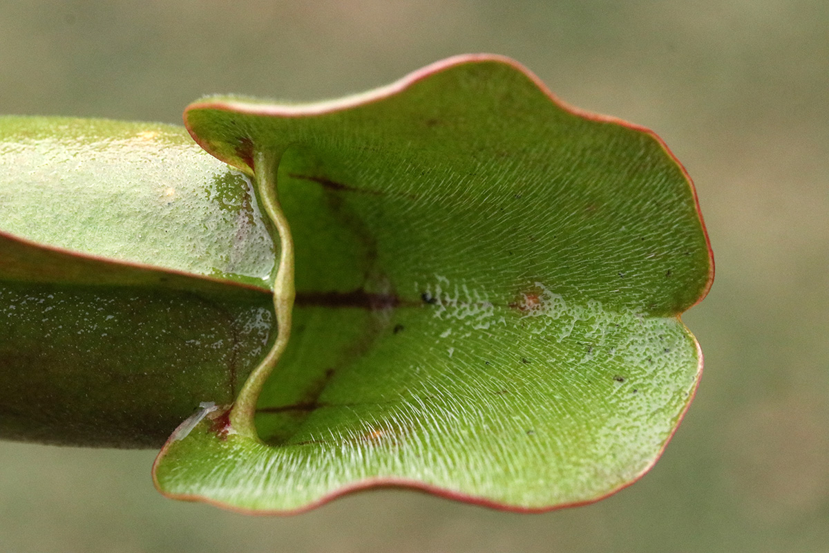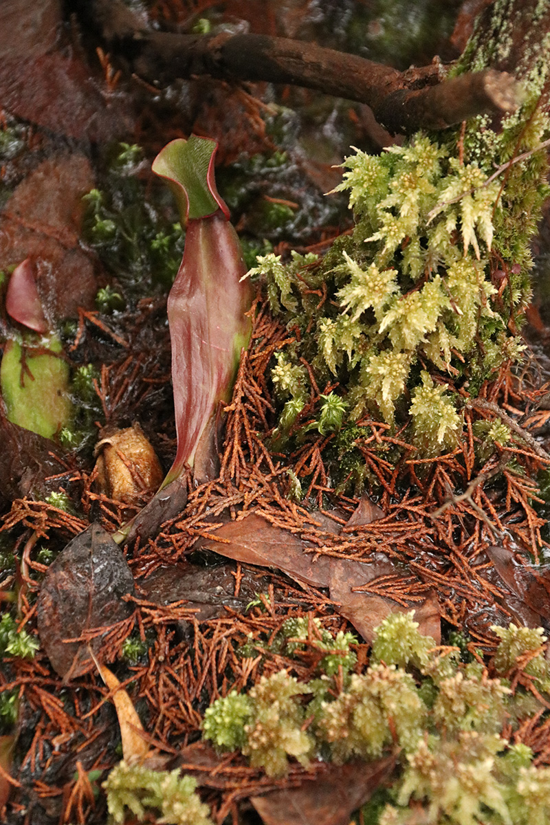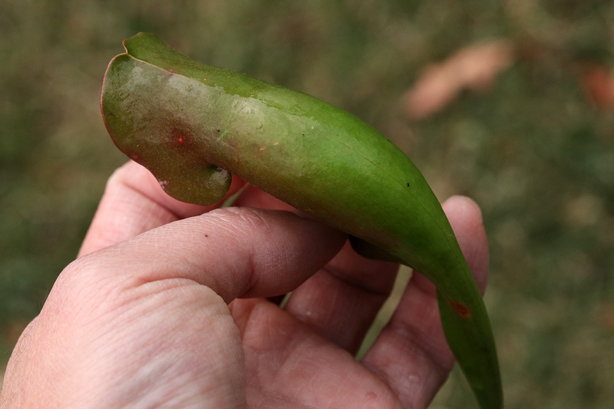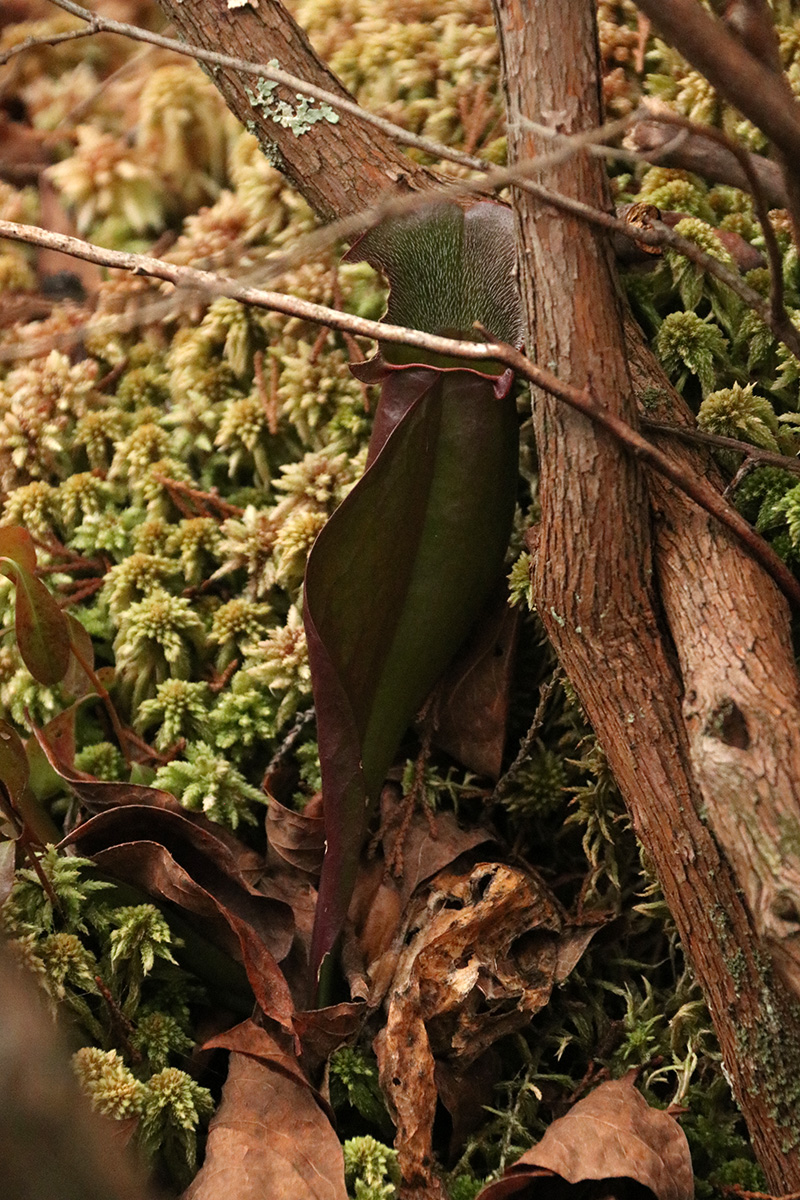 i found a broken pitcher plant at ponkapoag and forgot i put it in my bag. it gave me a chance to study it more in details. there was a frozen ice pellet in the pitcher itself, and some bog detritus. i didn't see any bugs, insect activities probably stopped months ago.