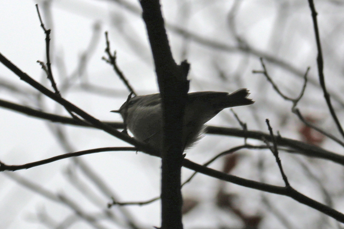 theo was hoping to see some ice puddles so he could crack them (like mother like son); eliza was worried he'd get his shoes wet. the only bit of wildlife we saw was early on in our walk to the bog, when a group of tufted titmice landed in front of us then flew up into the trees. i was just thinking the other day that i've never seen a tufted titmouse before, at least not that i can remember, even though they're supposedly a common birdfeeder feed. maybe there are just no populations of them where my parents live, which is where i do the bulk of my birdwatching from. i didn't have my camera ready at the time, and by the time i pulled it out of my bag, the birds were up in the trees, and i could only capture silhouettes at best with the bright clouds in the background.