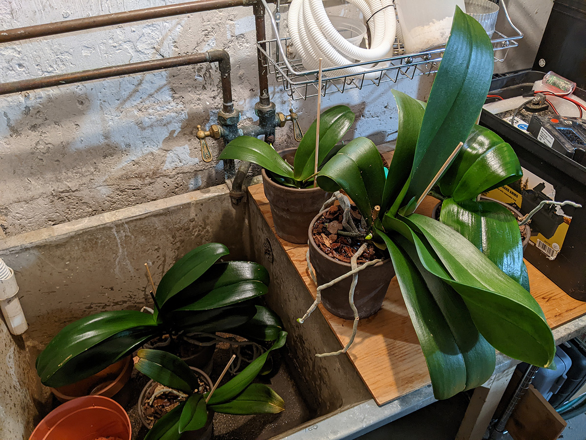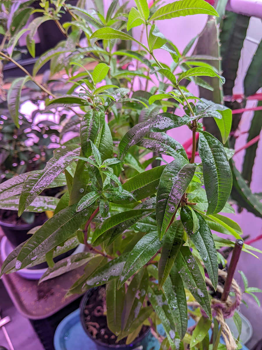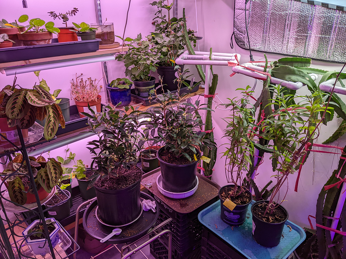 first thing i did when i got to belmont was to water the plants in the grow room. yesterday we soaked two buckets of rain water with mosquito bits, and today used them to do a soil drench. all things considered, the plants have been relatively free of bugs. there's still some fungus gnats, but not the infestation levels i've seen in the past before we starting doing Bti-treated soil drenches. inspecting the jasmines, i did find a few mealybugs which i sprayed with neem oil. i'm wondering if the systemic pesticide is working because we haven't seen any infestations. i also found a few mealybugs on the gardenia which i treated with some neem oil spray as well. now that we trimmed the cactuses, the aphids have moved onto the lemon verbana. i treated them with insecticidal soap. later i soaked the orchids with Bti-infused water spiked with a bit of orchid fertilizer.
