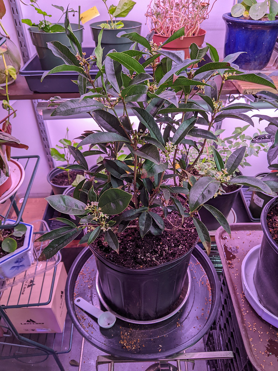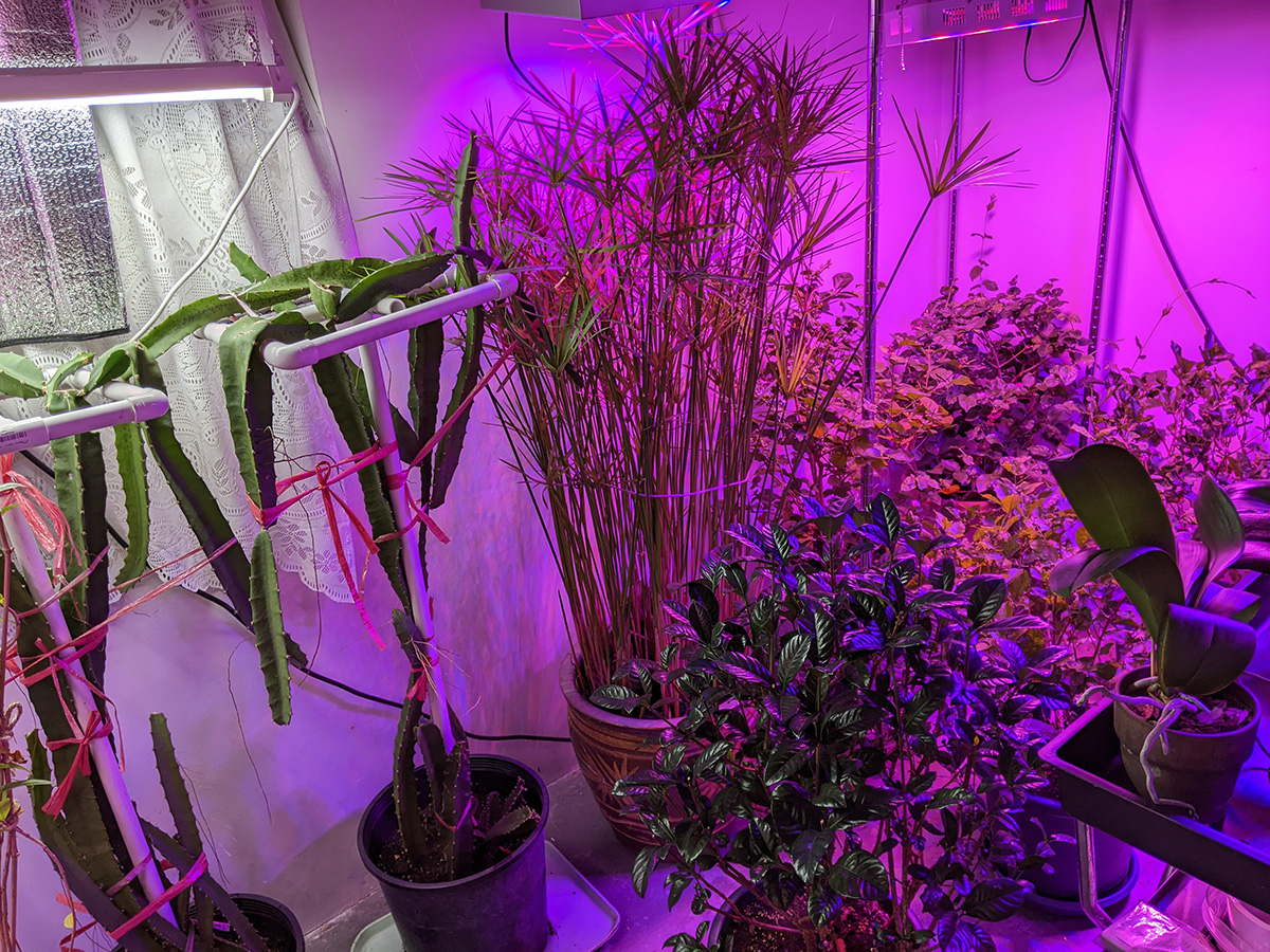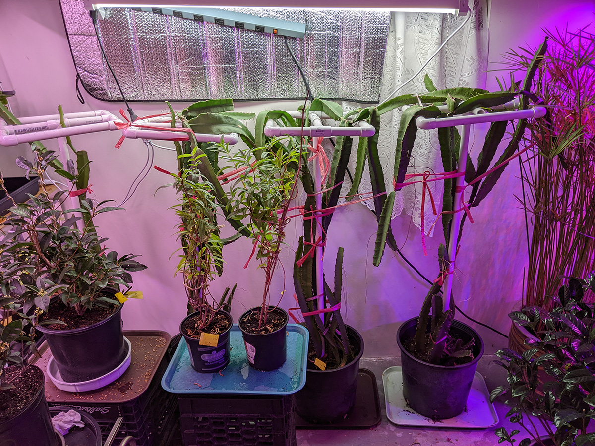 first thing i did when i got to belmont was to water the plants in the grow room. yesterday we soaked two buckets of rain water with mosquito bits, and today used them to do a soil drench. all things considered, the plants have been relatively free of bugs. there's still some fungus gnats, but not the infestation levels i've seen in the past before we starting doing Bti-treated soil drenches. inspecting the jasmines, i did find a few mealybugs which i sprayed with neem oil. i'm wondering if the systemic pesticide is working because we haven't seen any infestations. i also found a few mealybugs on the gardenia which i treated with some neem oil spray as well. now that we trimmed the cactuses, the aphids have moved onto the lemon verbana. i treated them with insecticidal soap. later i soaked the orchids with Bti-infused water spiked with a bit of orchid fertilizer.