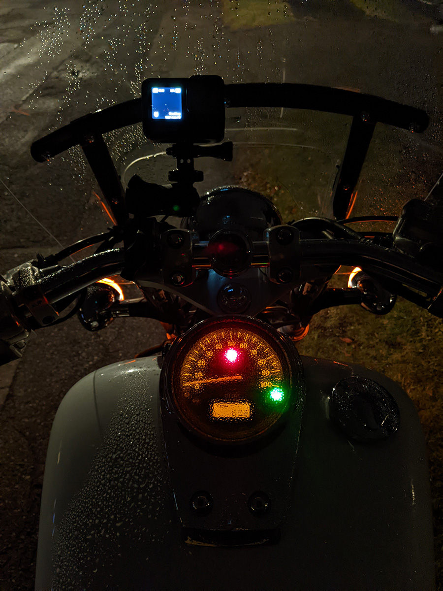 i left soon after i finished eating. i wanted to make it home early so i could get a parking spot. the forecast for tomorrow is frigid temperatures and the possibility of a dusting of snow, so i don't know if i want to ride the motorcycle or not. the motorcycle was covered with condensation. i mounted the gopro on the handlebar to shoot a timewarp selfie. i've never actually seen myself riding before, i'm actually pretty emotionless. that's not the case when i ride the bicycle, i'm grimacing and straining as i pedal up hills.