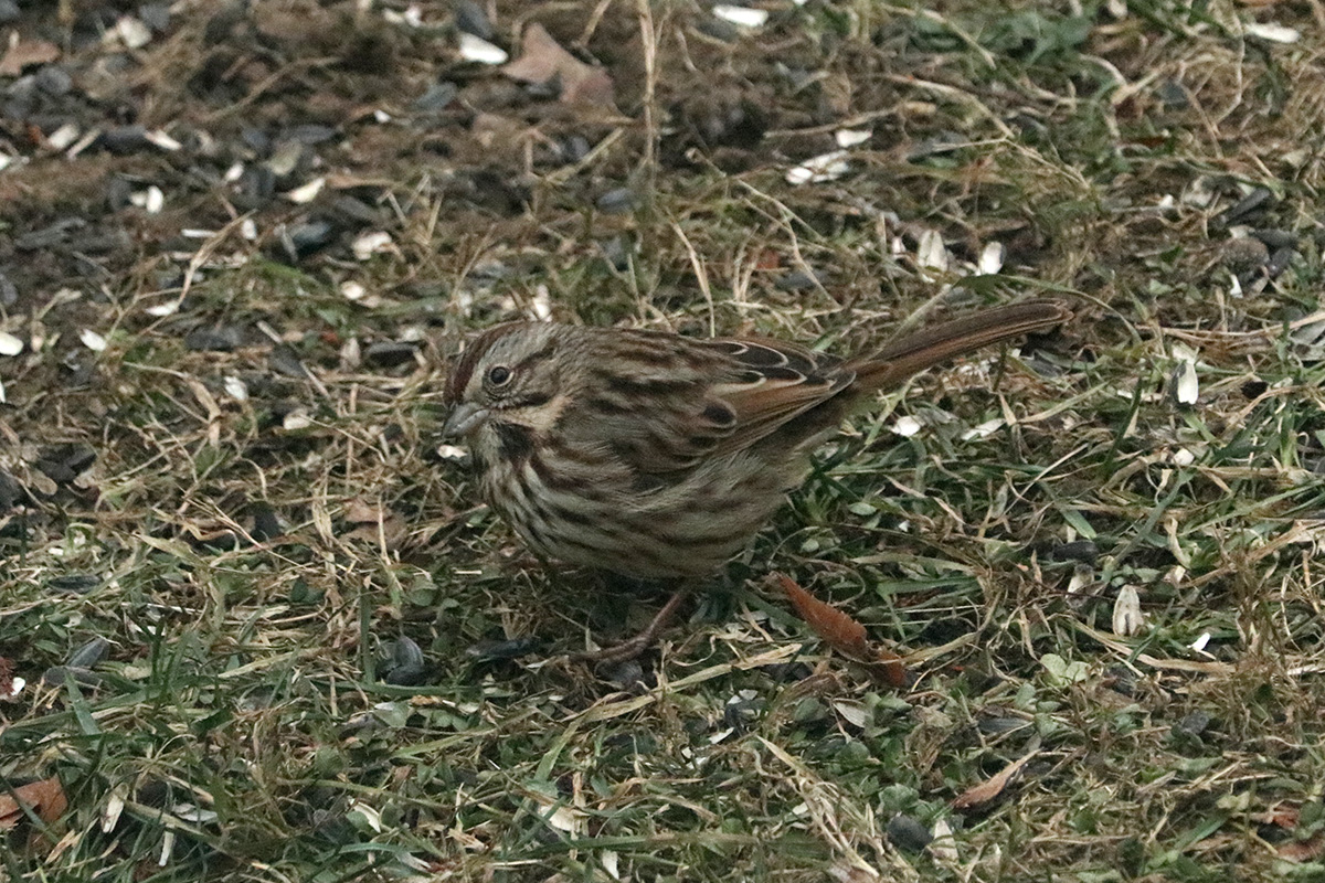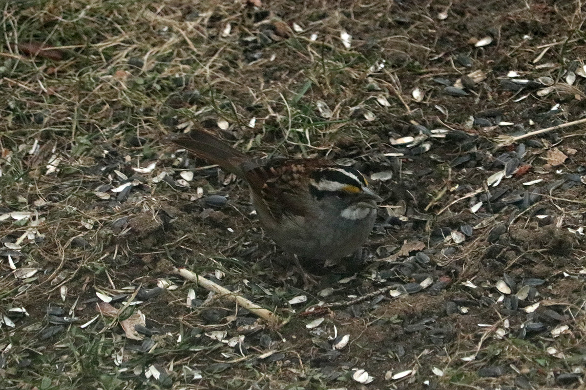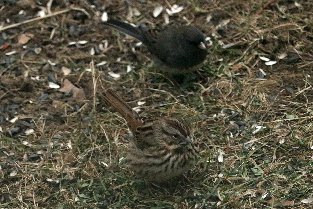 cold weather brings the birds to the feeder. there was a flock of junco - dark grey and browns - pecking on the ground below the feeders. one of them even perched on the squirrel buster to get seeds, while another landed on top of the suet feeder and pecked at the suet. i've always thought of juncos as simple ground feeders. there was also a female cardinal. it's unusual because usually cardinals come in pairs. what happened to the male? i only ever see this one female. there was a song sparrow, followed by a pair of white-throated sparrows. the white-throats were kind of aggressive, chasing the other birds away. i didn't see any chickadees nor any downy woodpeckers, those usually come to the feeders. i wonder if someone else has a feeder with better food, and those birds are going elsewhere.