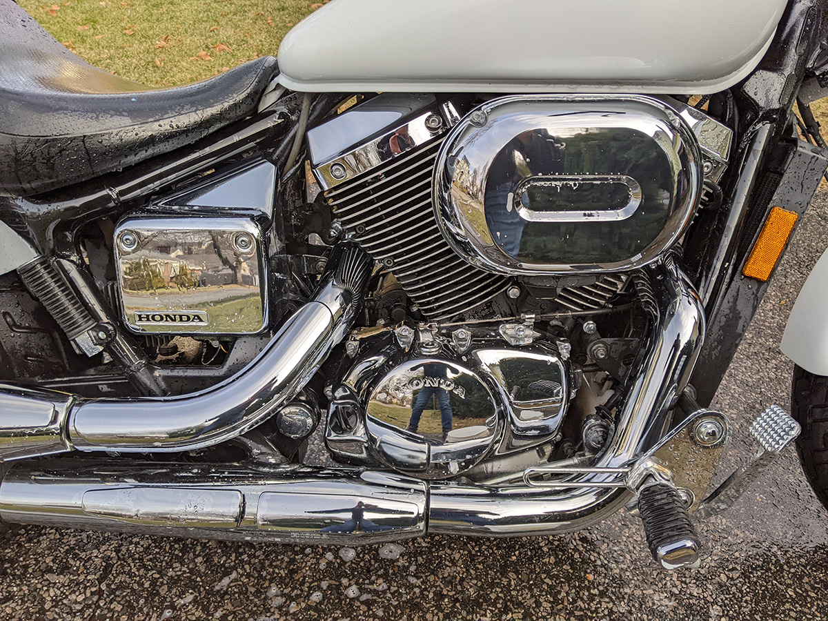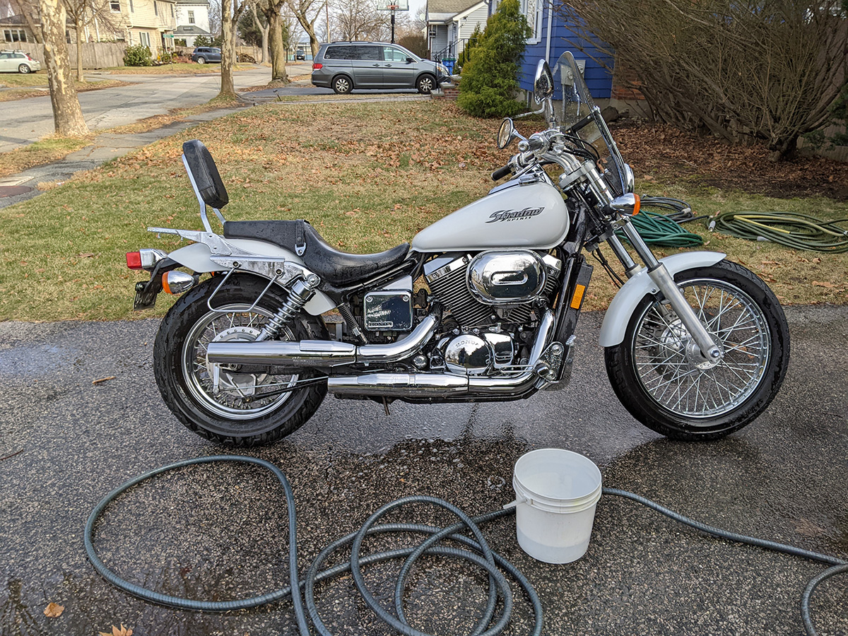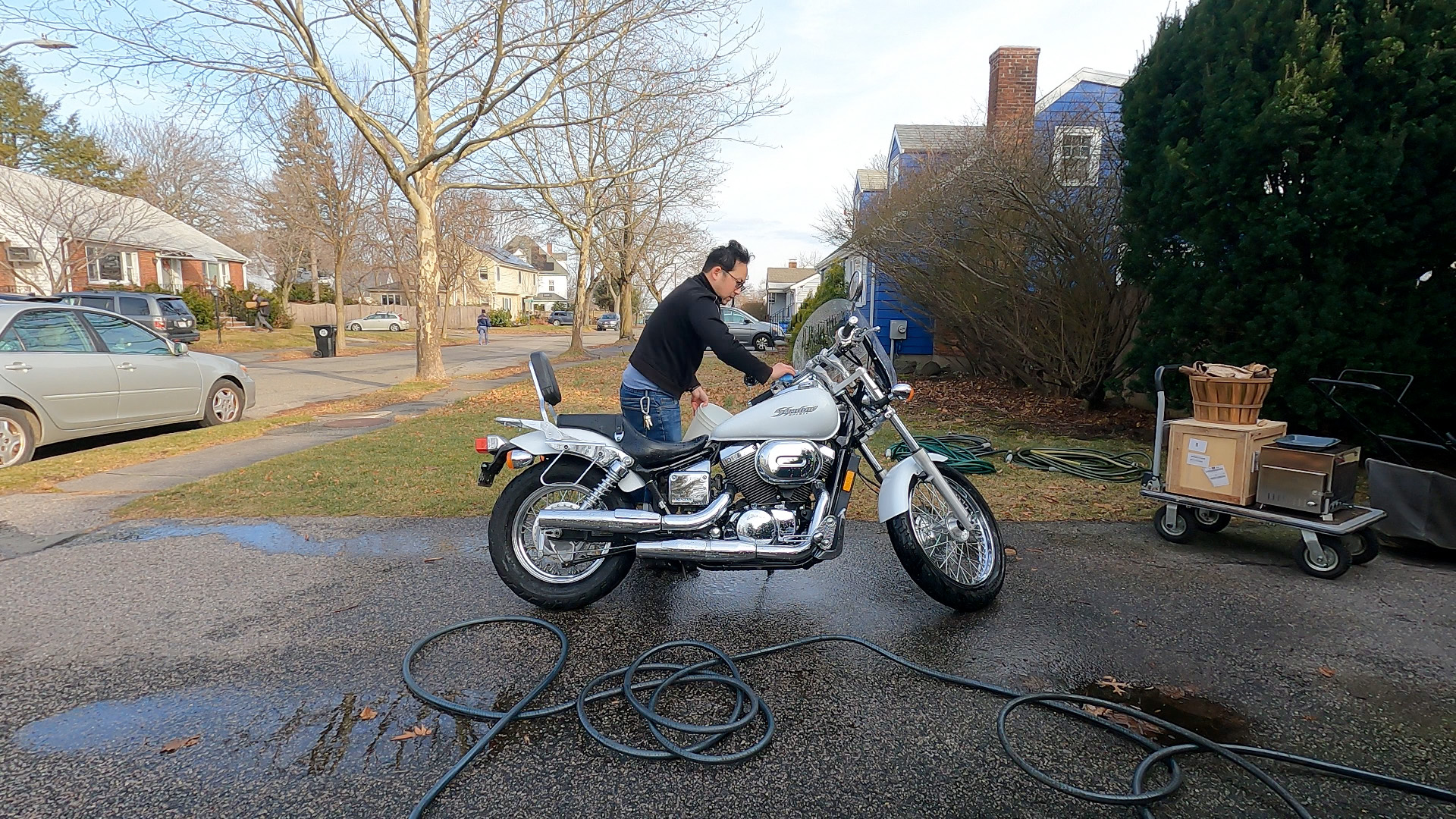the first snowstorm of the winter is when i put my motorcycle away. i usually like to give it a wash before storing it in the garage, but sometimes it's not possible, especially in the wintertime, with freezing temperatures and whatnot. today wasn't too bad, temperature in the upper 30's. cold, but not freezing. i gave the motorcycle a quick wash. my hands were freezing afterwards, didn't realize just how cold it was.