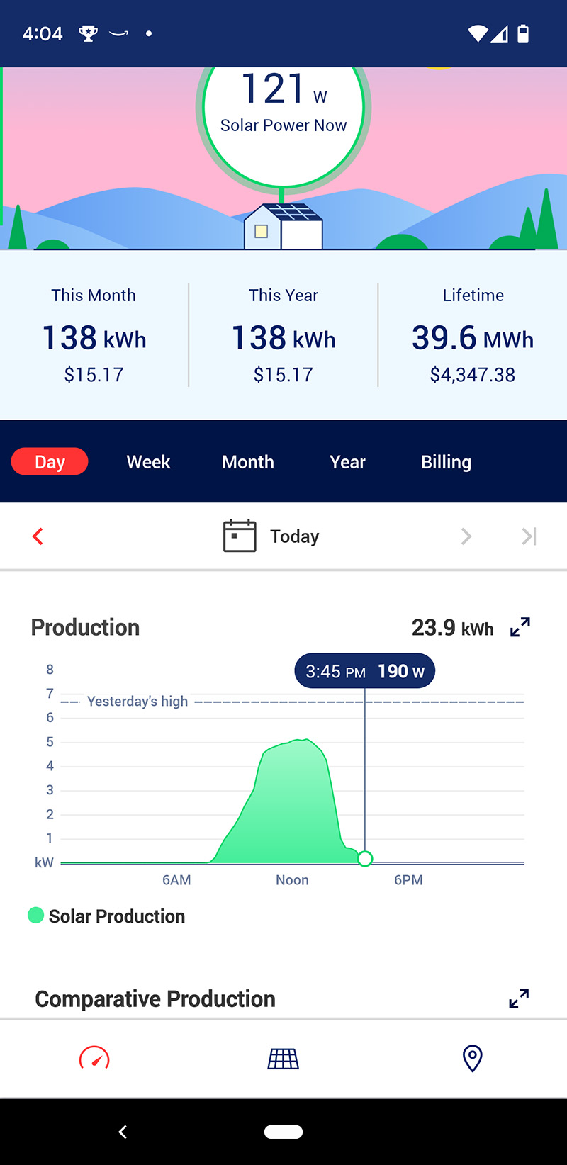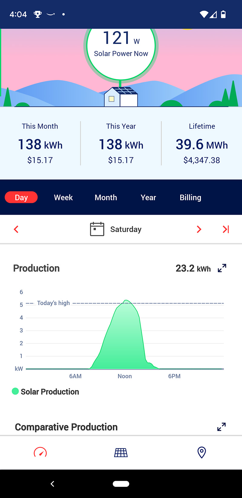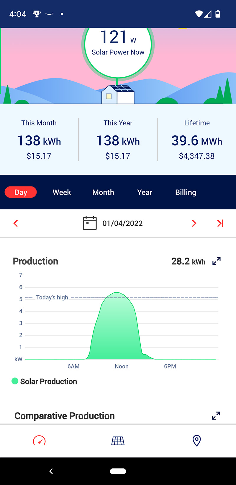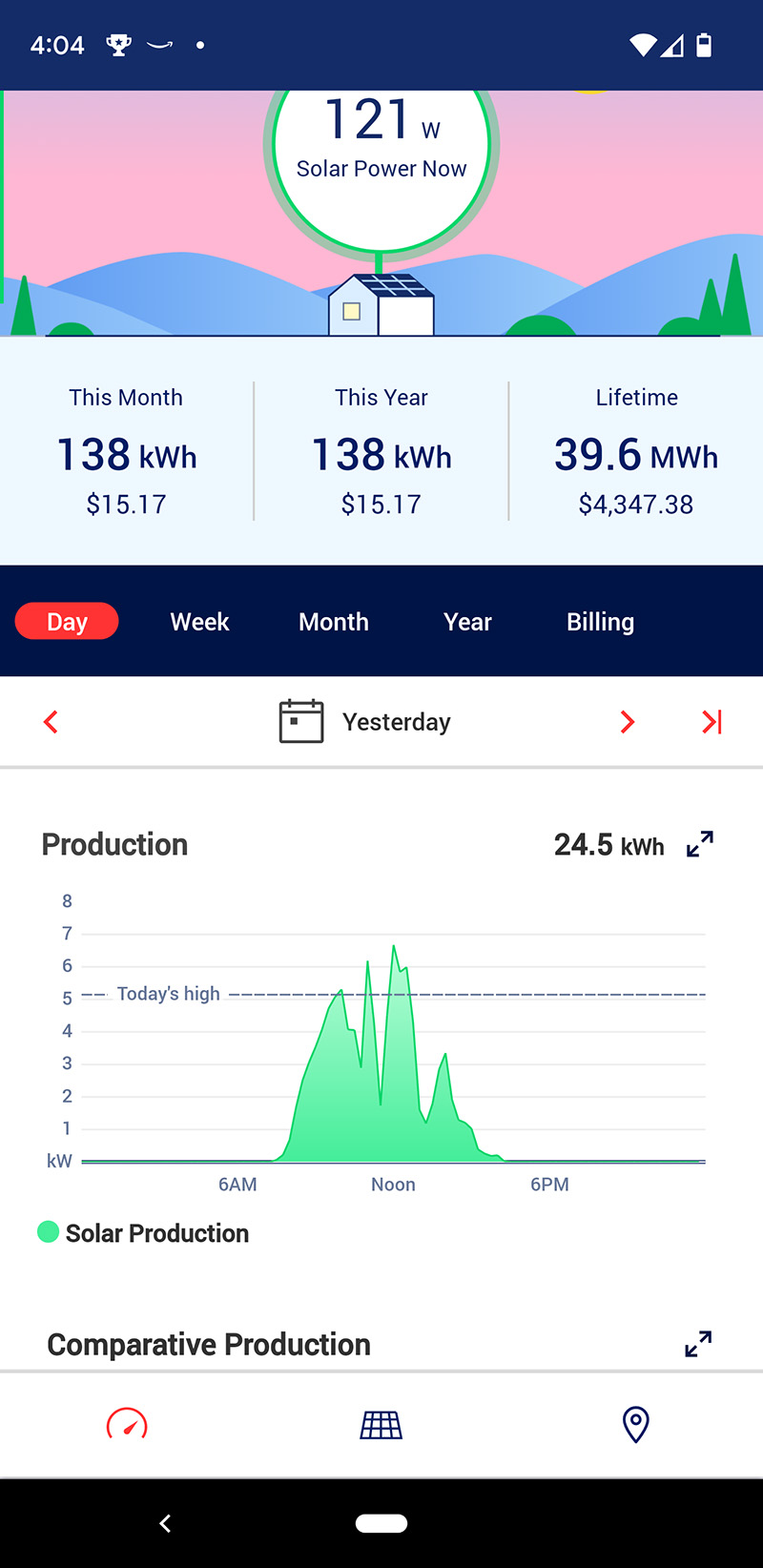 i thought with the weather so cold yet sunny, the solar panels would perform at peak efficiency. that however would not be the case. we had our best production last tuesday, the production graph a near perfect bell curve. the graph line for today had a more rigid shape, with abrupt cuts. worse, we made more electricity yesterday, even though it was an intermittently cloudy day. my personal theory is some snow had changed the shape of our backyard trees, causing them to partially block the sun in the morning. that wouldn't explain why our highest production wasn't able to match tuesday's or even beat it.